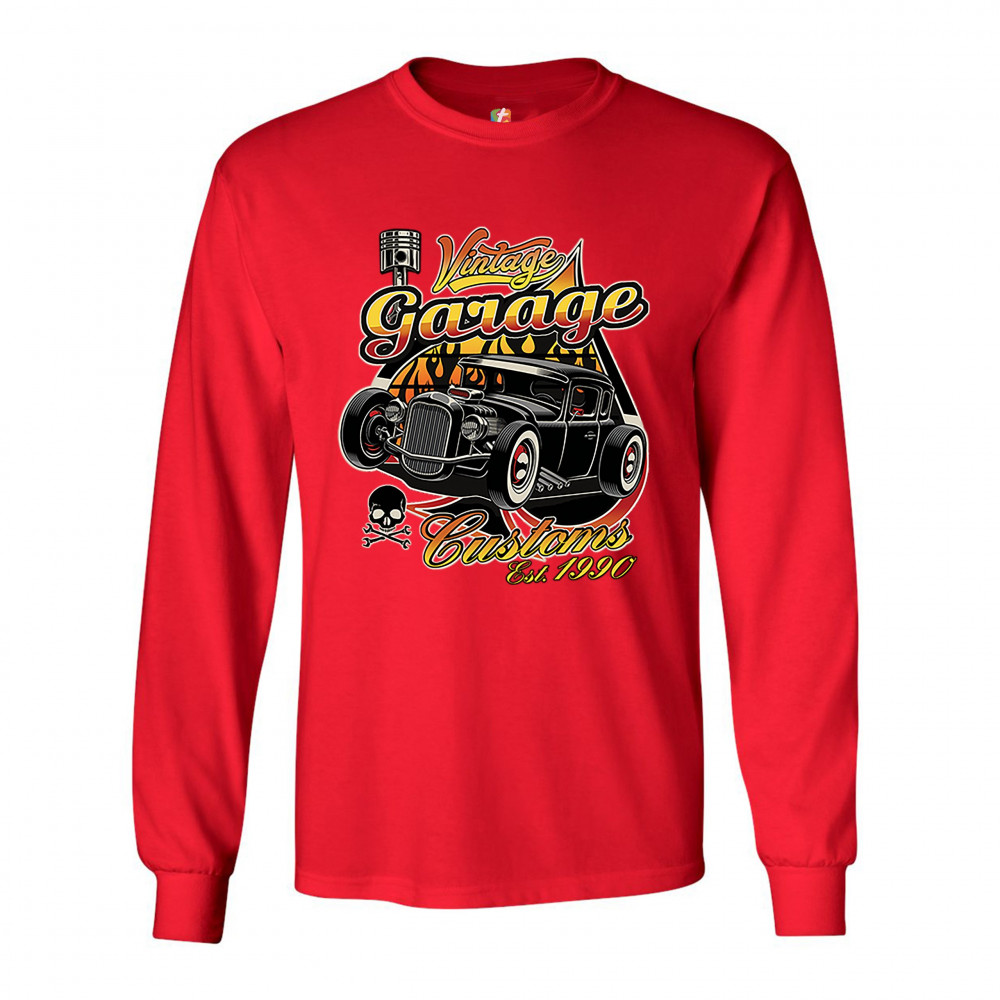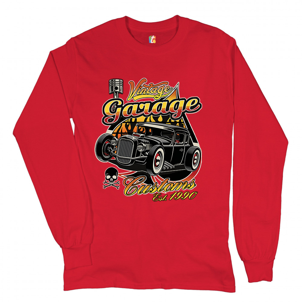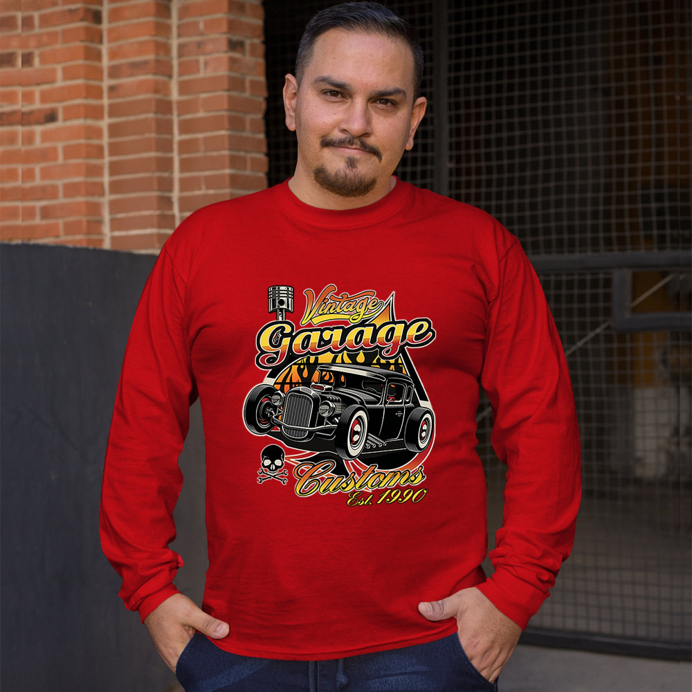 A print featuring a lowrider hot rod, a small skull with crossed wrenches instead of bones, a piston and an ace of spades in the background. The orint says: "Vintage Garage Customs Est. 1990". A great choice for a fan of customized American classic cars a