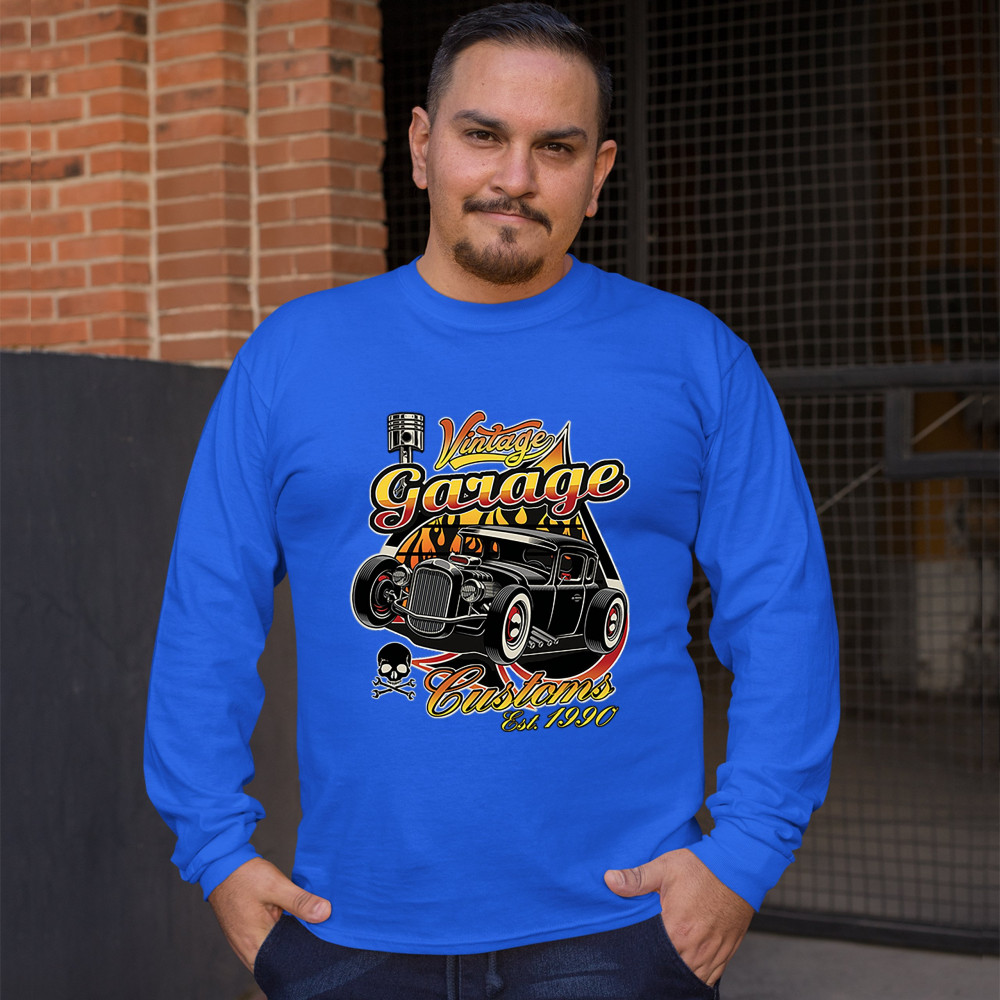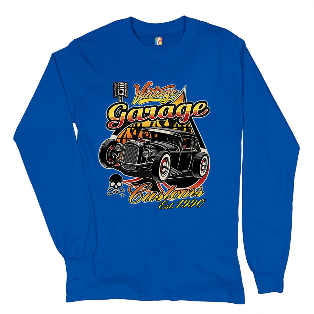 VINTAGE GARAGE CUSTOMS EST. 1990 long sleeve t-shirt old school retro hot rod royal blue