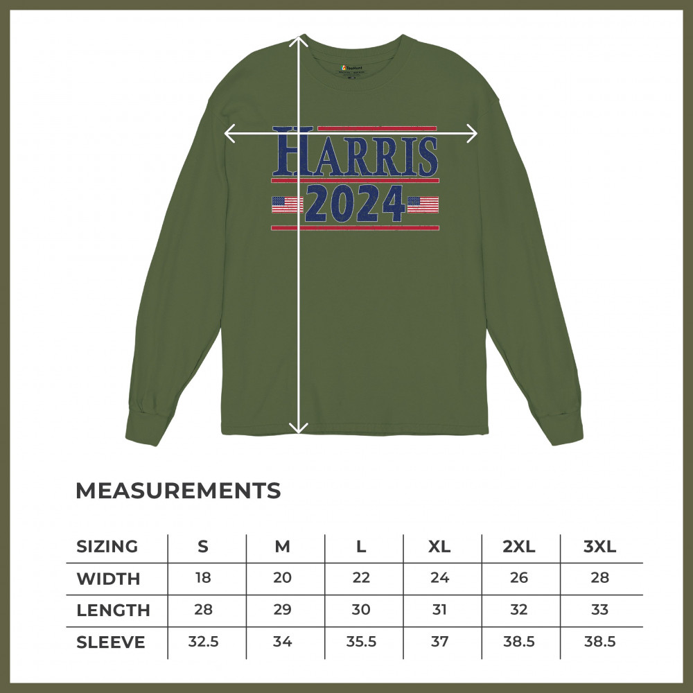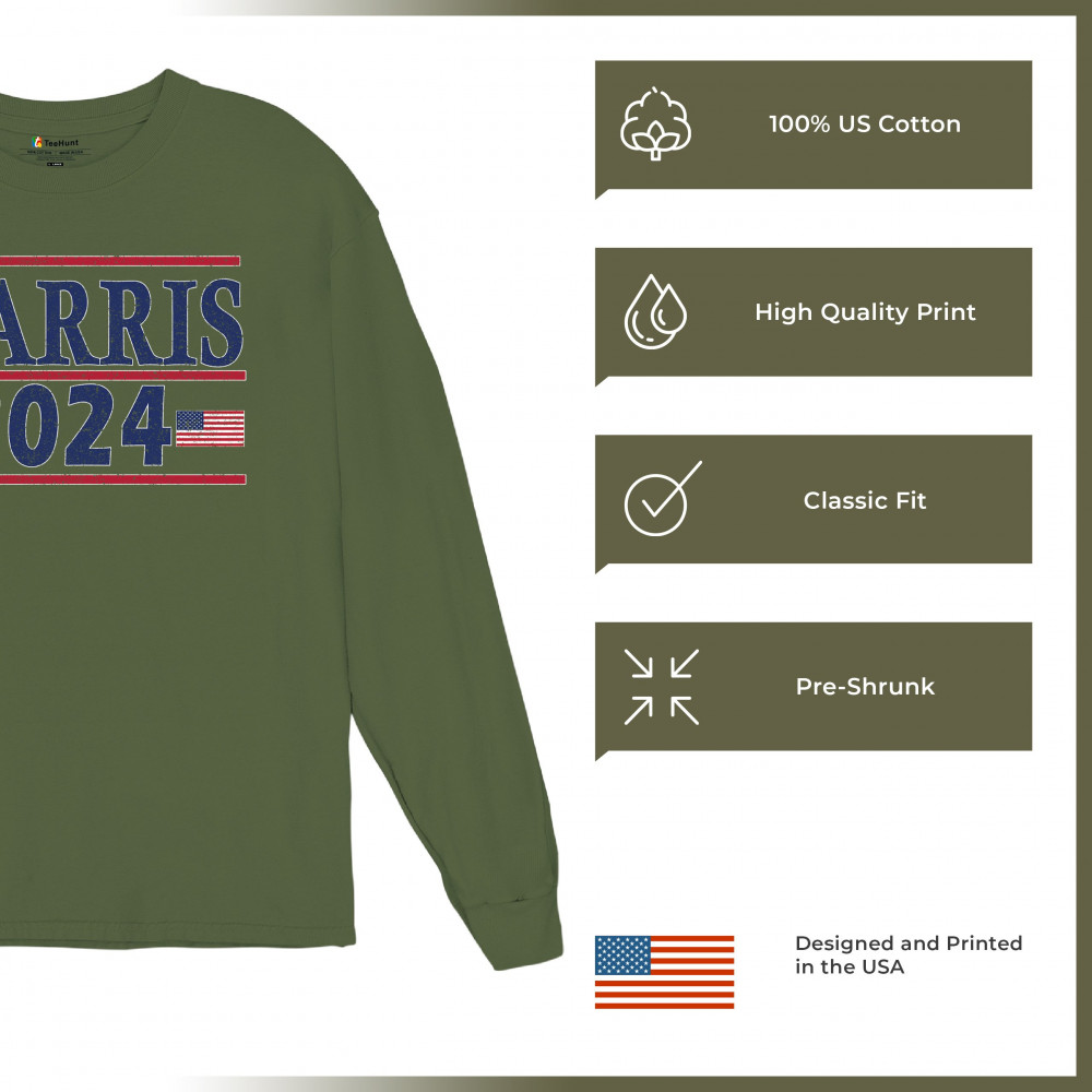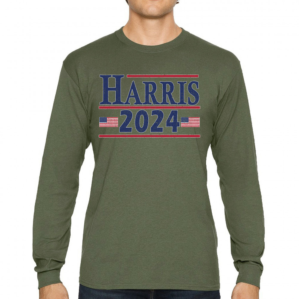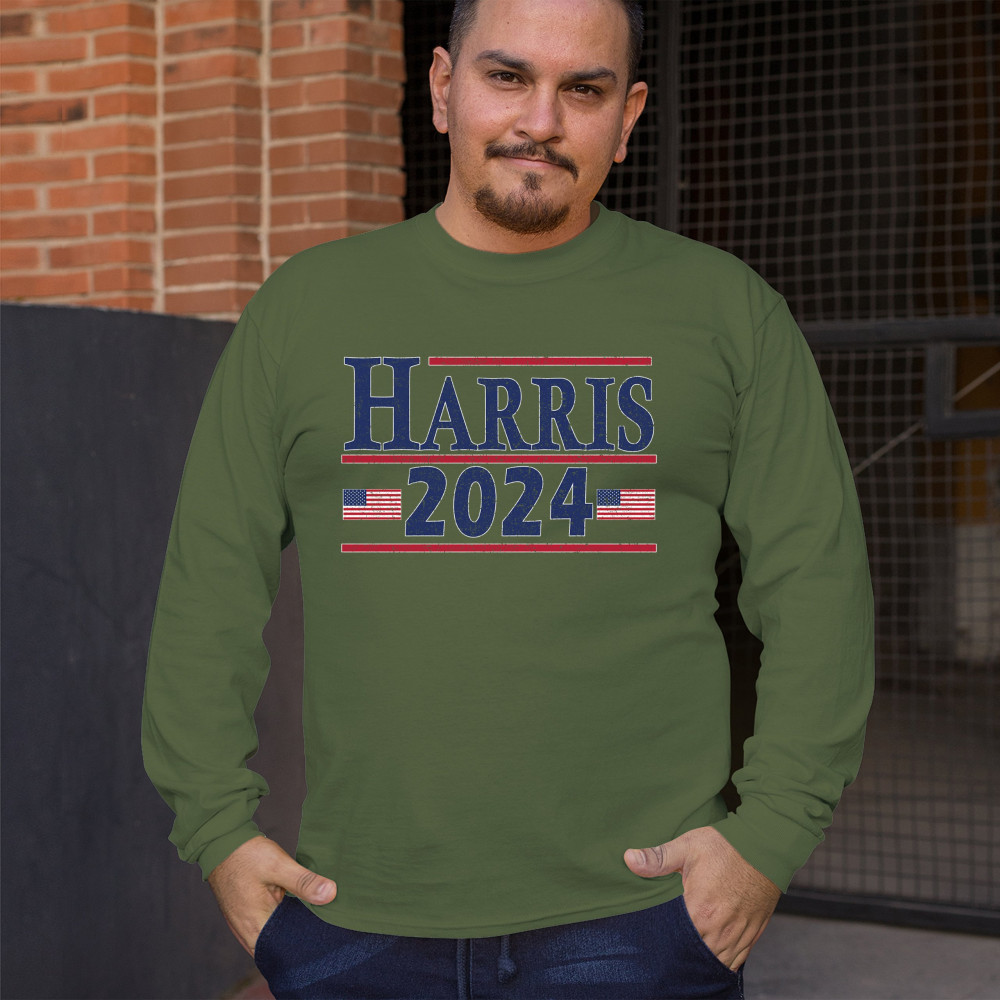 Show your support for Kamala Harris with this bold "Harris 2024" t-shirt, featuring American flags. Perfect for rallies and events. Join the movement today!