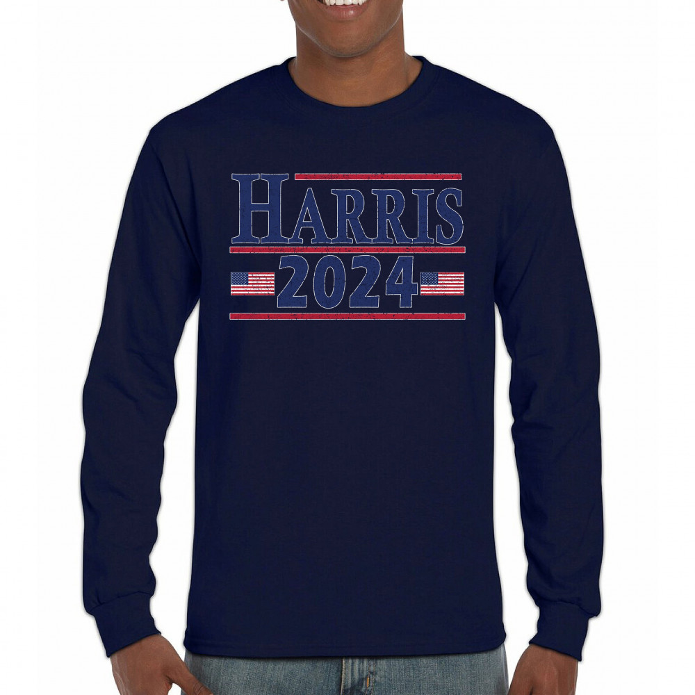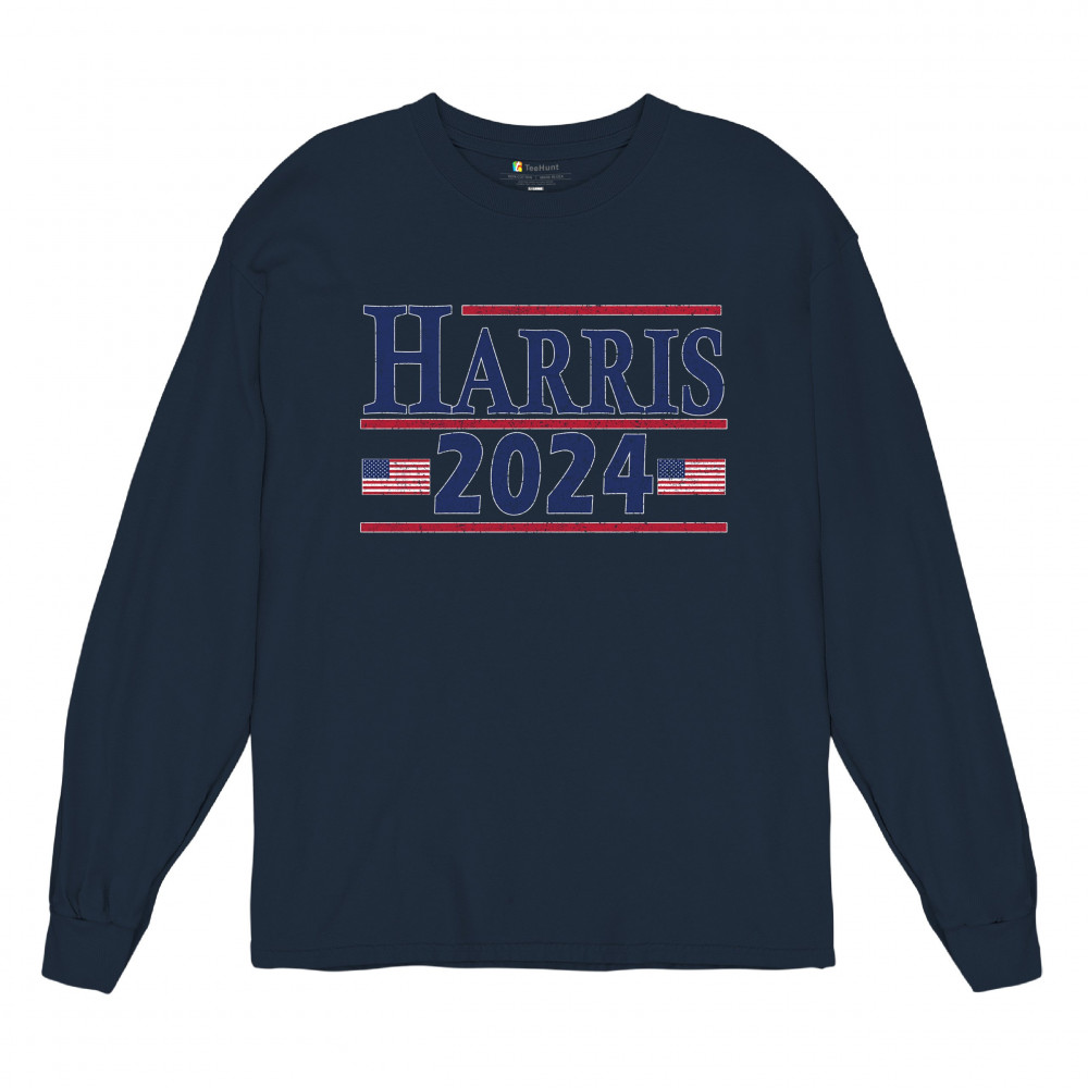 Show your support for Kamala Harris with this bold "Harris 2024" t-shirt, featuring American flags. Perfect for rallies and events. Join the movement today!
