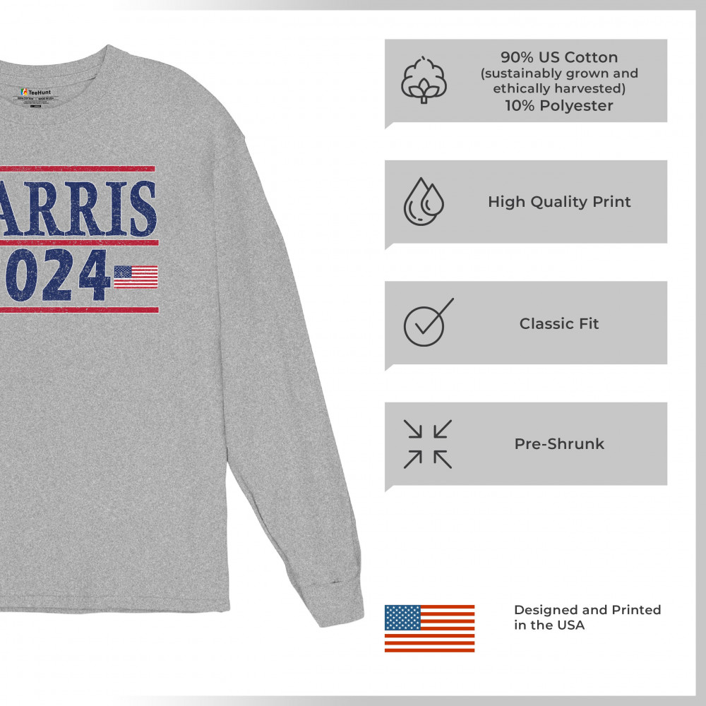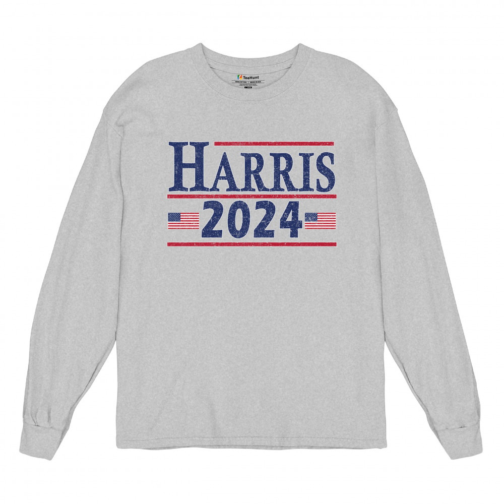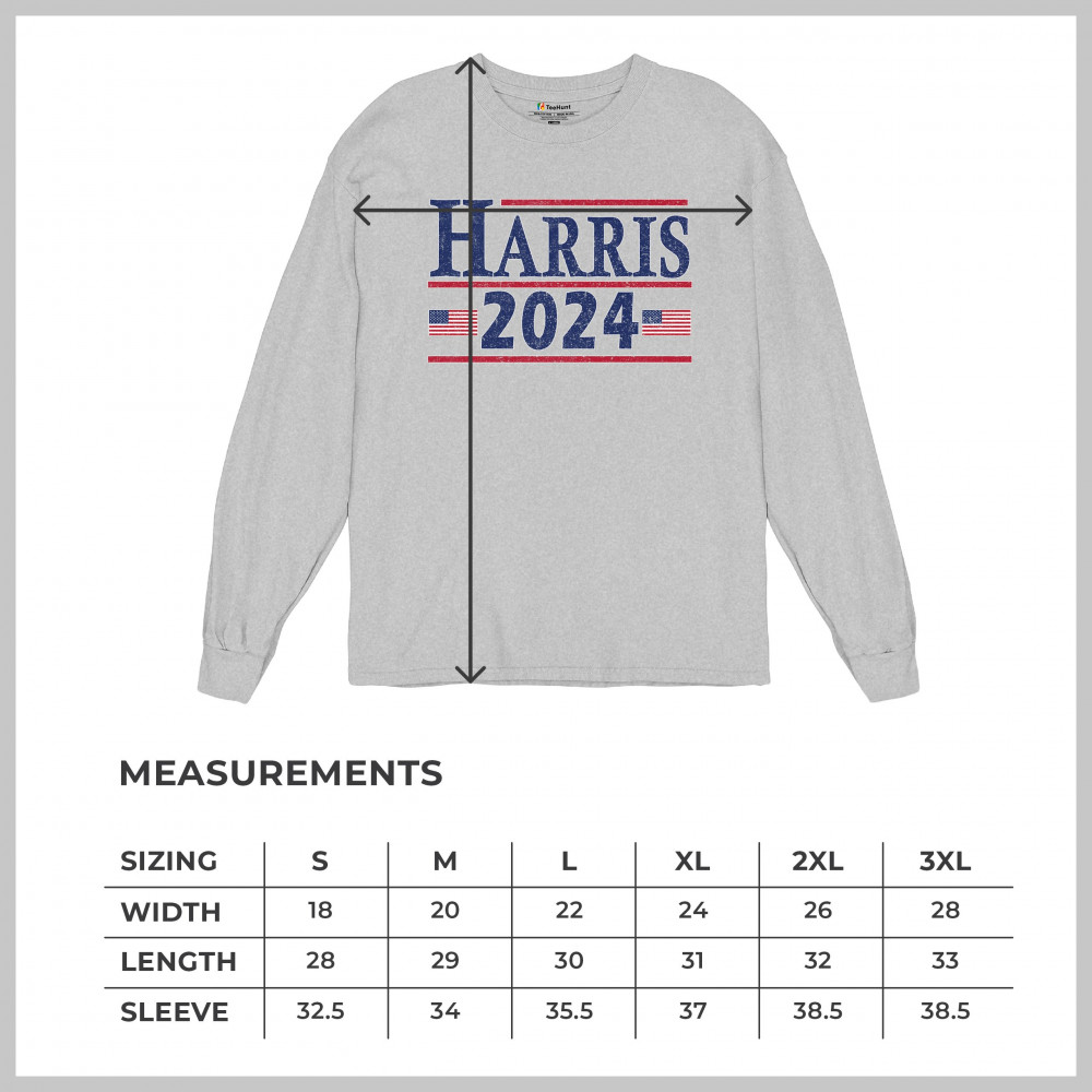 Show your support for Kamala Harris with this bold "Harris 2024" t-shirt, featuring American flags. Perfect for rallies and events. Join the movement today!