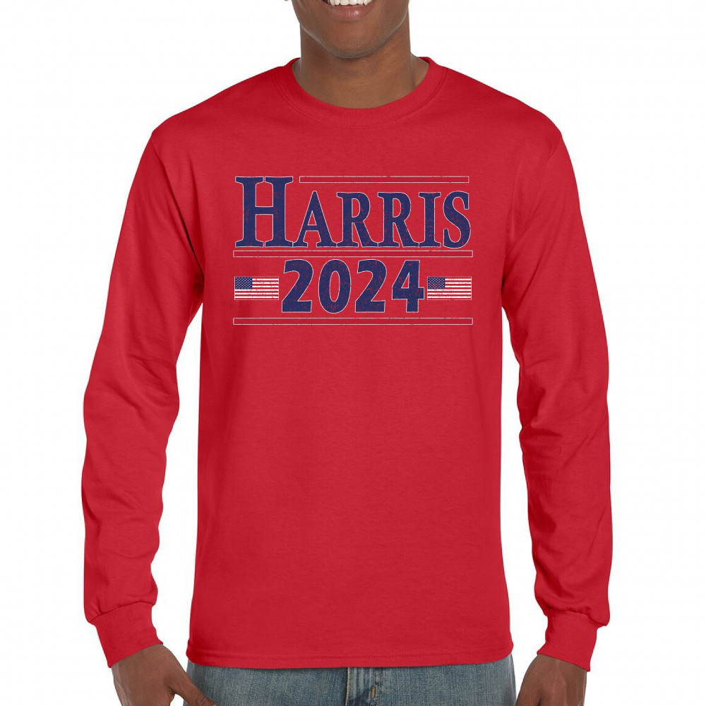 Show your support for Kamala Harris with this bold "Harris 2024" t-shirt, featuring American flags. Perfect for rallies and events. Join the movement today!