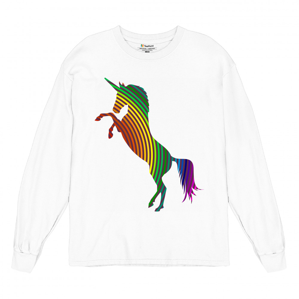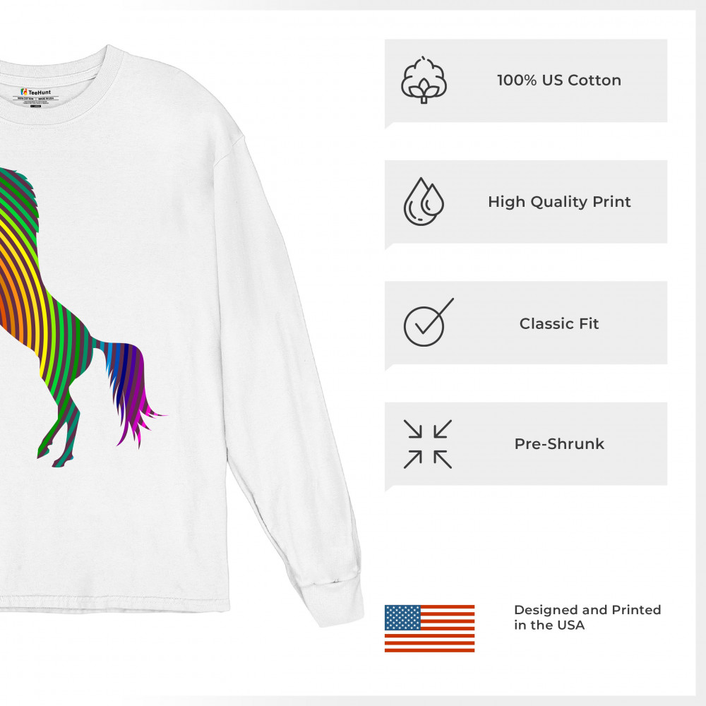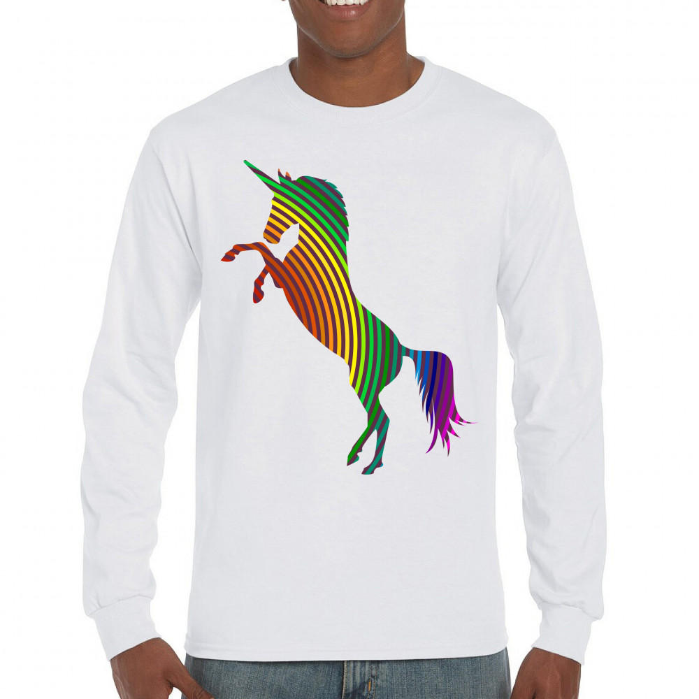 The print depicts a strong rearing unicorn. The unicorn is painted in vivid rainbow-stripe colors. This can symbolize a strong spirit of the sexual and gender minority.