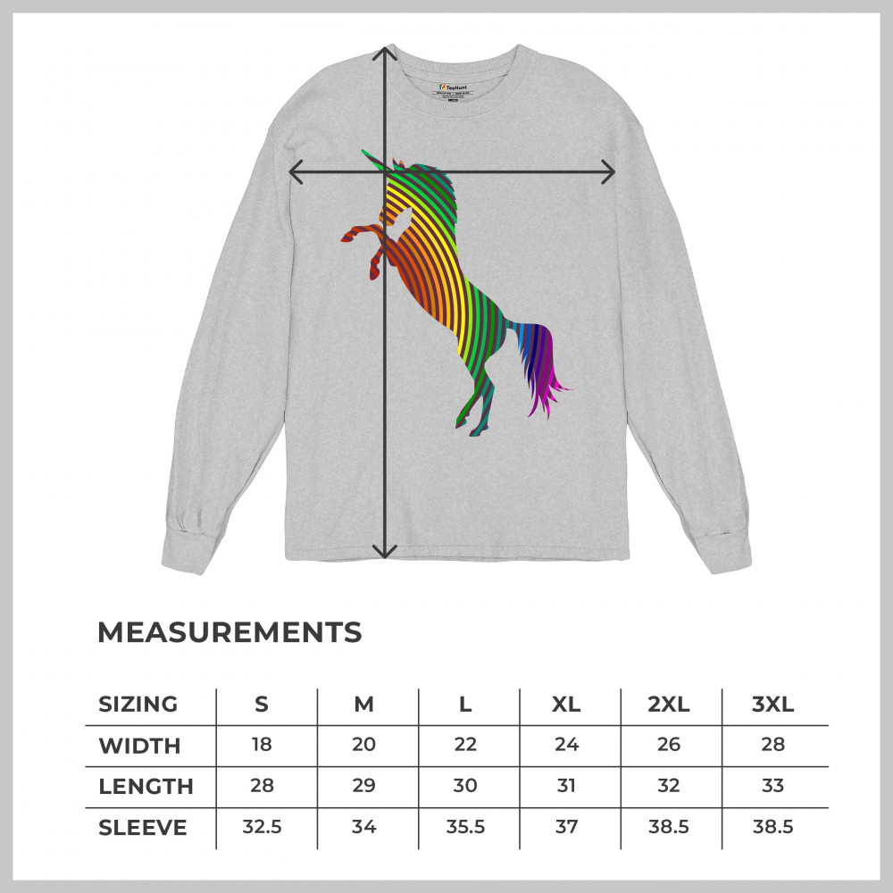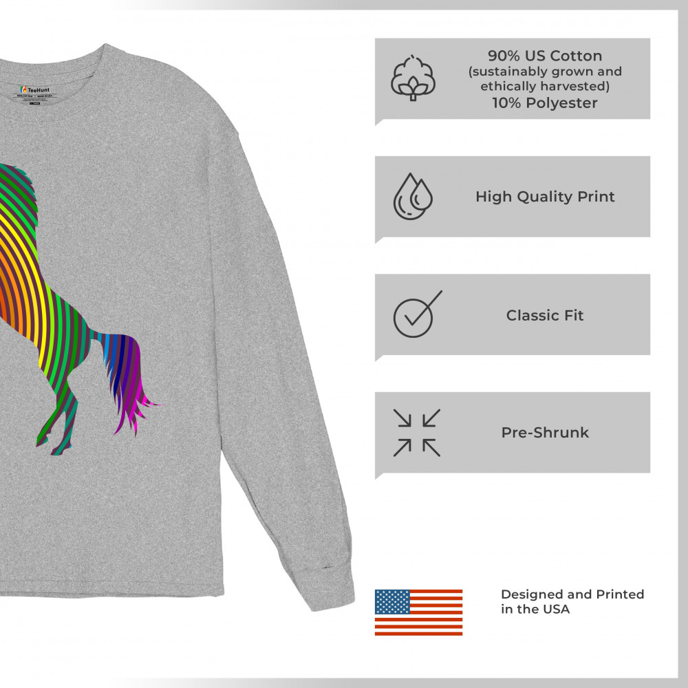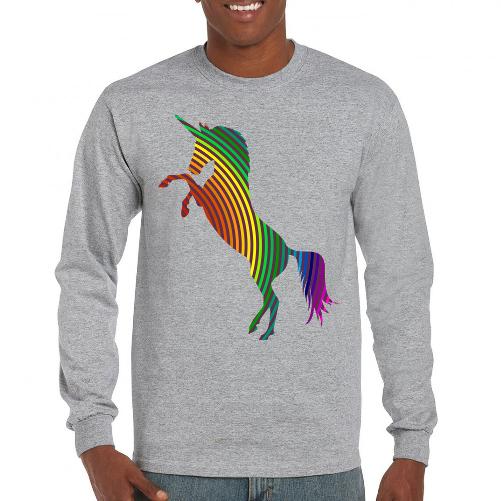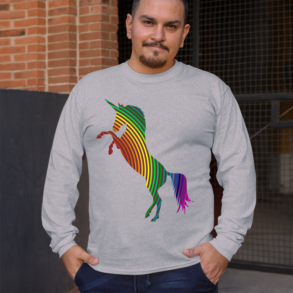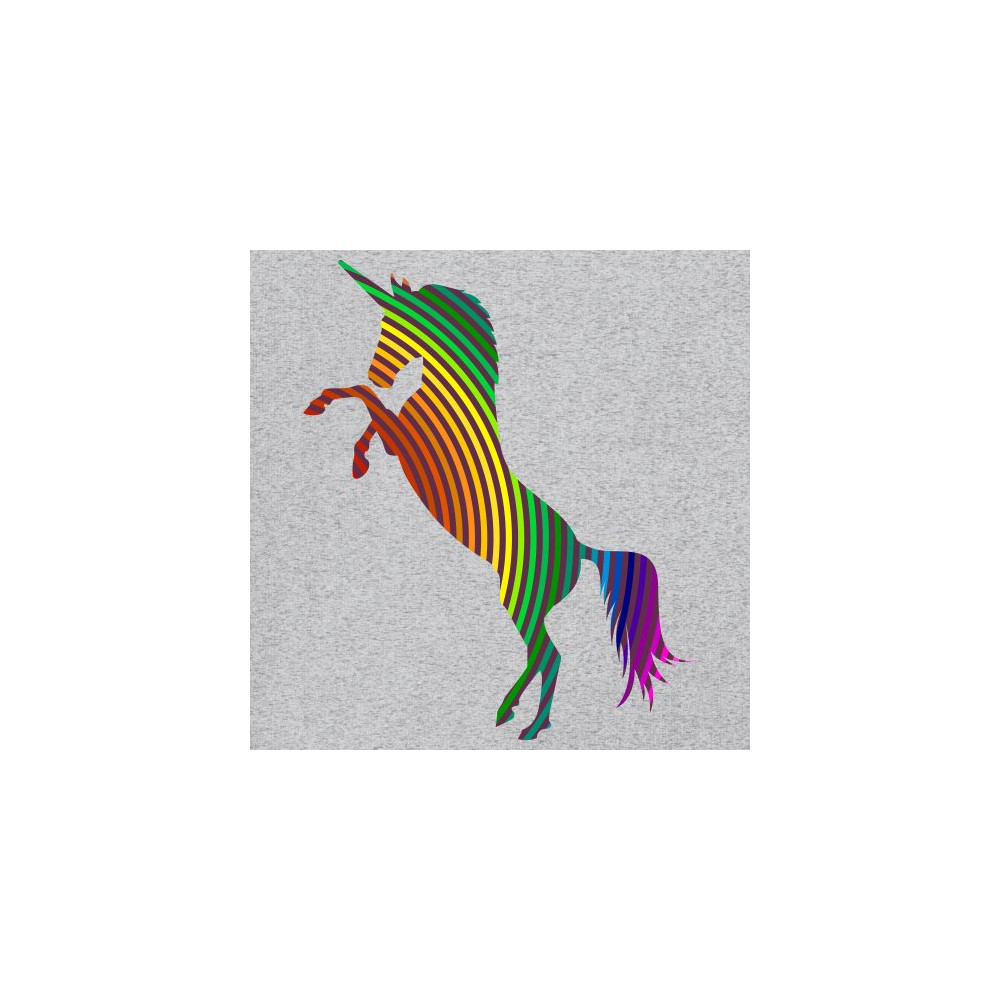 The print depicts a strong rearing unicorn. The unicorn is painted in vivid rainbow-stripe colors. This can symbolize a strong spirit of the sexual and gender minority.
