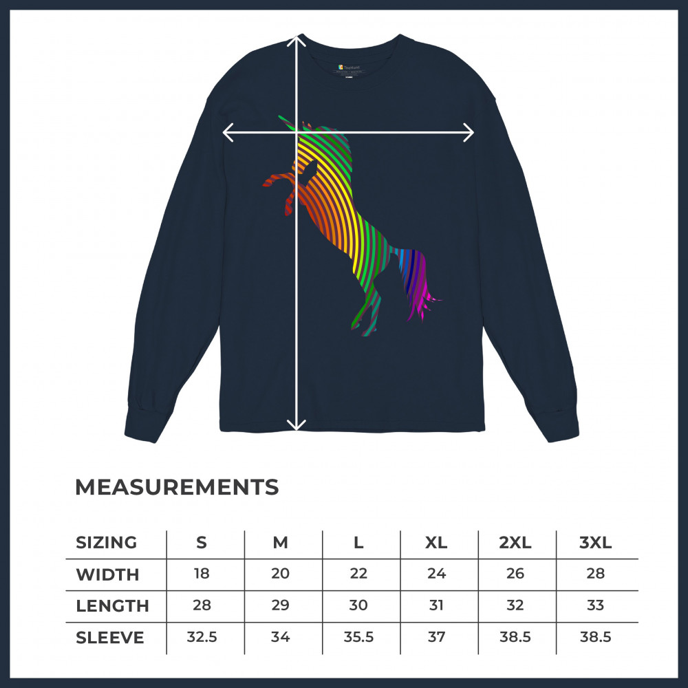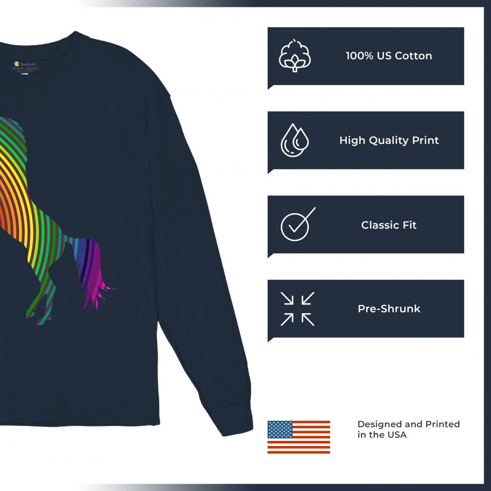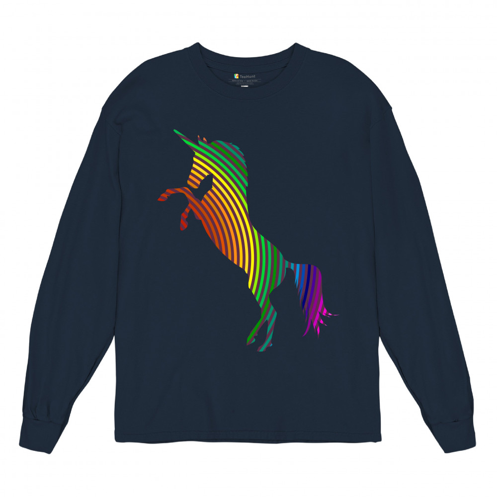 The print depicts a strong rearing unicorn. The unicorn is painted in vivid rainbow-stripe colors. This can symbolize a strong spirit of the sexual and gender minority.