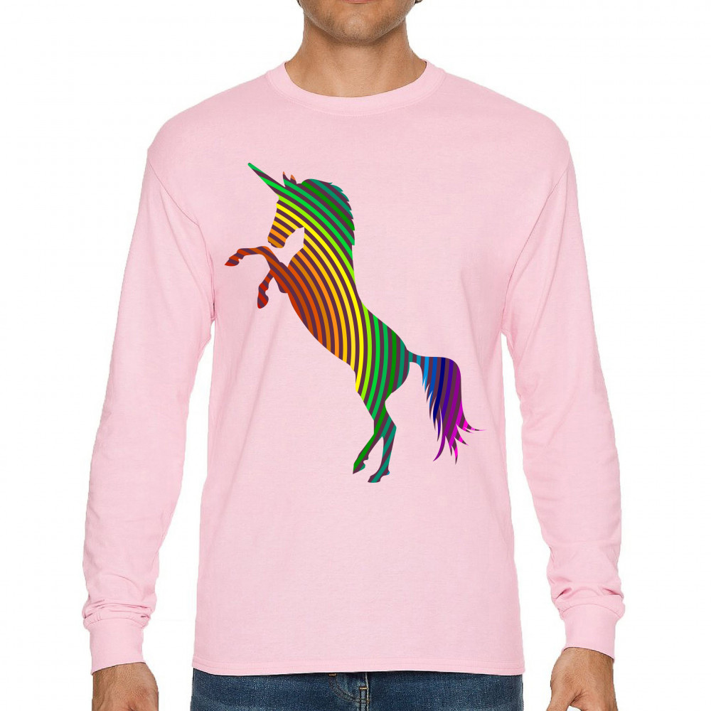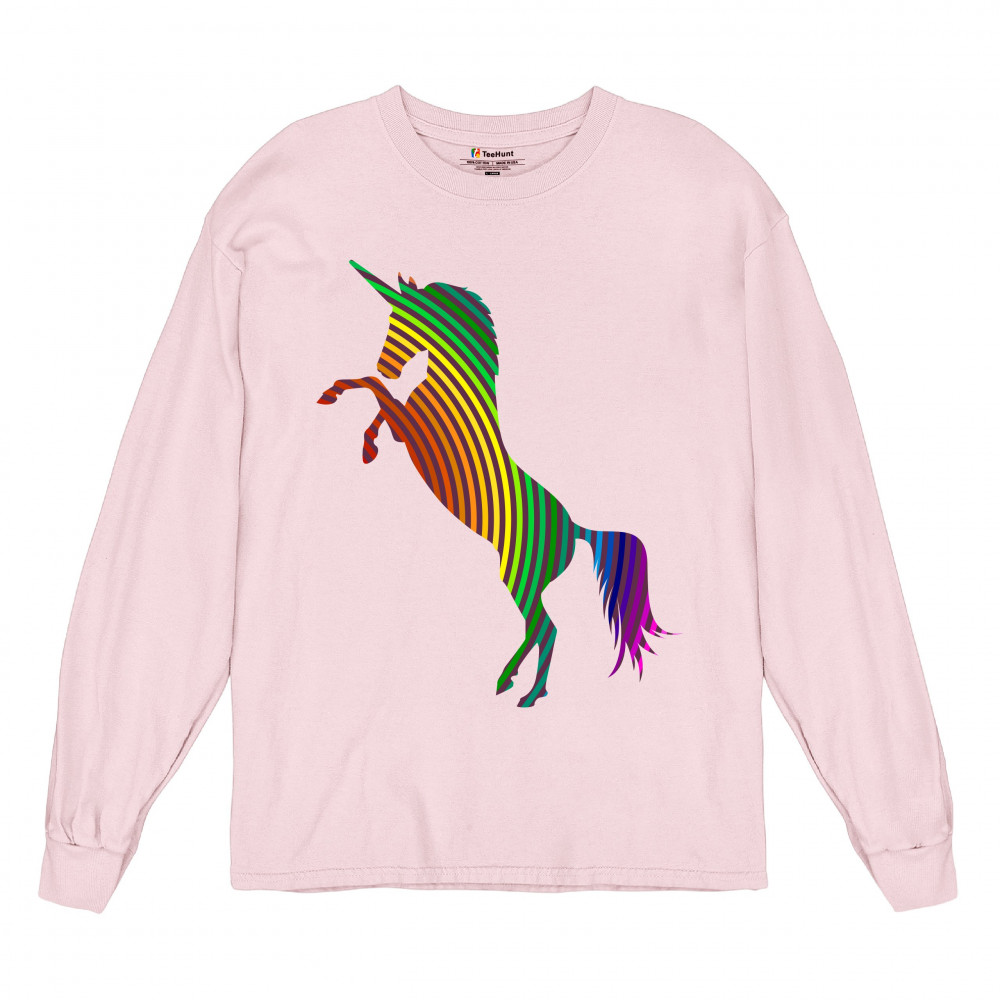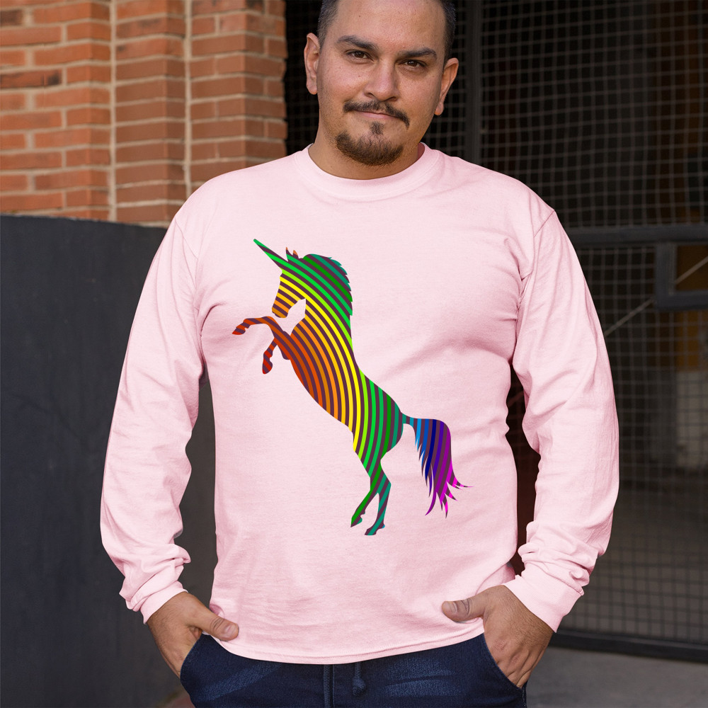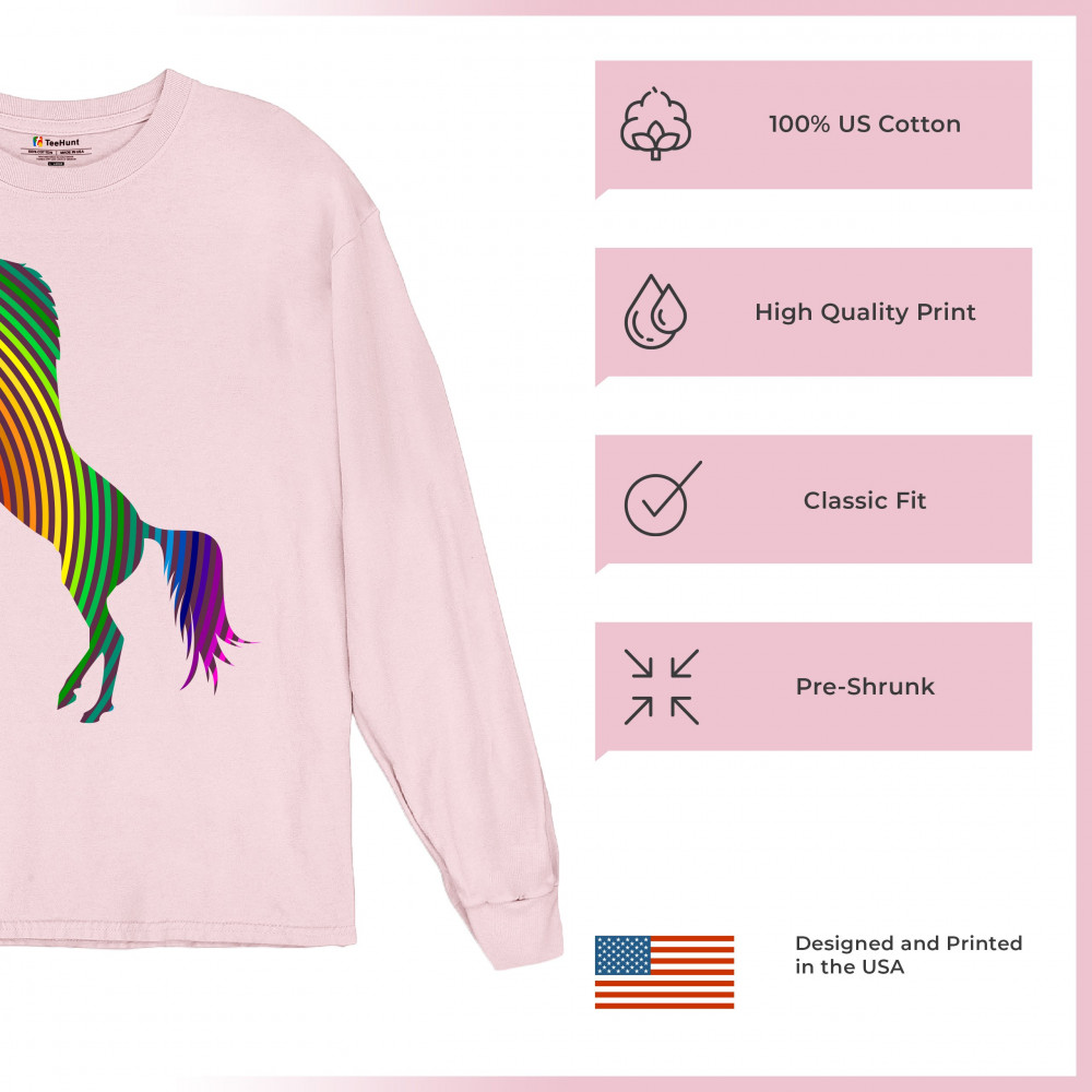 The print depicts a strong rearing unicorn. The unicorn is painted in vivid rainbow-stripe colors. This can symbolize a strong spirit of the sexual and gender minority.