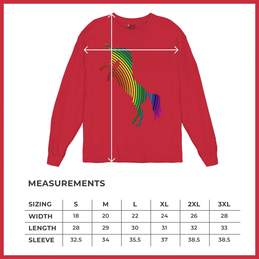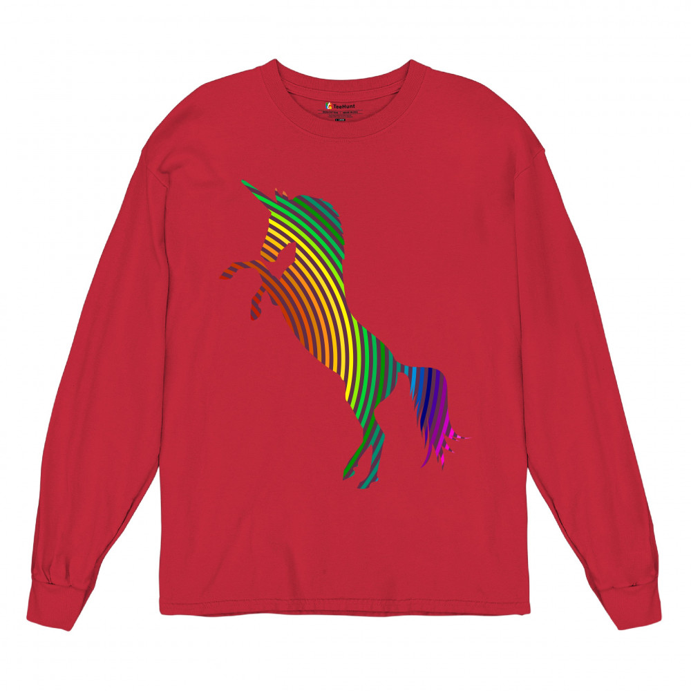 The print depicts a strong rearing unicorn. The unicorn is painted in vivid rainbow-stripe colors. This can symbolize a strong spirit of the sexual and gender minority.