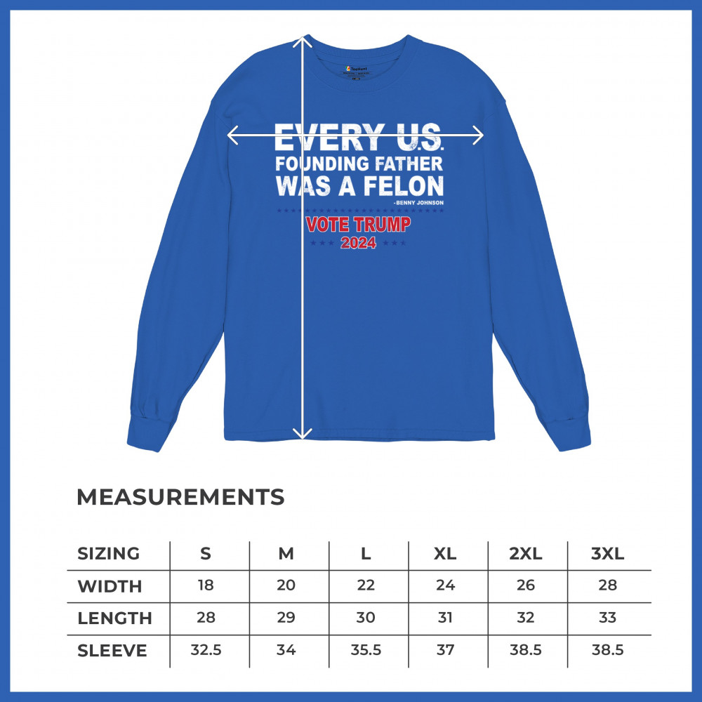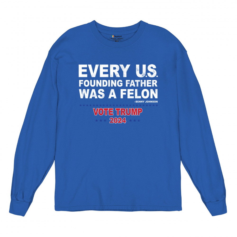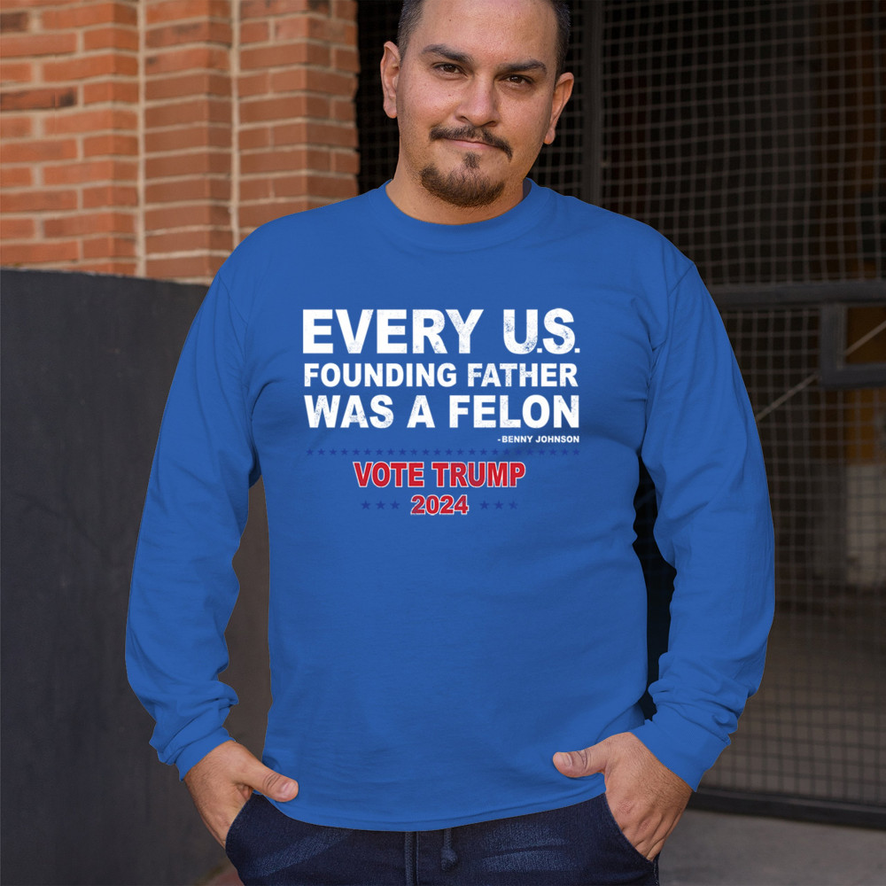 Show your support for Trump 2024 with a bold design quoting "Every U.S. founding father was a felon." Stand against political attacks and support an America-first vision.