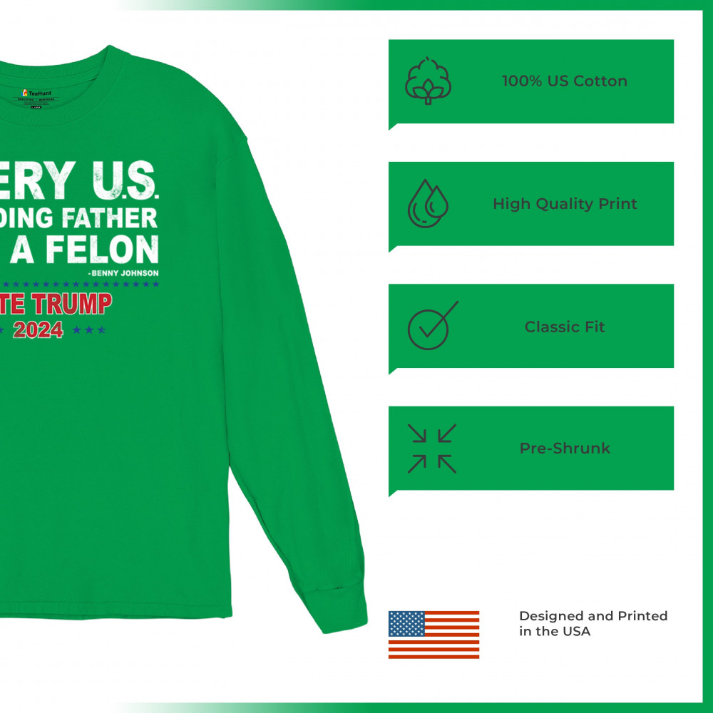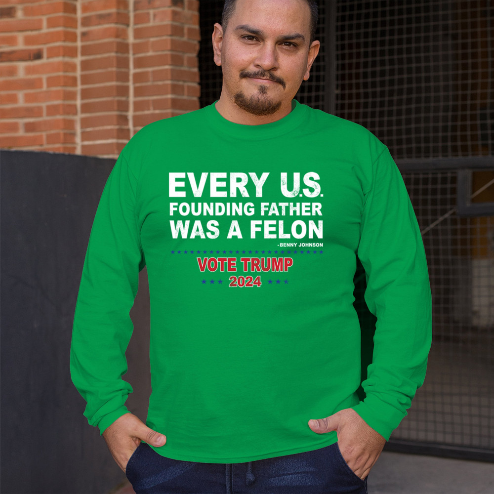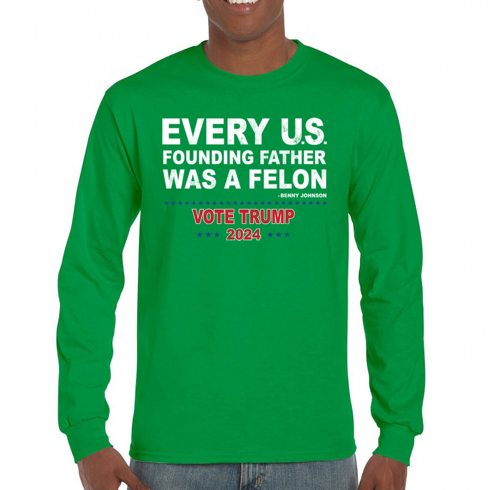 Show your support for Trump 2024 with a bold design quoting "Every U.S. founding father was a felon." Stand against political attacks and support an America-first vision.