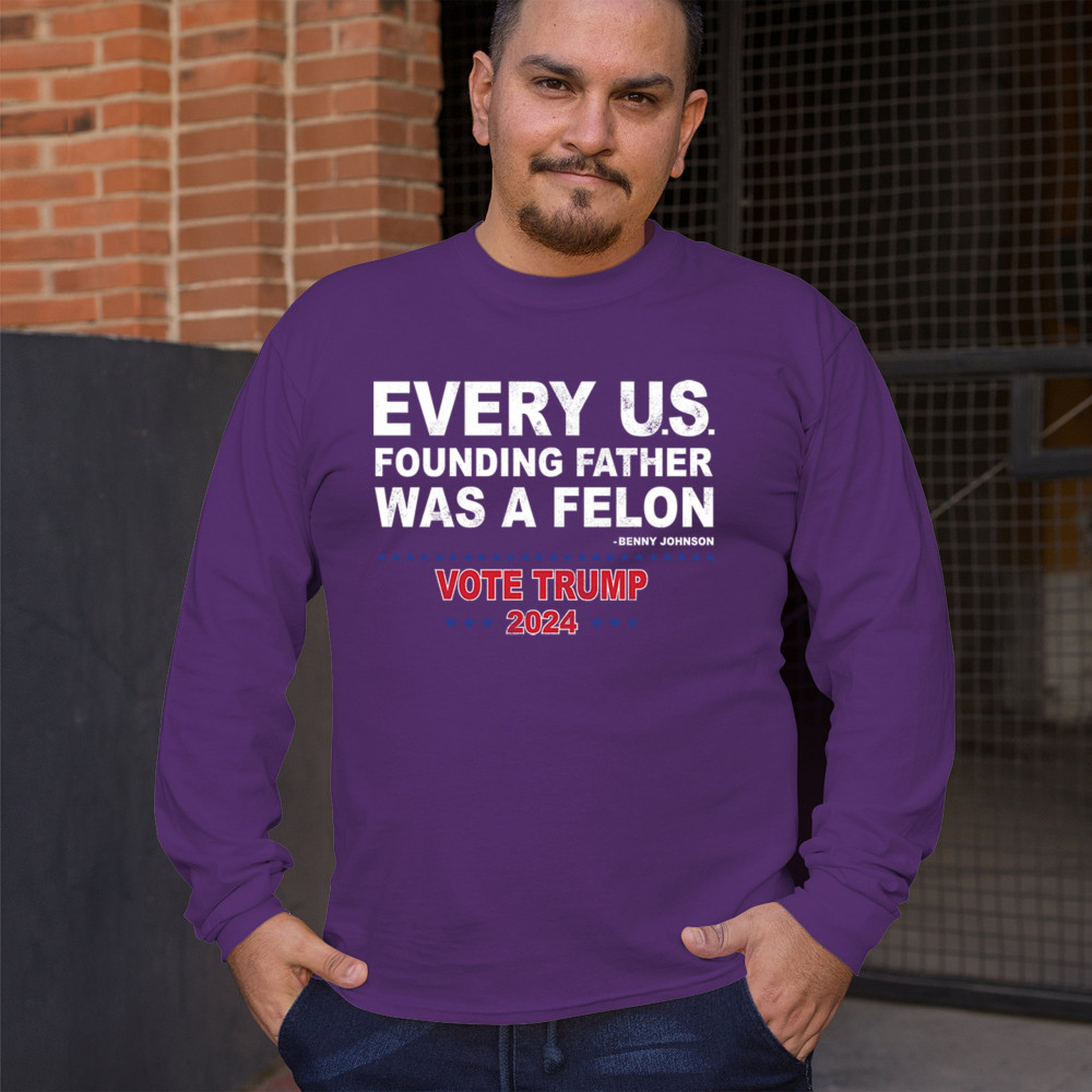 Show your support for Trump 2024 with a bold design quoting "Every U.S. founding father was a felon." Stand against political attacks and support an America-first vision.