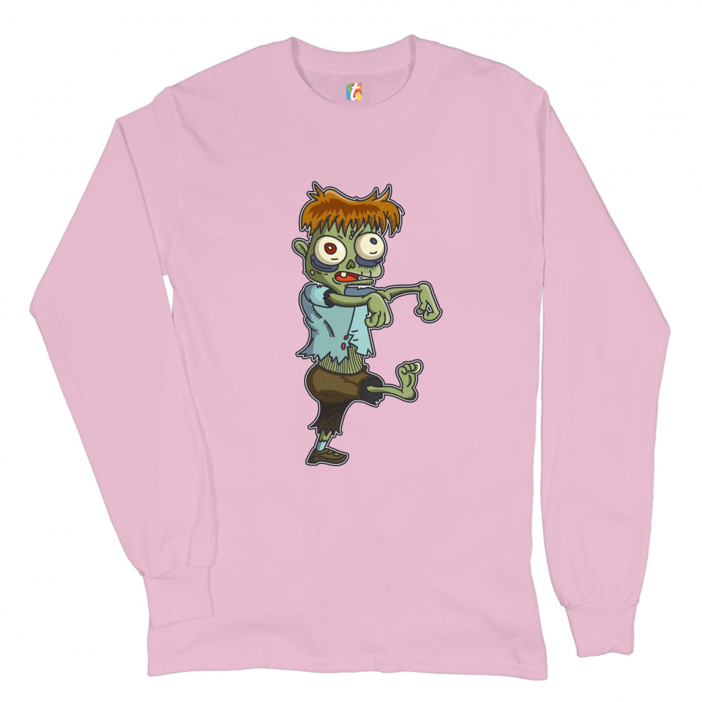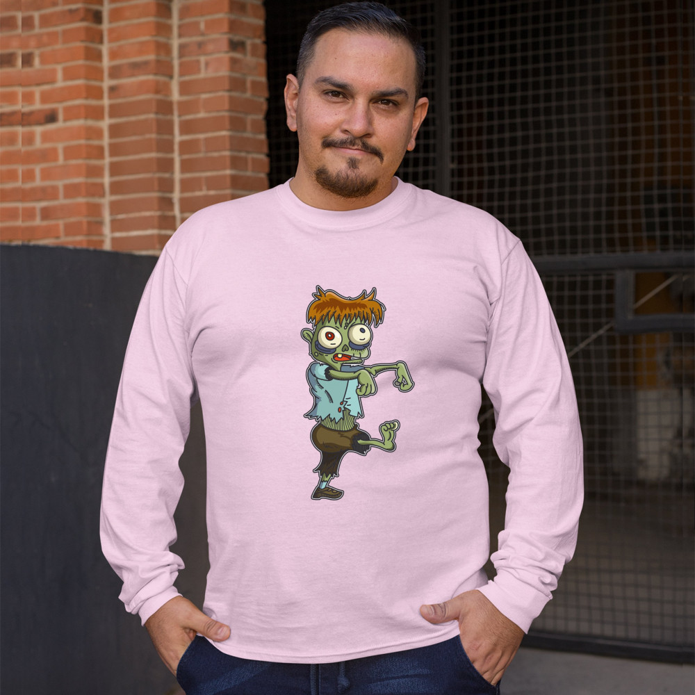 A print featuring a zombie, walking in a stereotypical movie fashion with the arms extended forward. The zombie has messy ginger hair and eyes popping out but he looks rather funny and non-threatening. A great choice for a person who is into horror movies