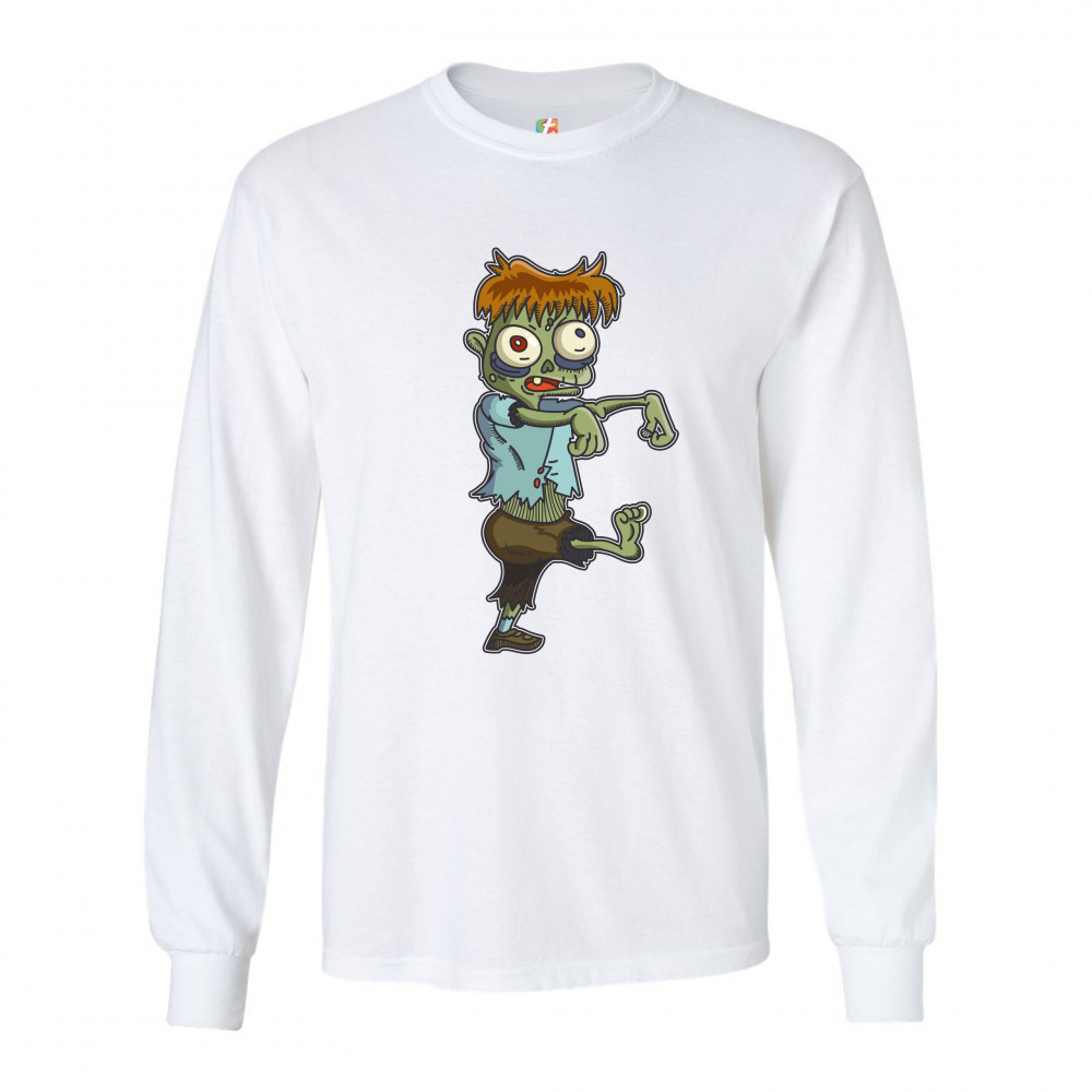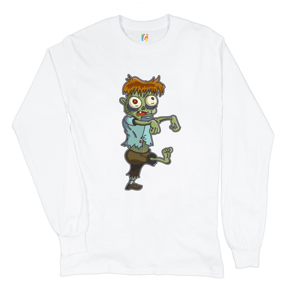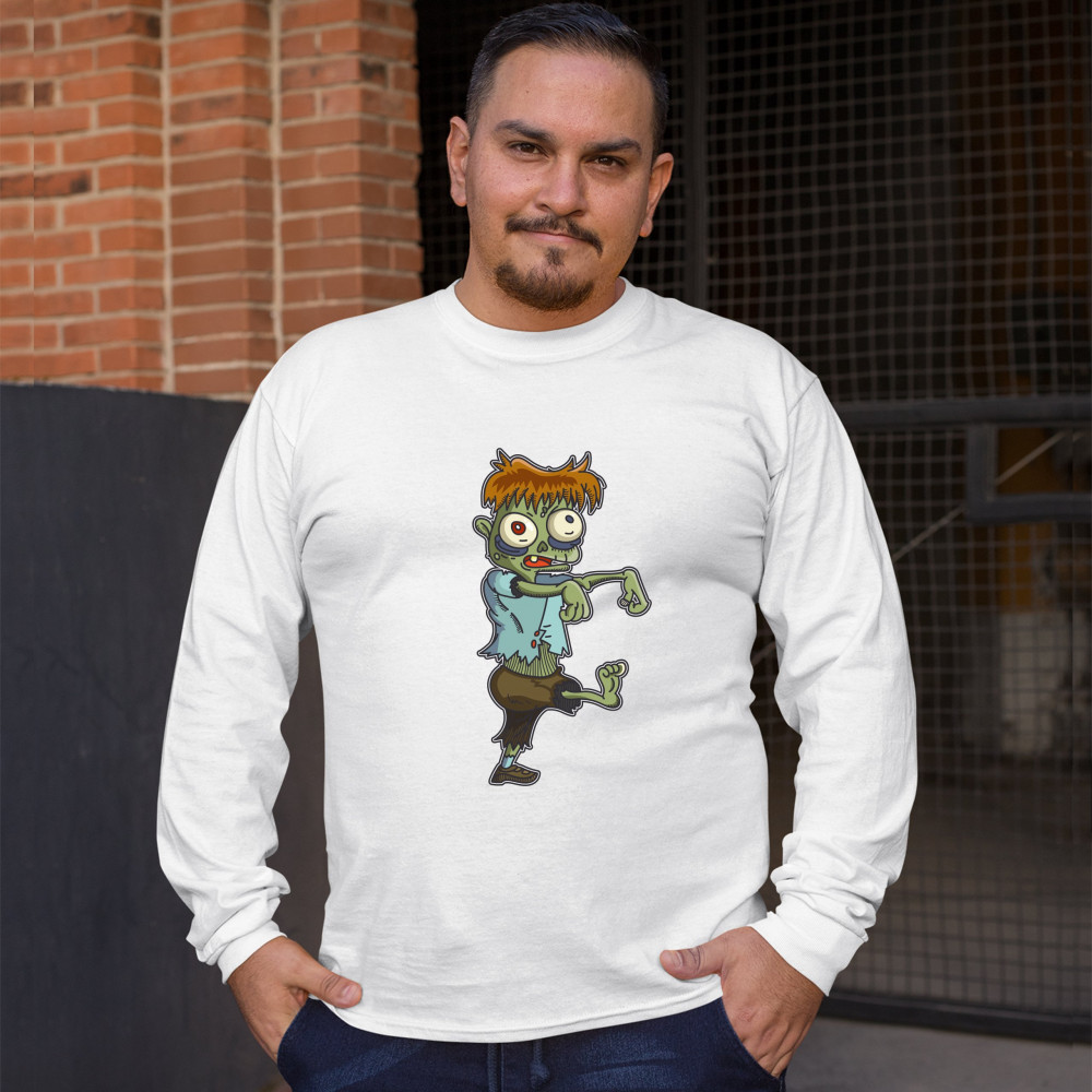 A print featuring a zombie, walking in a stereotypical movie fashion with the arms extended forward. The zombie has messy ginger hair and eyes popping out but he looks rather funny and non-threatening. A great choice for a person who is into horror movies