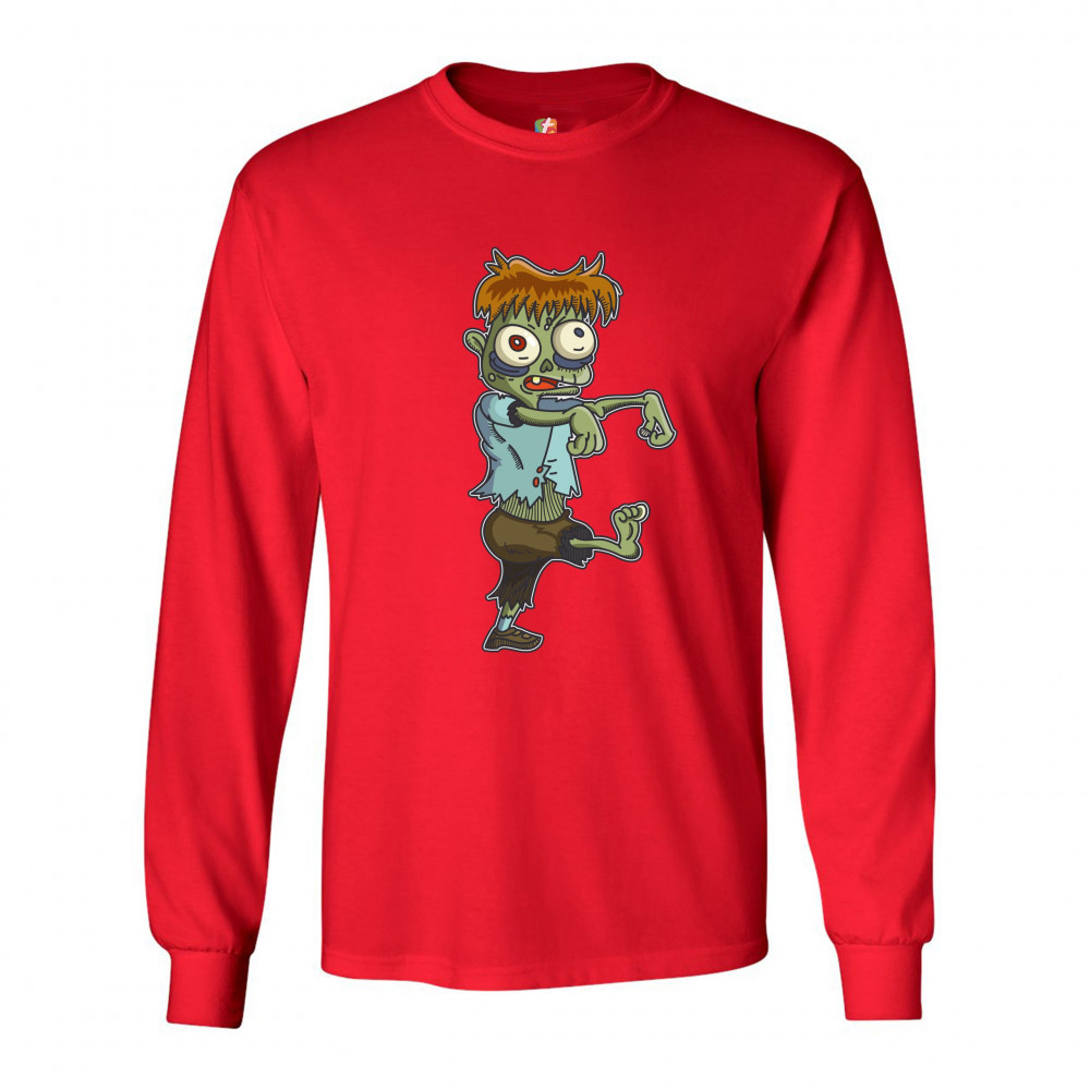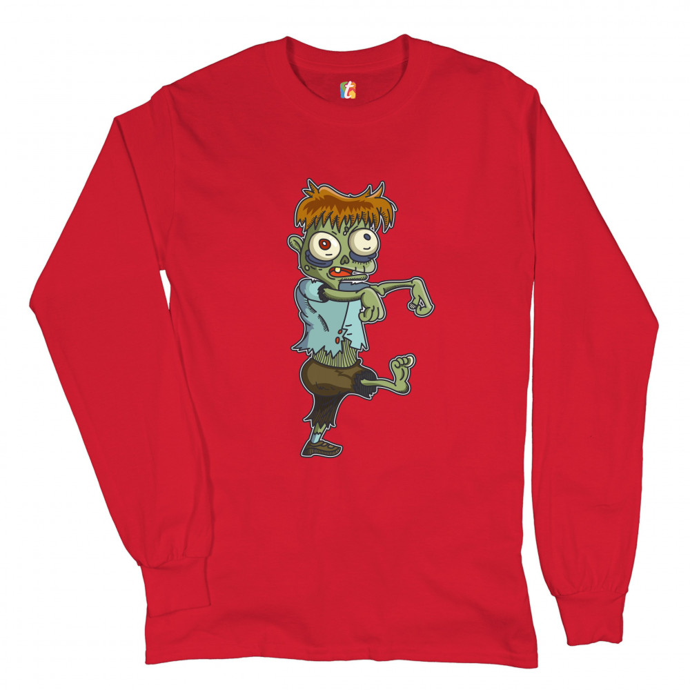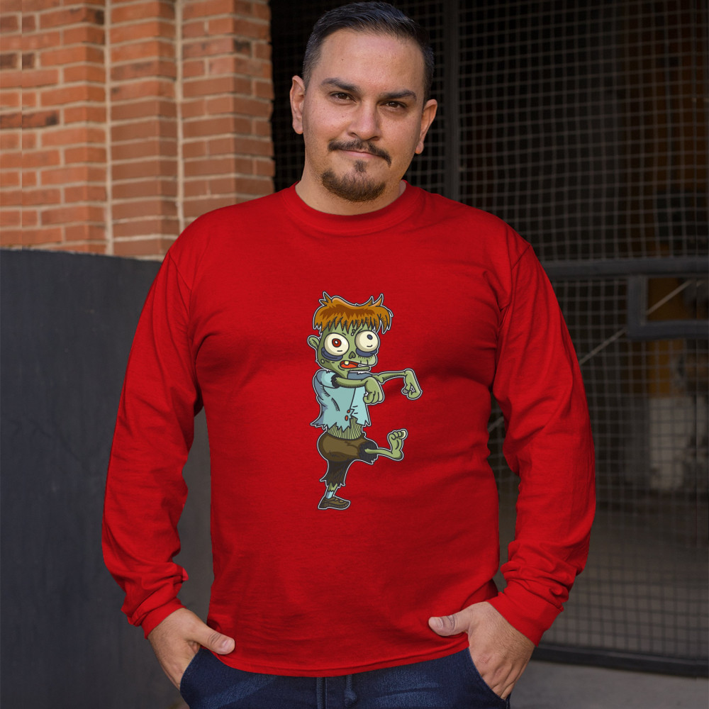 A print featuring a zombie, walking in a stereotypical movie fashion with the arms extended forward. The zombie has messy ginger hair and eyes popping out but he looks rather funny and non-threatening. A great choice for a person who is into horror movies