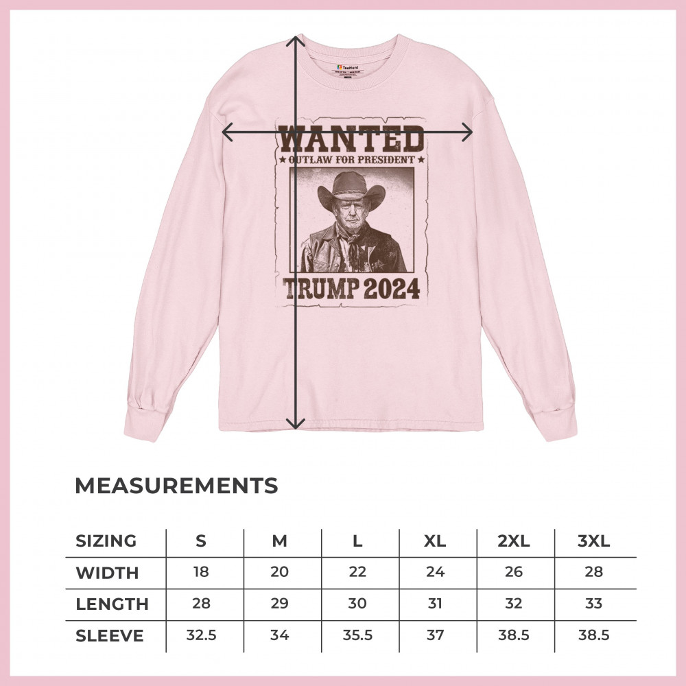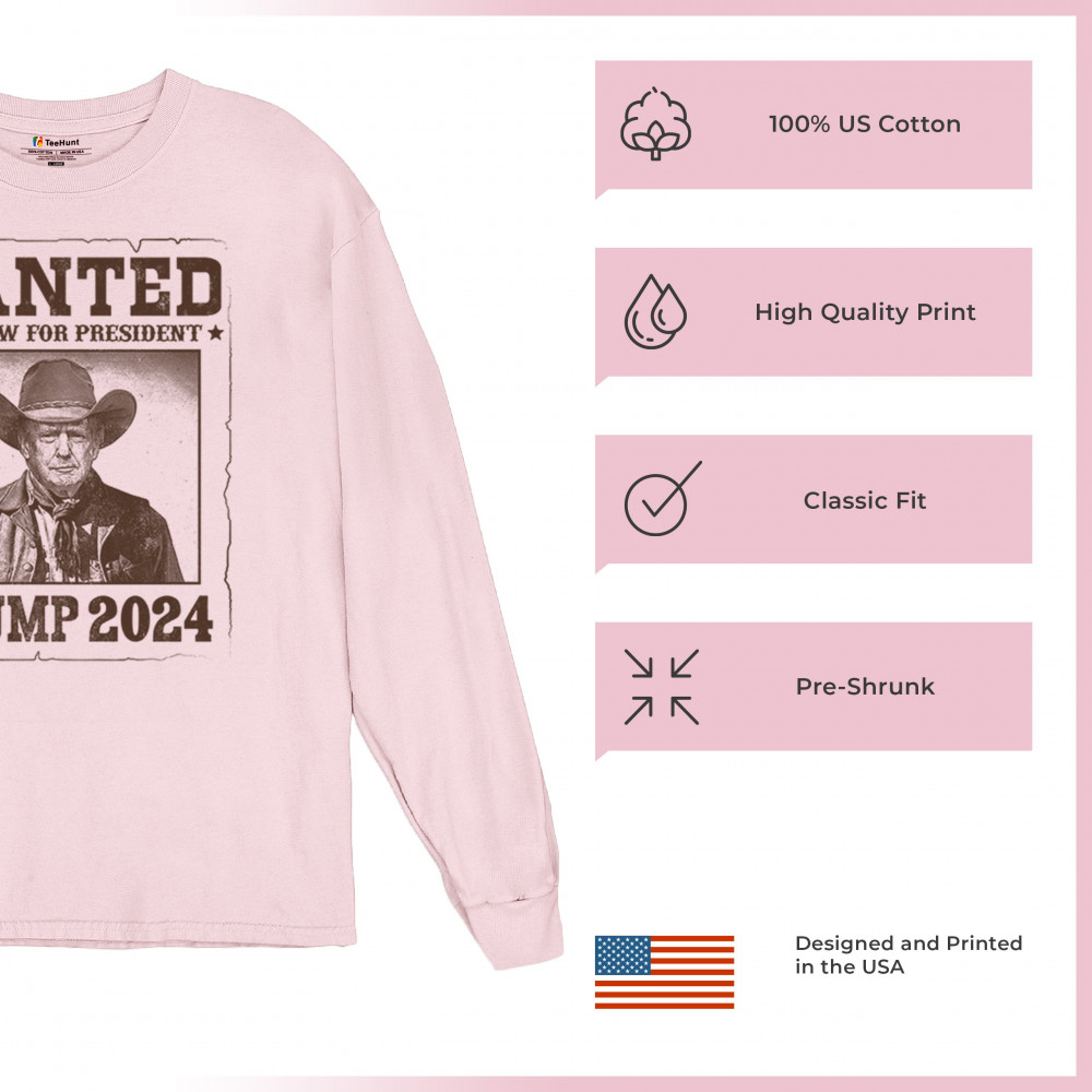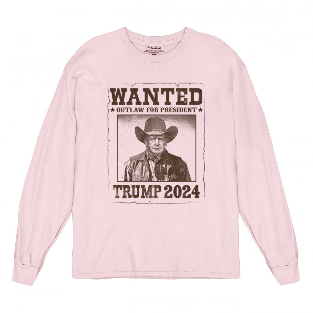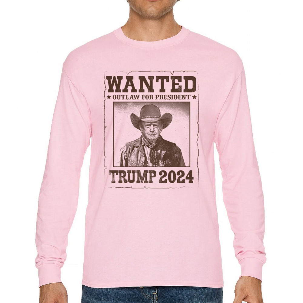 Bold "Wanted: Outlaw for President" design featuring Trump in cowboy attire, perfect for rally-goers and supporters. Express your support for the 2024 election.