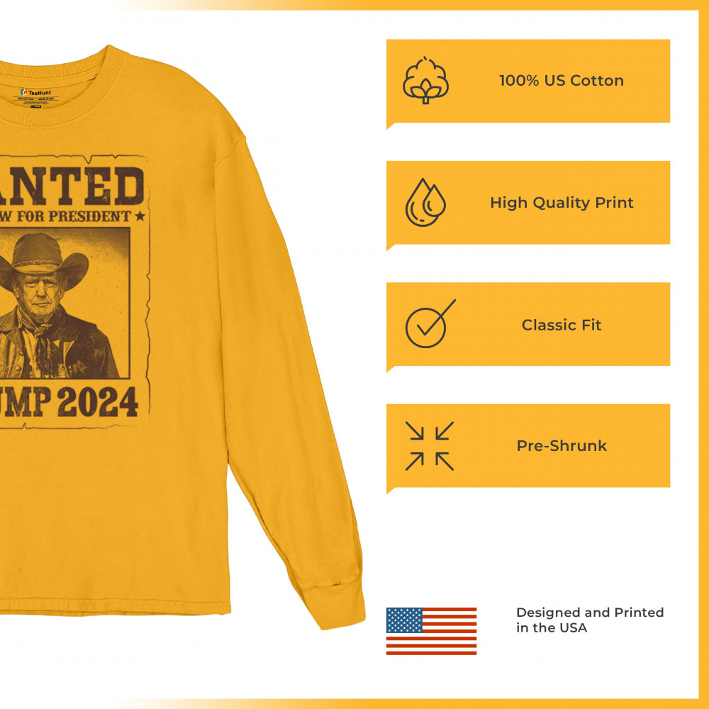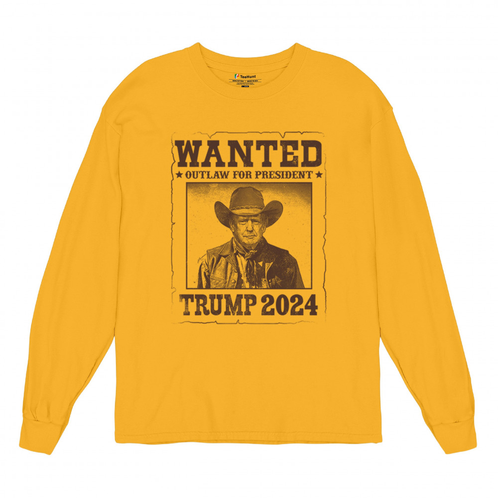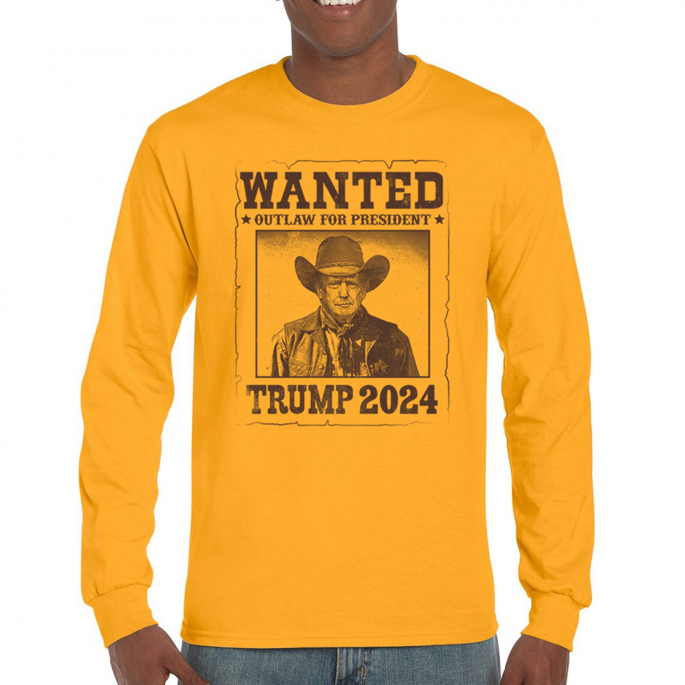 Bold "Wanted: Outlaw for President" design featuring Trump in cowboy attire, perfect for rally-goers and supporters. Express your support for the 2024 election.