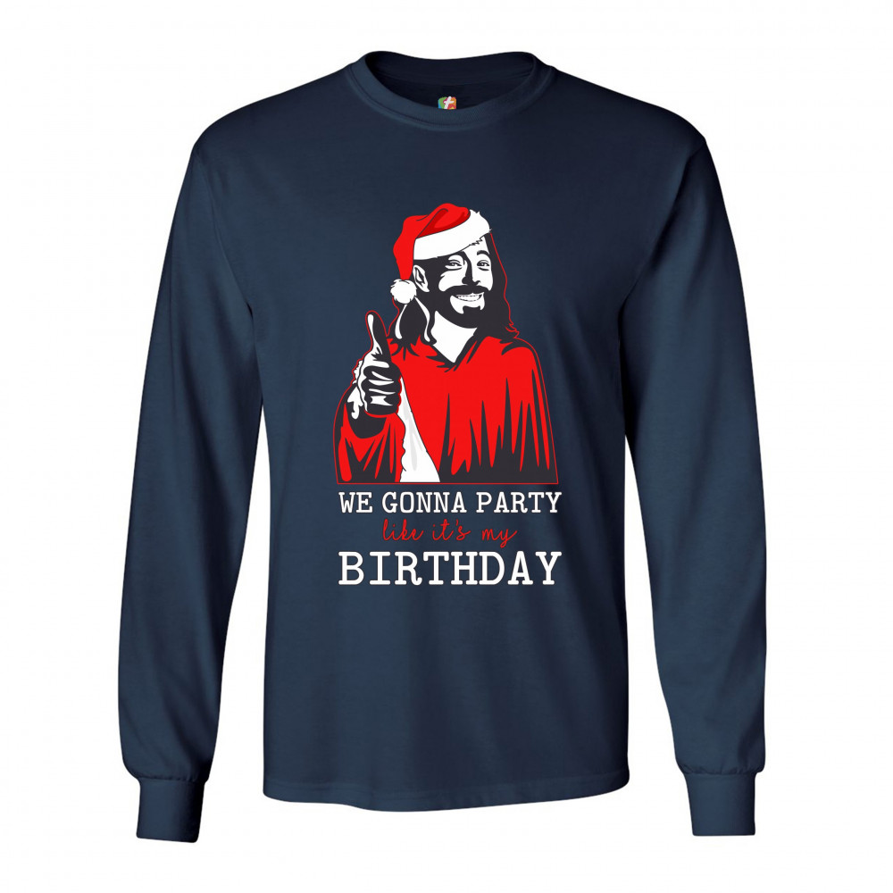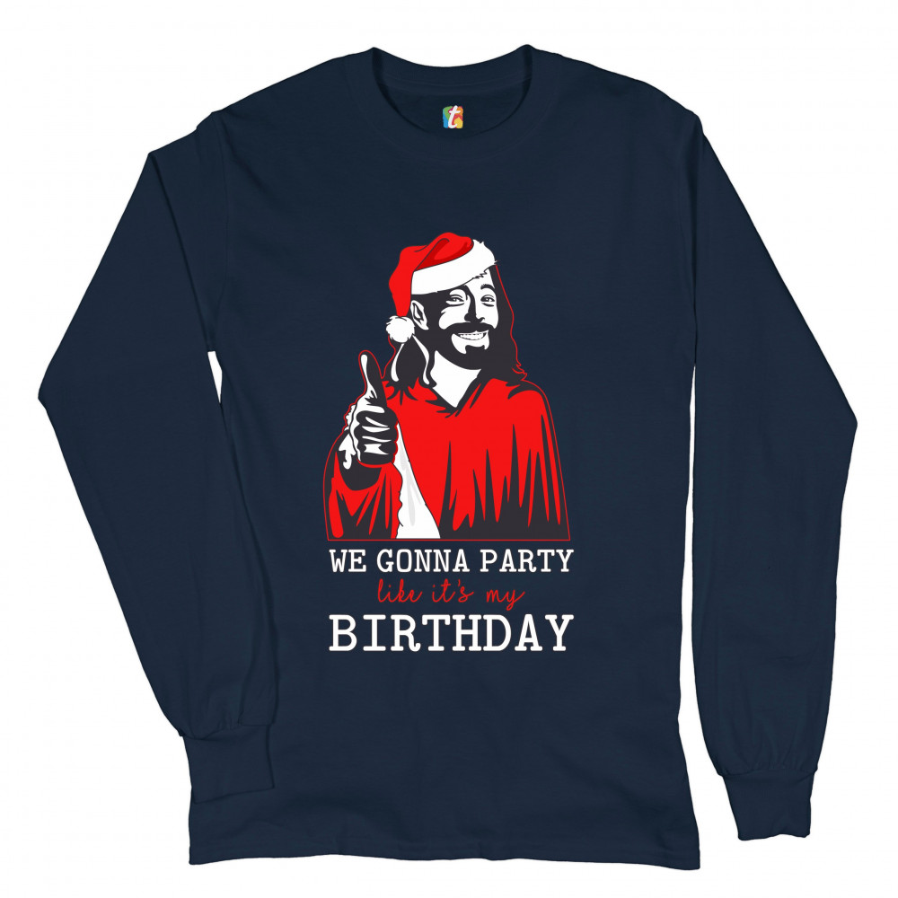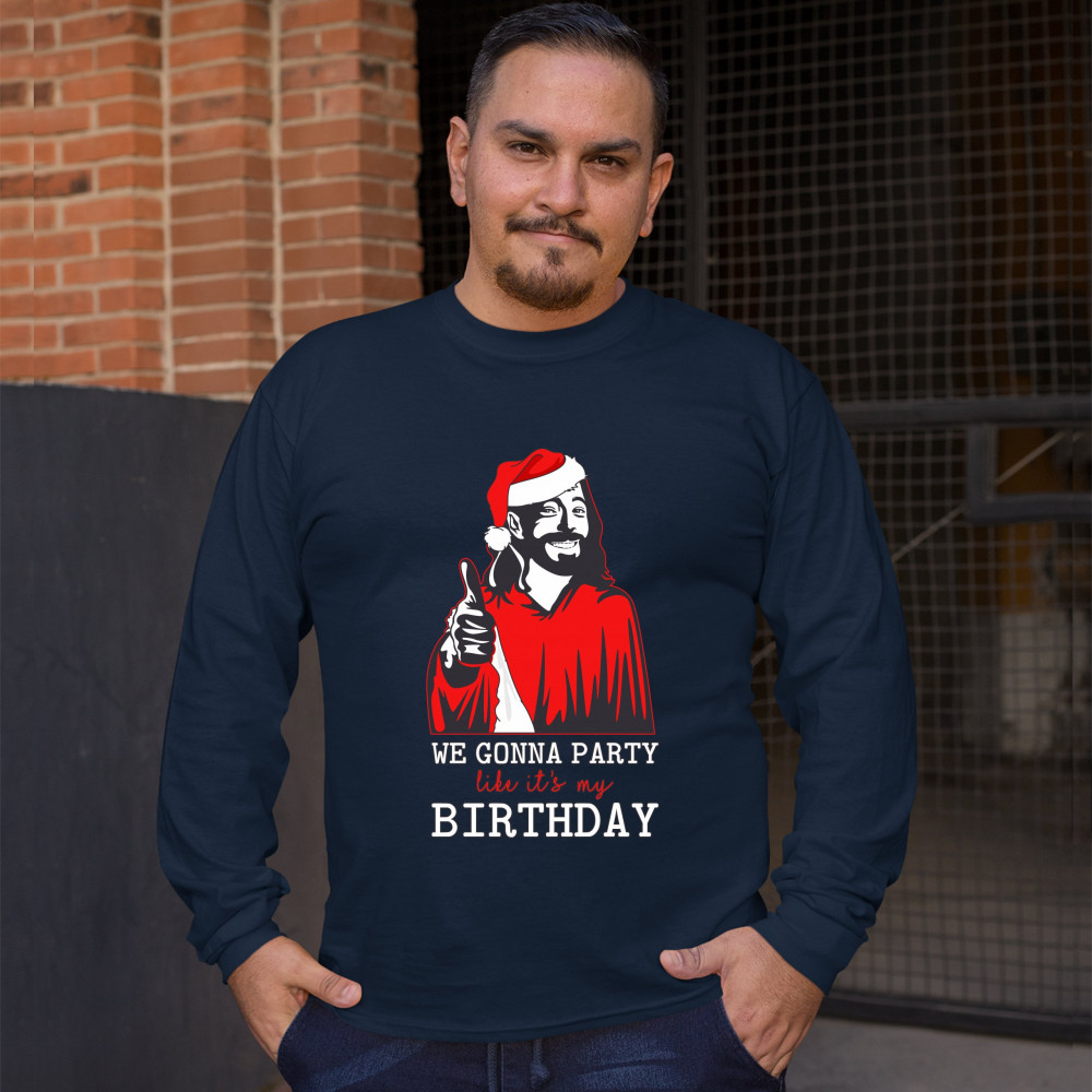 WE GONNA PARTY LIKE IT'S MY BIRTHDAY long sleeve t-shirt jesus christ xmas navy blue