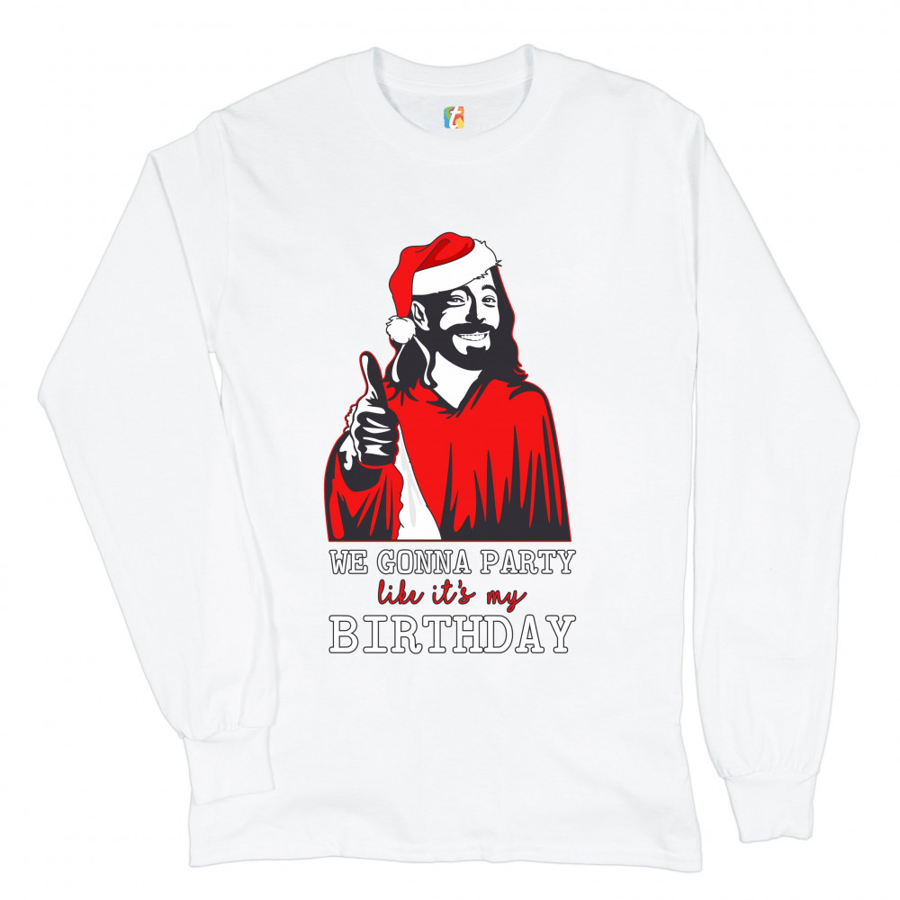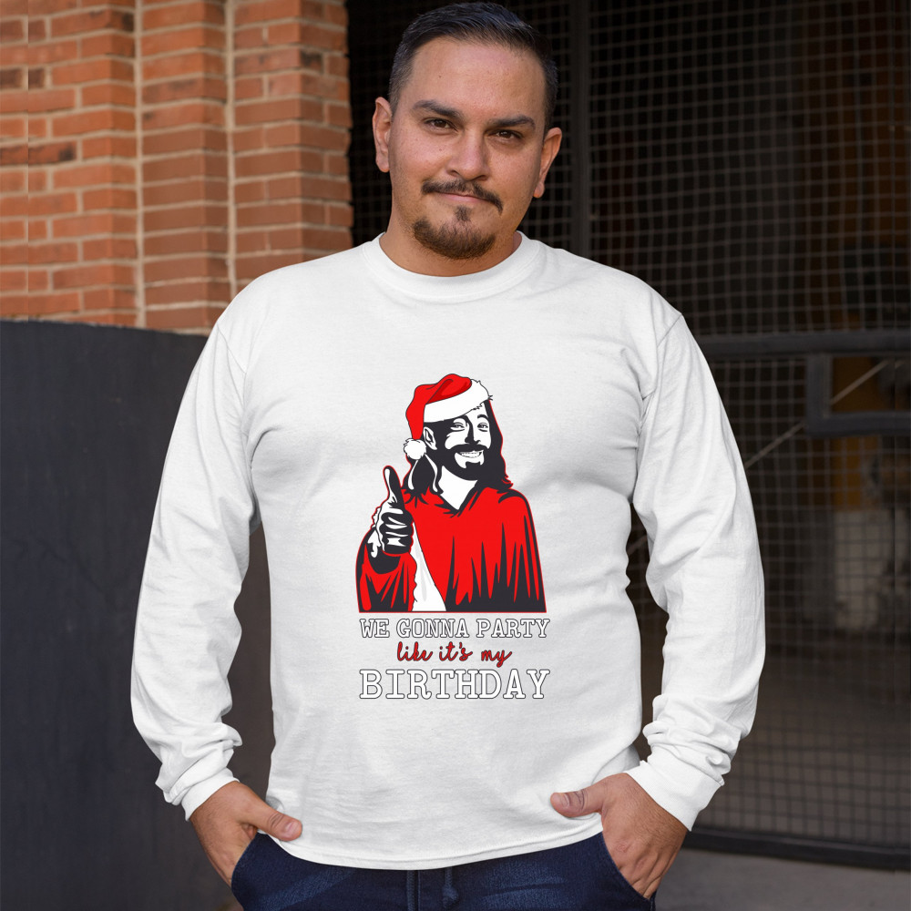 WE GONNA PARTY LIKE IT'S MY BIRTHDAY long sleeve t-shirt jesus christ xmas white