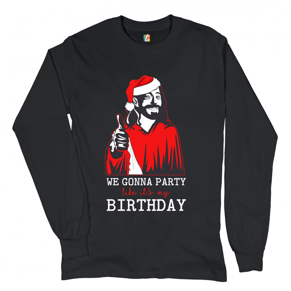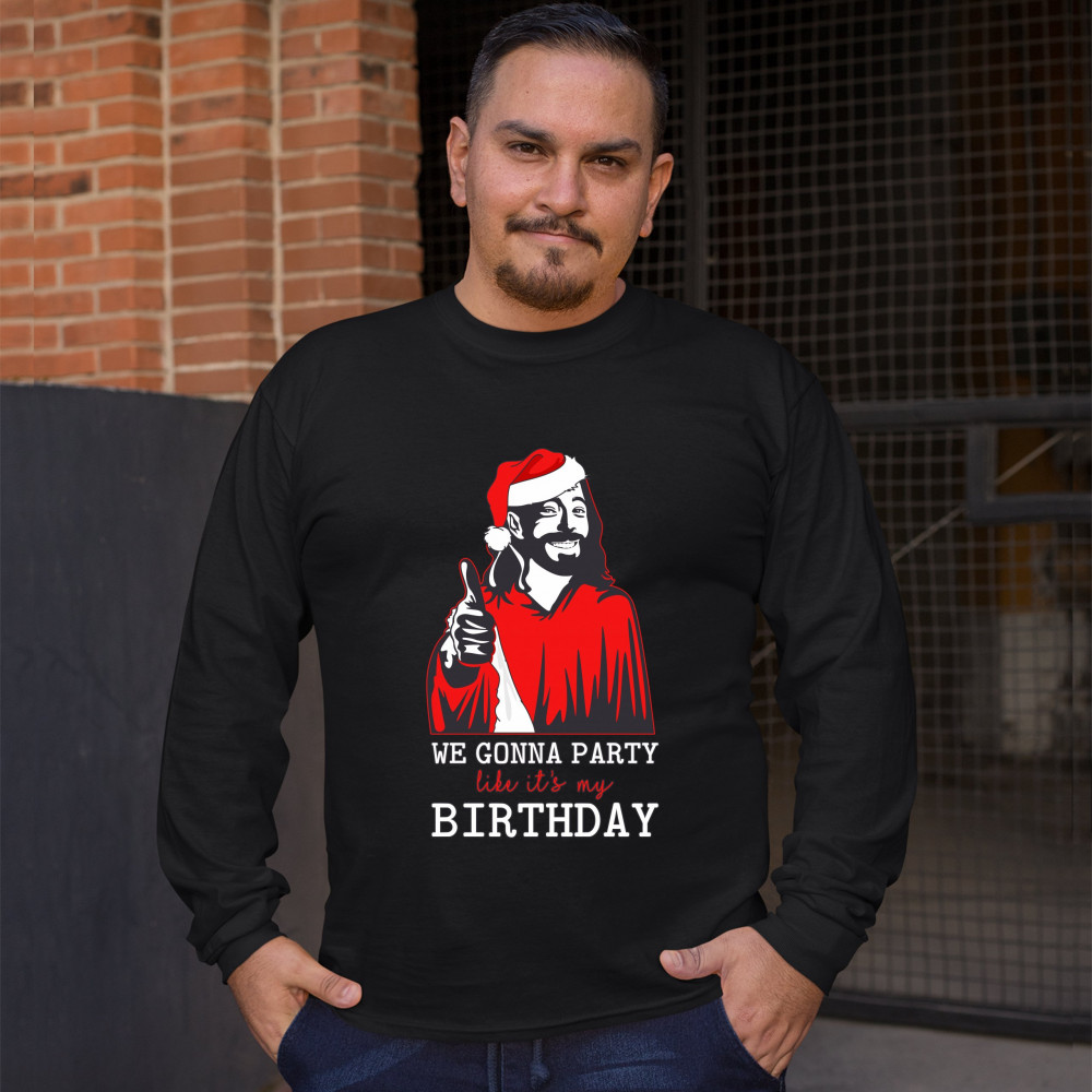 WE GONNA PARTY LIKE IT'S MY BIRTHDAY long sleeve t-shirt jesus christ xmas black