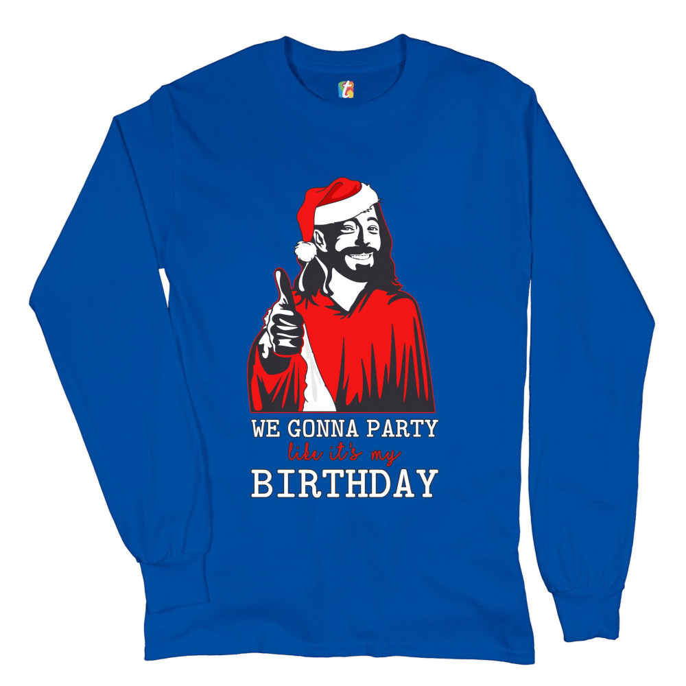 WE GONNA PARTY LIKE IT'S MY BIRTHDAY long sleeve t-shirt jesus christ xmas royal blue