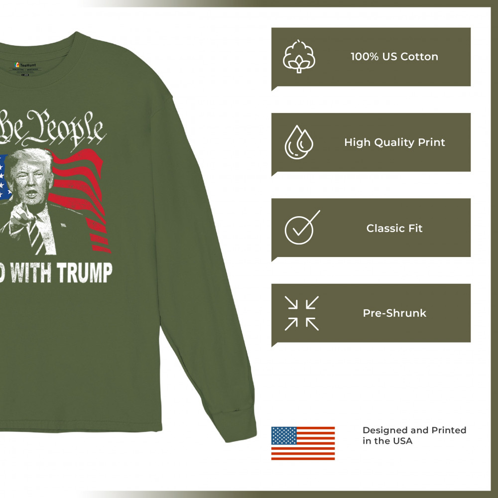 Express your allegiance to President Trump with the "We the People Stand with Trump" design. This compelling design showcases a determined Trump pointing forward, set against the iconic American flag, symbolizing strength and patriotism. It's a perfect choice for rallies and gatherings, proudly representing conservative values and the fight against leftist agendas. Stand up for America's future and make a statement with this design, supporting the principles of freedom and democracy. An essential addition for any Trump supporter dedicated to the conservative cause.