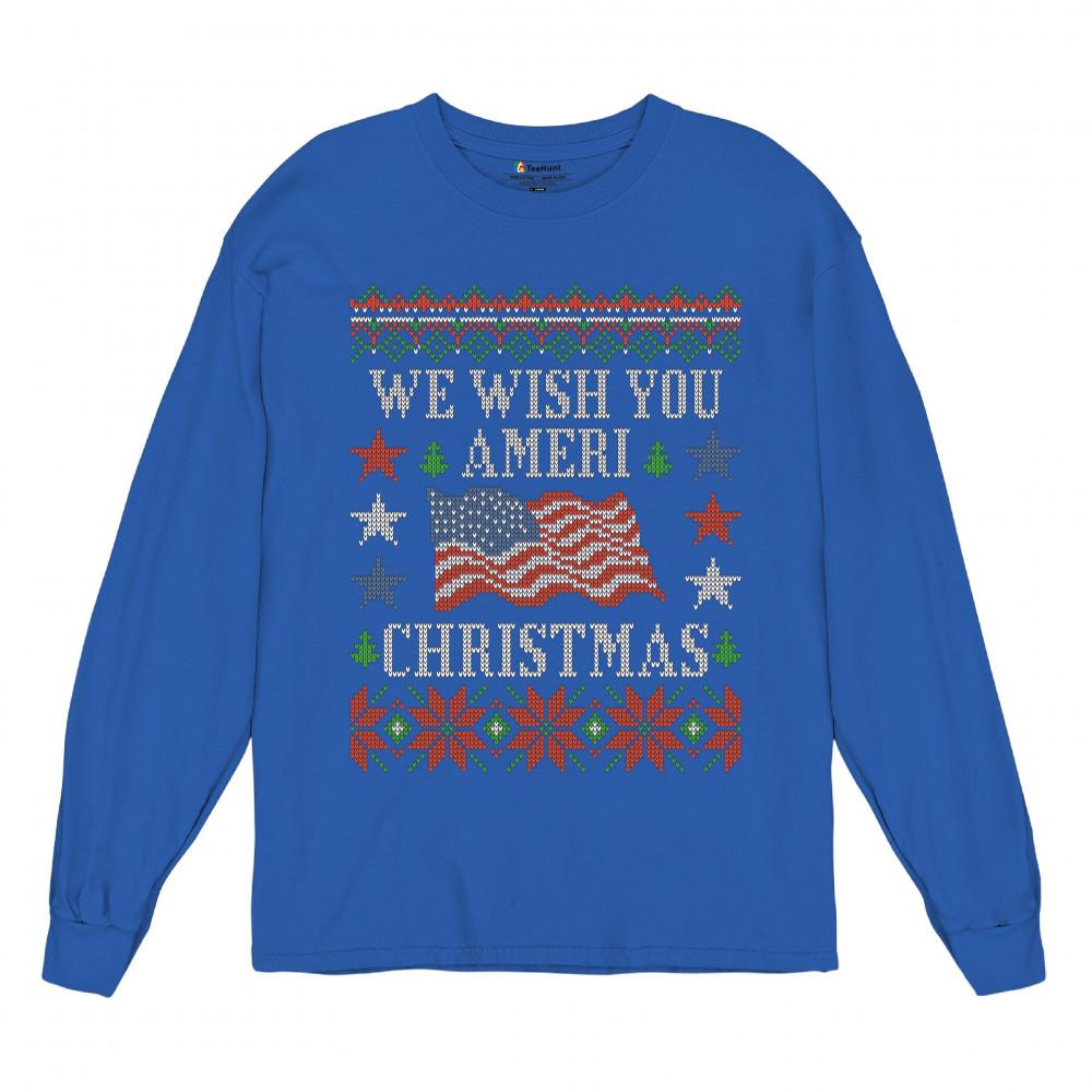 WE WISH YOU AMERI CHRISTMAS long sleeve t-shirt ugly sweater american flag royal blue