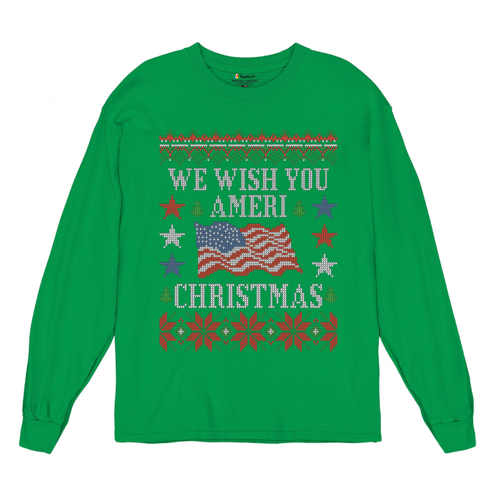 WE WISH YOU AMERI CHRISTMAS long sleeve t-shirt ugly sweater american flag green