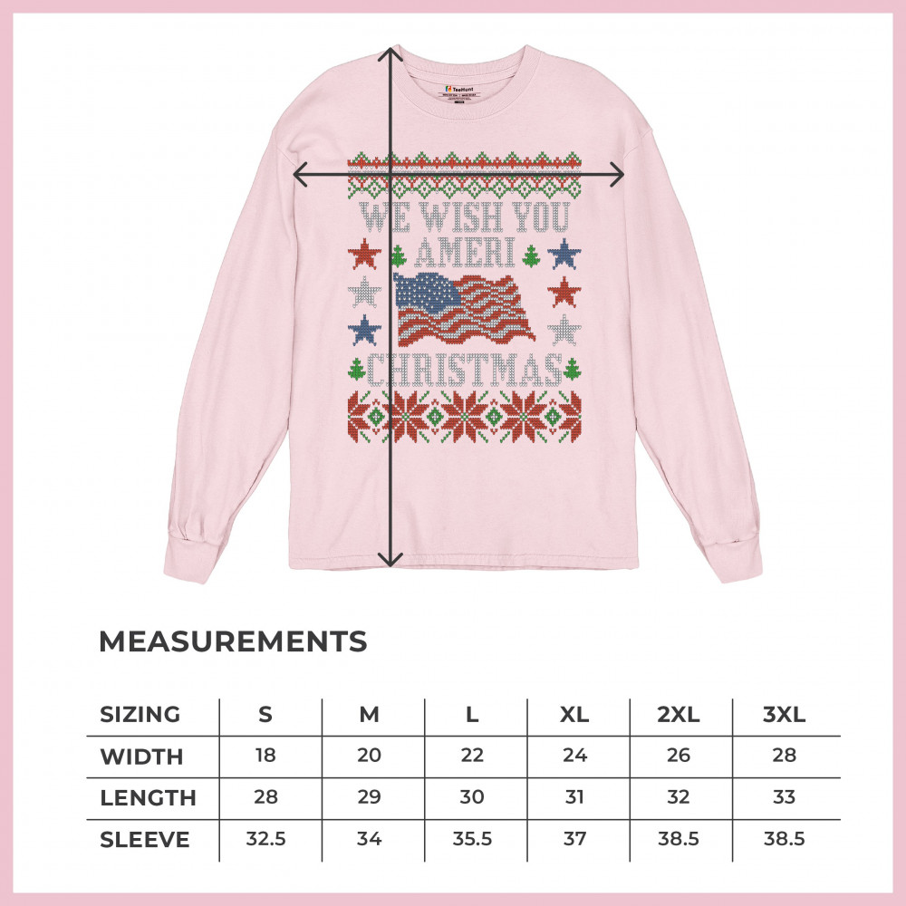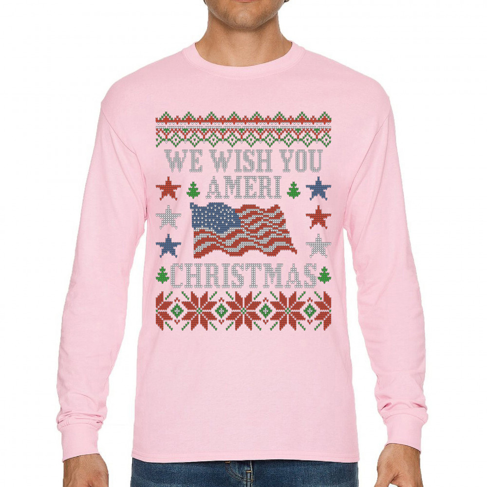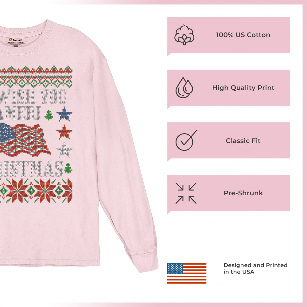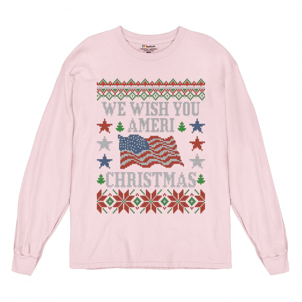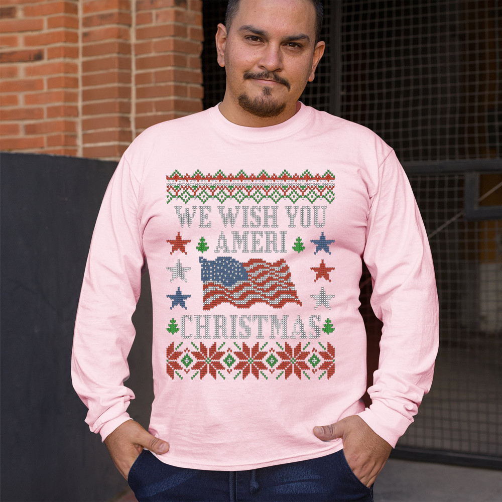 WE WISH YOU AMERI CHRISTMAS long sleeve t-shirt ugly sweater american flag pink