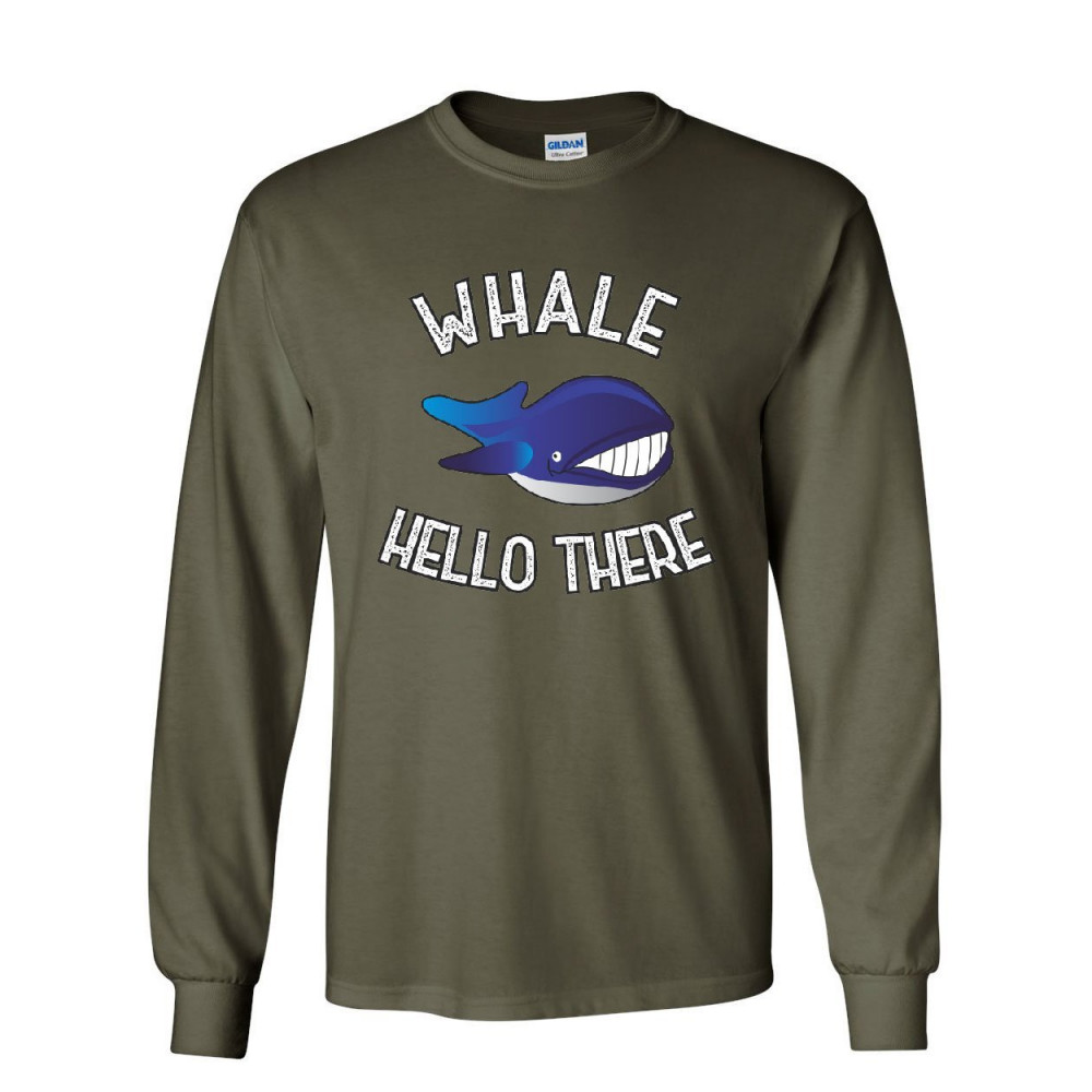 WHALE HELLO THERE long sleeve t-shirt funny wildlife ocean cute pun wordplay tee military green