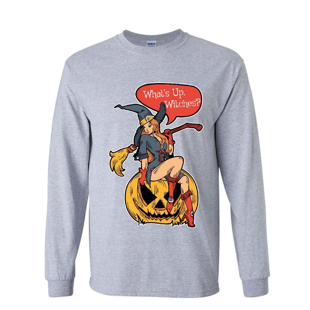 WHAT'S UP WITCHES? what's up witches long sleeve t-shirt halloween sexy witch jack-o-lantern tee gray