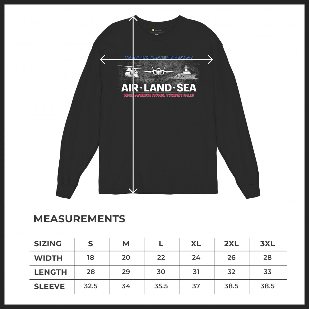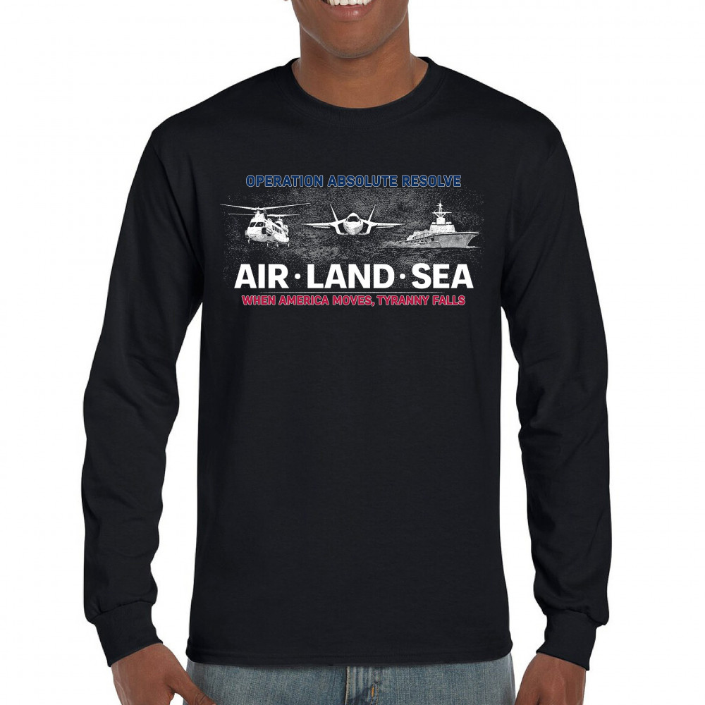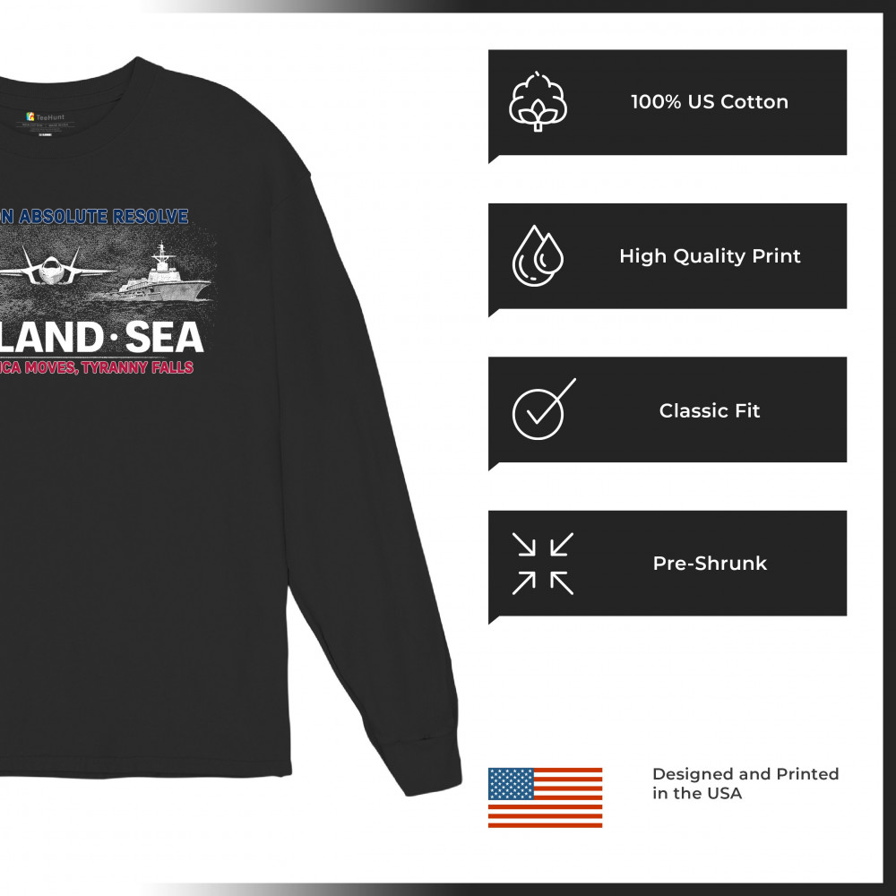 A striking patriotic graphic that combines air, land, and sea visuals to reflect coordination, resolve, and national strength. The design uses bold typography and classic military-inspired imagery without referencing specific people or conflicts. Created to feel powerful yet timeless, it works well for patriotic gatherings, heritage moments, and everyday wear.