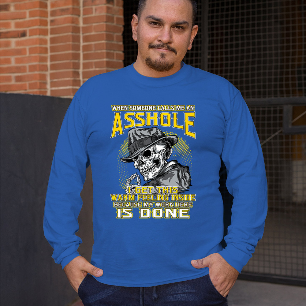 This badass design features a smirking skull in a fedora with a cigarette, backed by the line: “When someone calls me an asshole... my work here is done.†Built for dark humor fans, skull art lovers, and those who live life with sharp wit and zero regrets. Ideal for biker rallies, sarcasm nights, or anyone owning their attitude with pride.