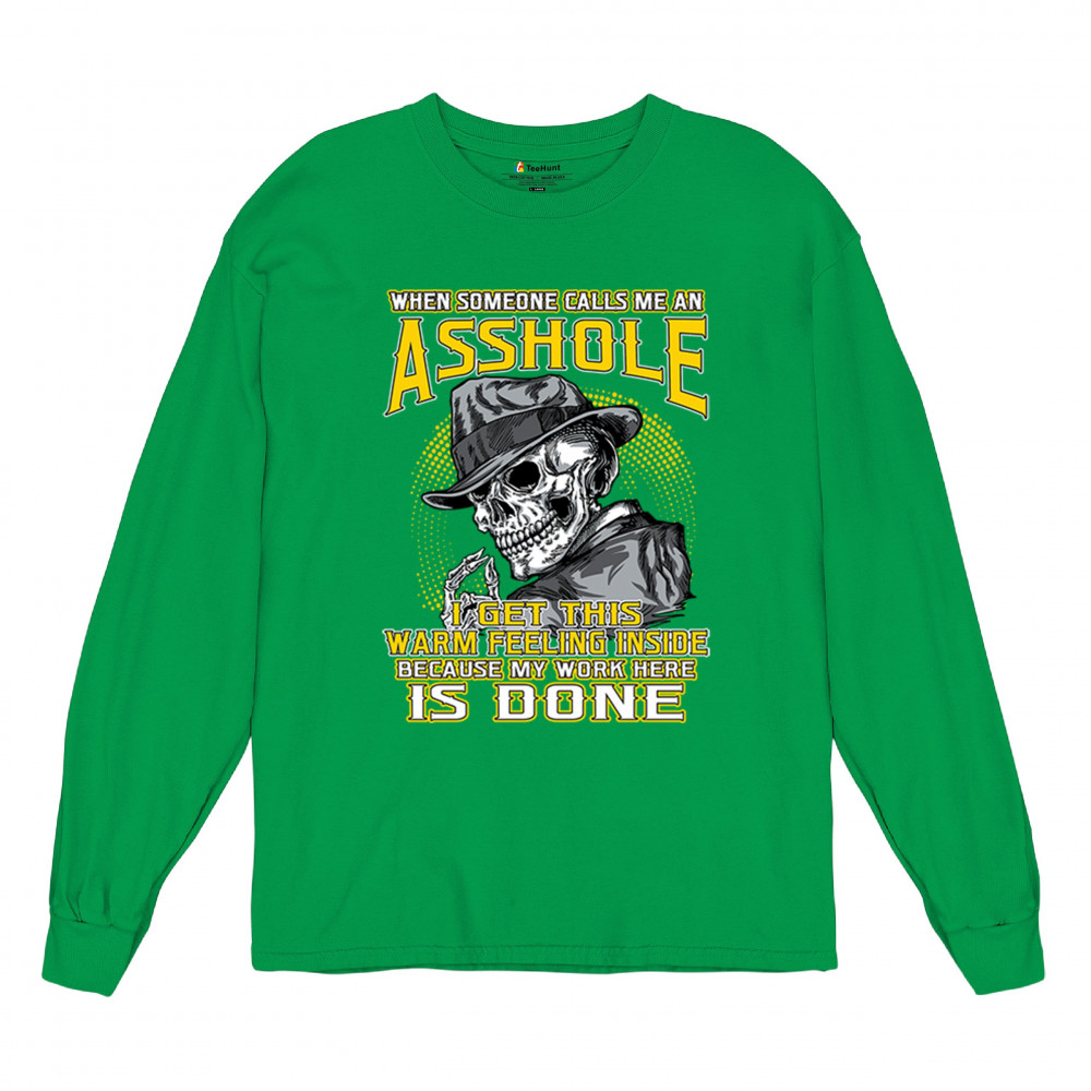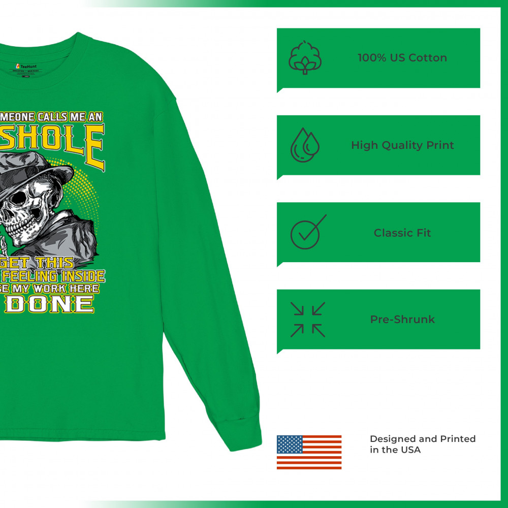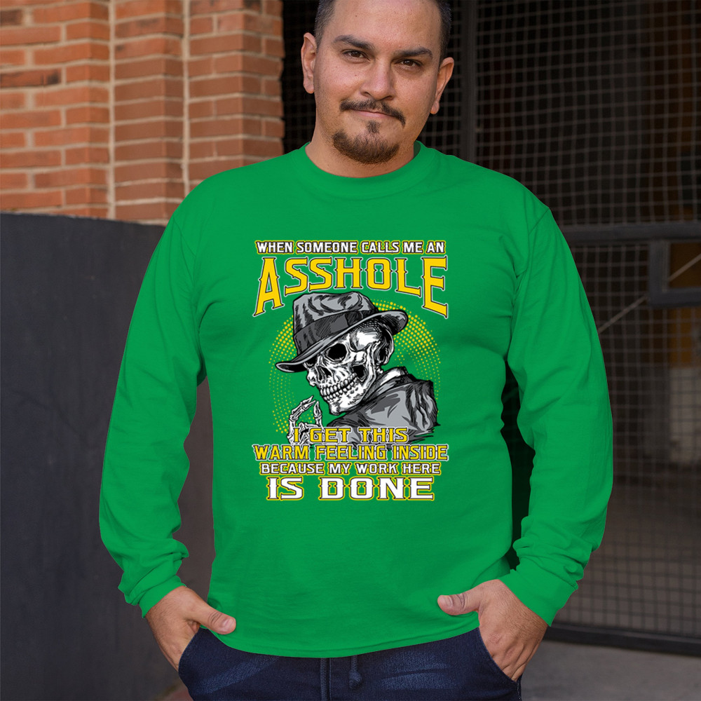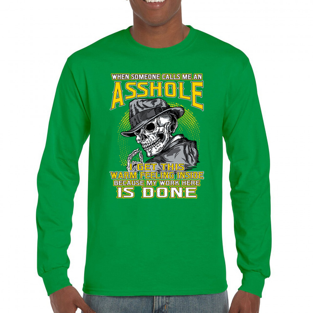 This badass design features a smirking skull in a fedora with a cigarette, backed by the line: “When someone calls me an asshole... my work here is done.†Built for dark humor fans, skull art lovers, and those who live life with sharp wit and zero regrets. Ideal for biker rallies, sarcasm nights, or anyone owning their attitude with pride.