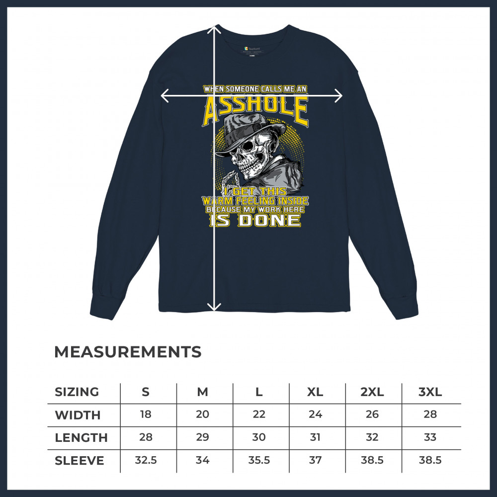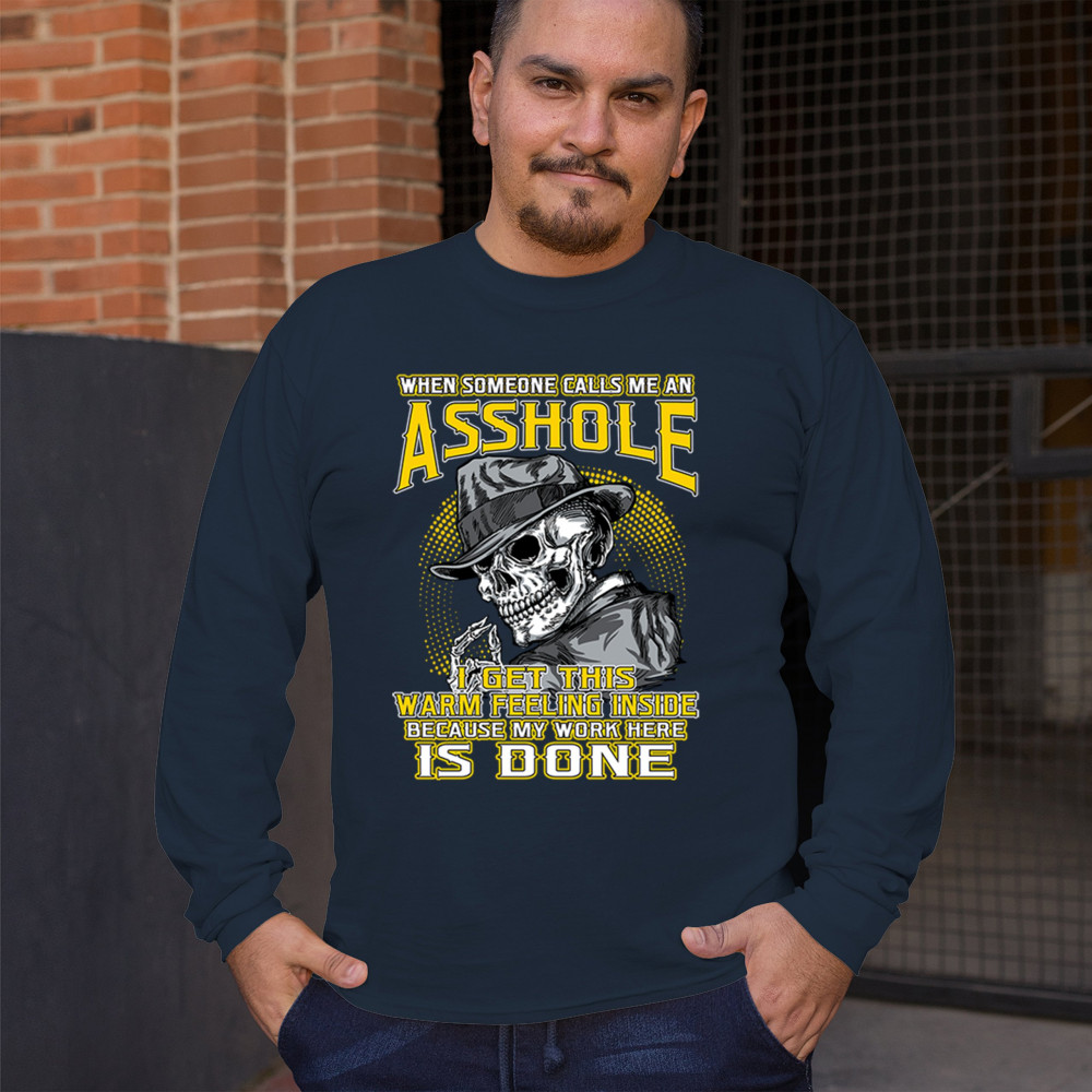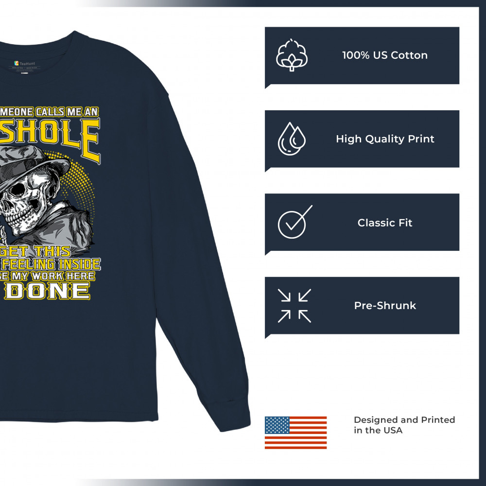 This badass design features a smirking skull in a fedora with a cigarette, backed by the line: “When someone calls me an asshole... my work here is done.†Built for dark humor fans, skull art lovers, and those who live life with sharp wit and zero regrets. Ideal for biker rallies, sarcasm nights, or anyone owning their attitude with pride.