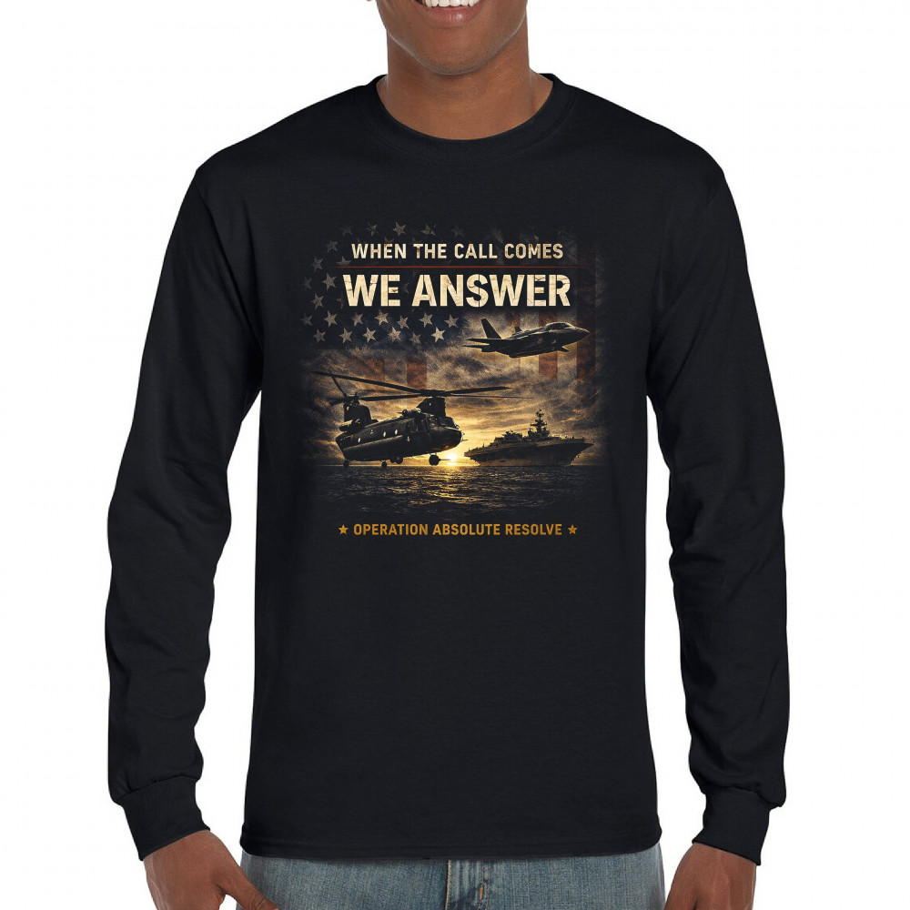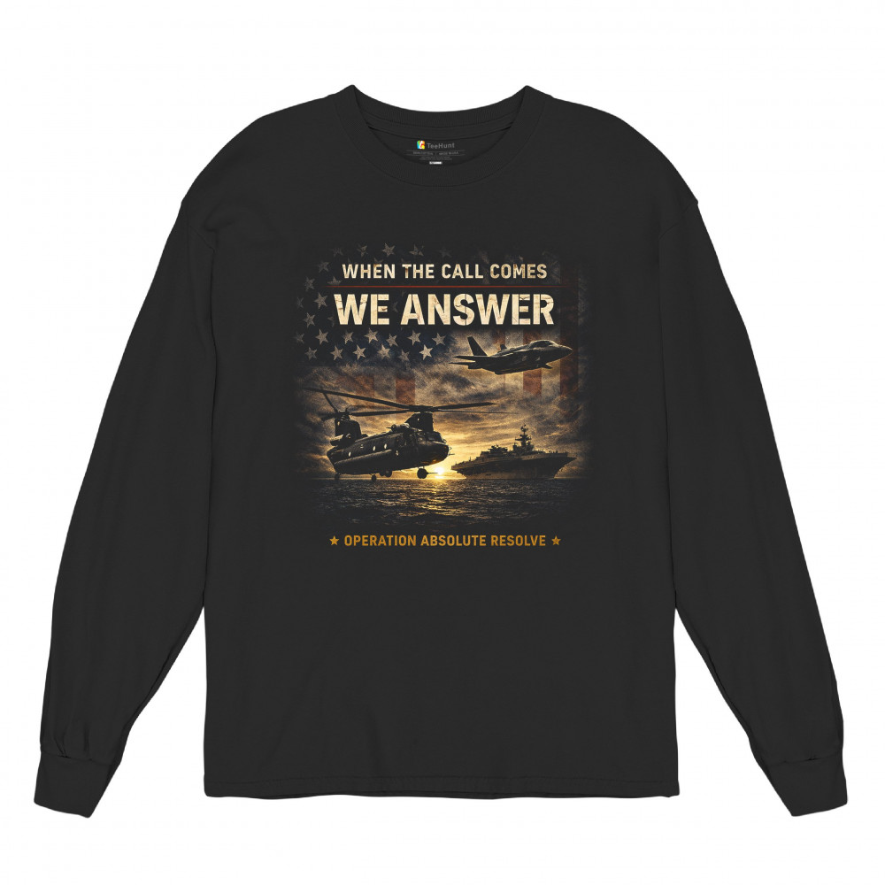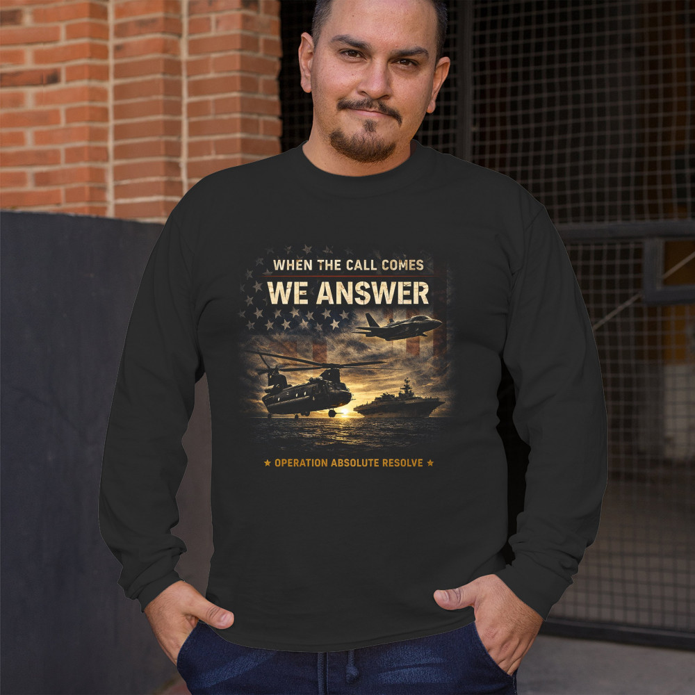 A striking patriotic graphic emphasizing duty and resolve through coordinated silhouettes across air, sea, and land beneath a weathered American flag. The composition reflects unity, preparedness, and national strength in a timeless, symbolic way. Perfect for patriotic holidays, heritage events, veterans, and anyone honoring the enduring American spirit.