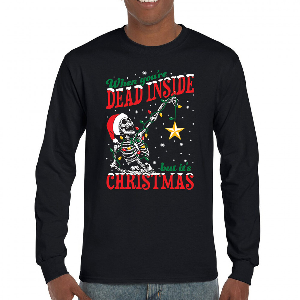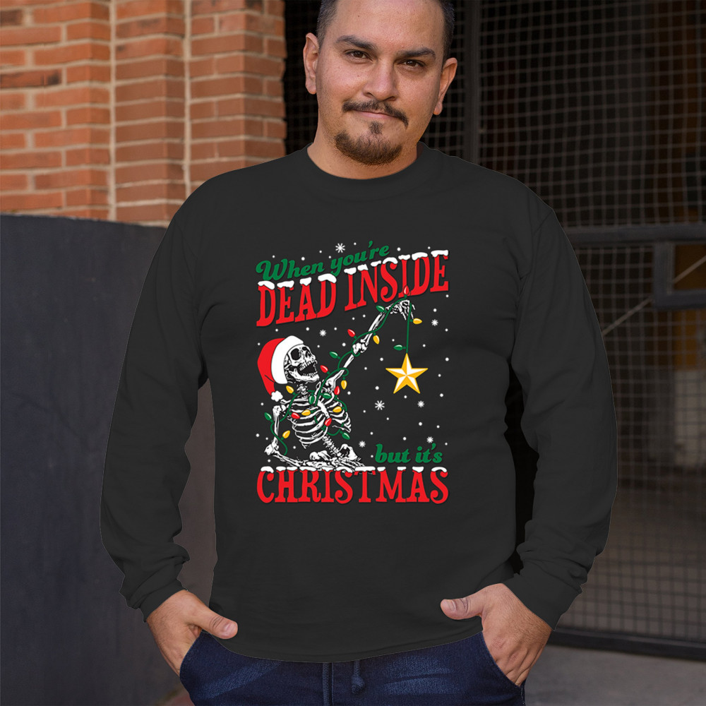 Bring humor and uniqueness to your holiday wardrobe with the "When You're Dead Inside But It's Christmas" design. This quirky creation features a skeleton embracing the festive spirit with colorful lights, a Santa hat, and a glowing star. Ideal for Secret Santa exchanges, ugly sweater parties, or anyone who loves blending a touch of humor with Christmas tradition. Celebrate the season in style with this unforgettable design.