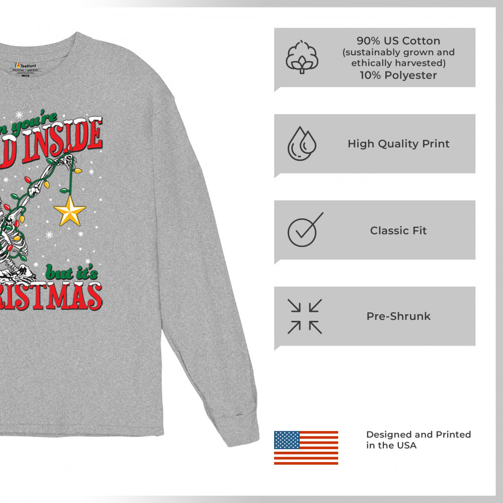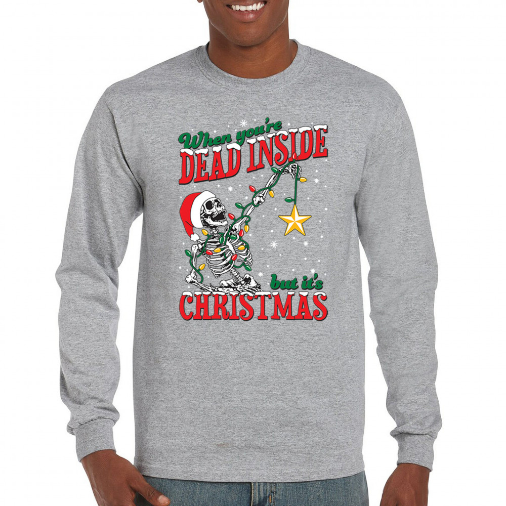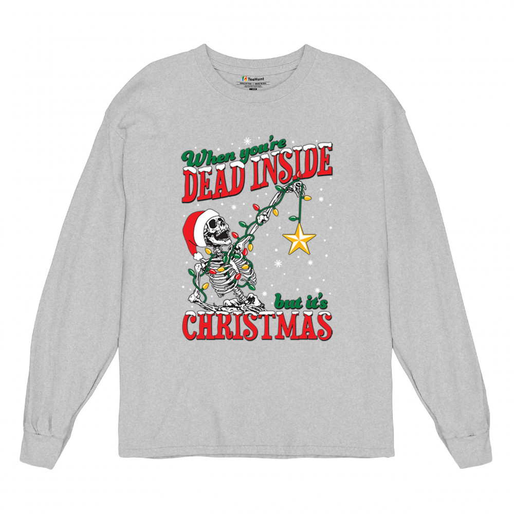 Celebrate humor and holiday spirit with the "When You're Dead Inside But It's Christmas" skeleton design. Perfect for parties and unique gifts.