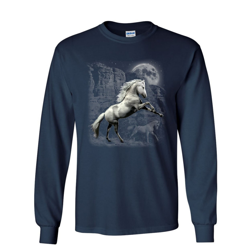 WHITE WILD HORSE long sleeve t-shirt mustang nature animal lovers wildlife tee navy blue