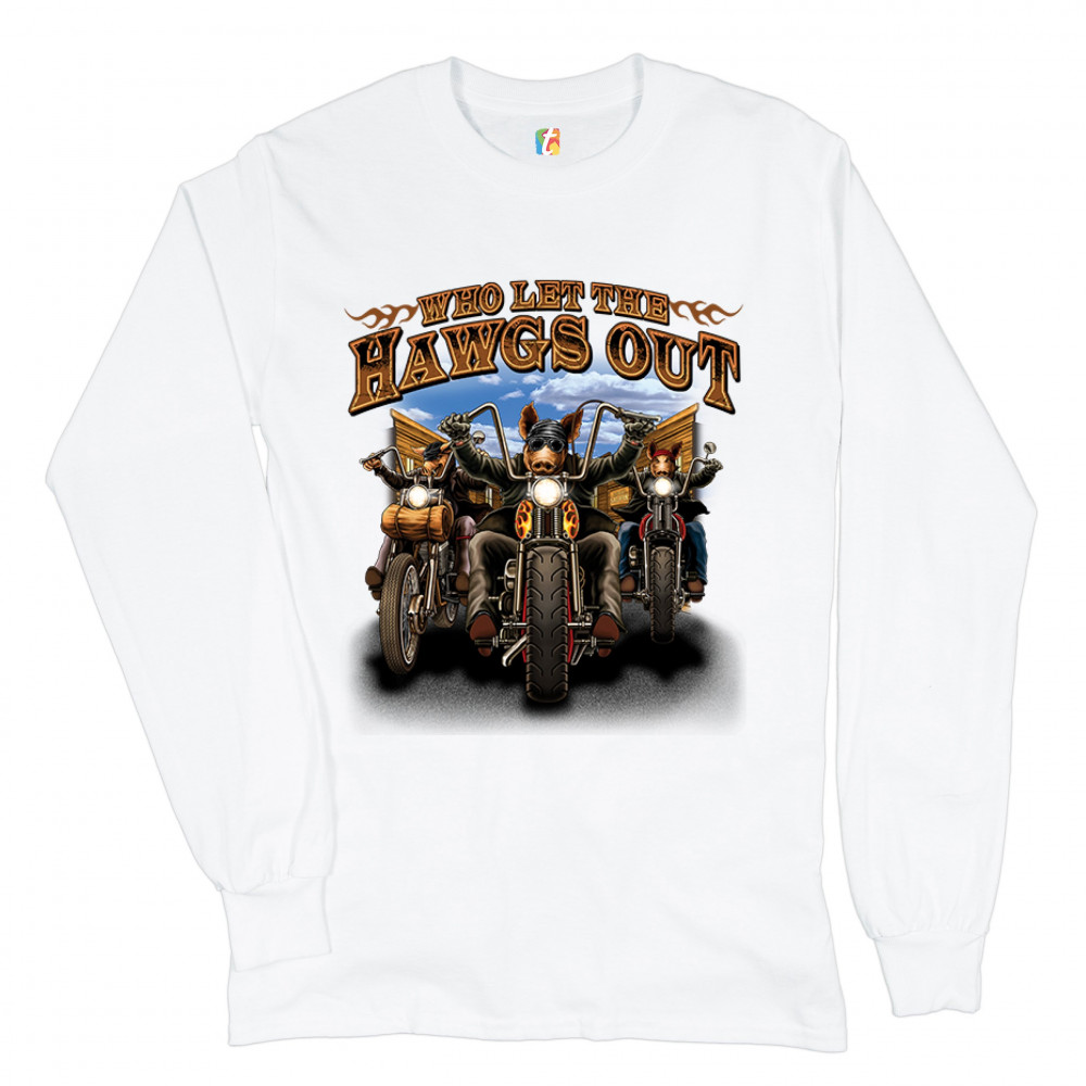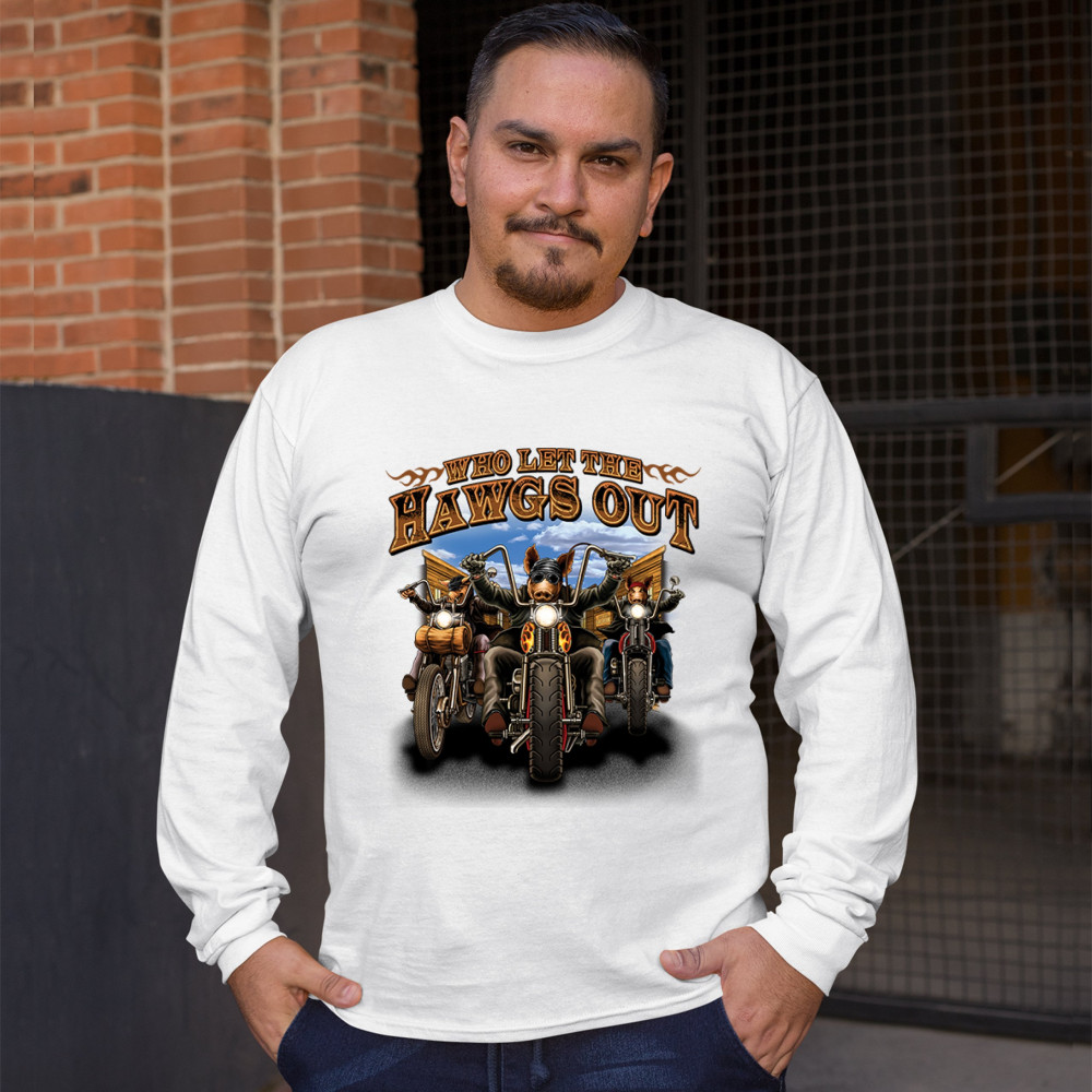 WHO LET THE HAWGS OUT long sleeve t-shirt biker motorcycle gang live to ride white