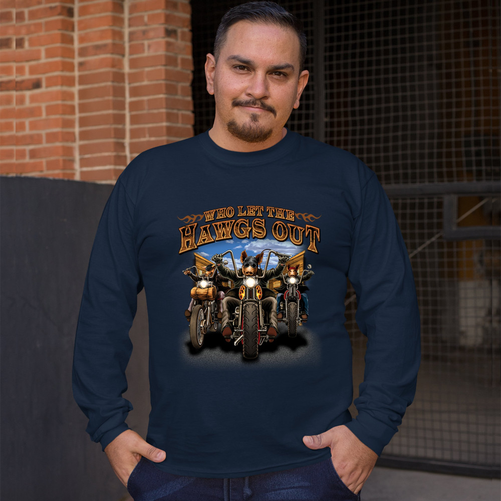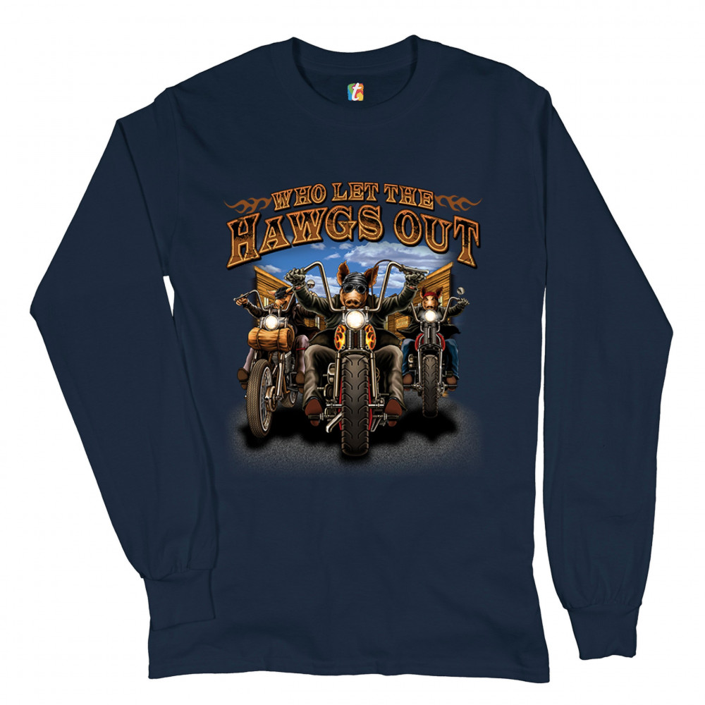 WHO LET THE HAWGS OUT long sleeve t-shirt biker motorcycle gang live to ride navy blue