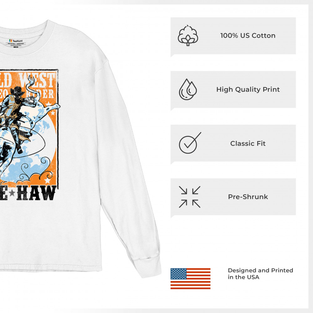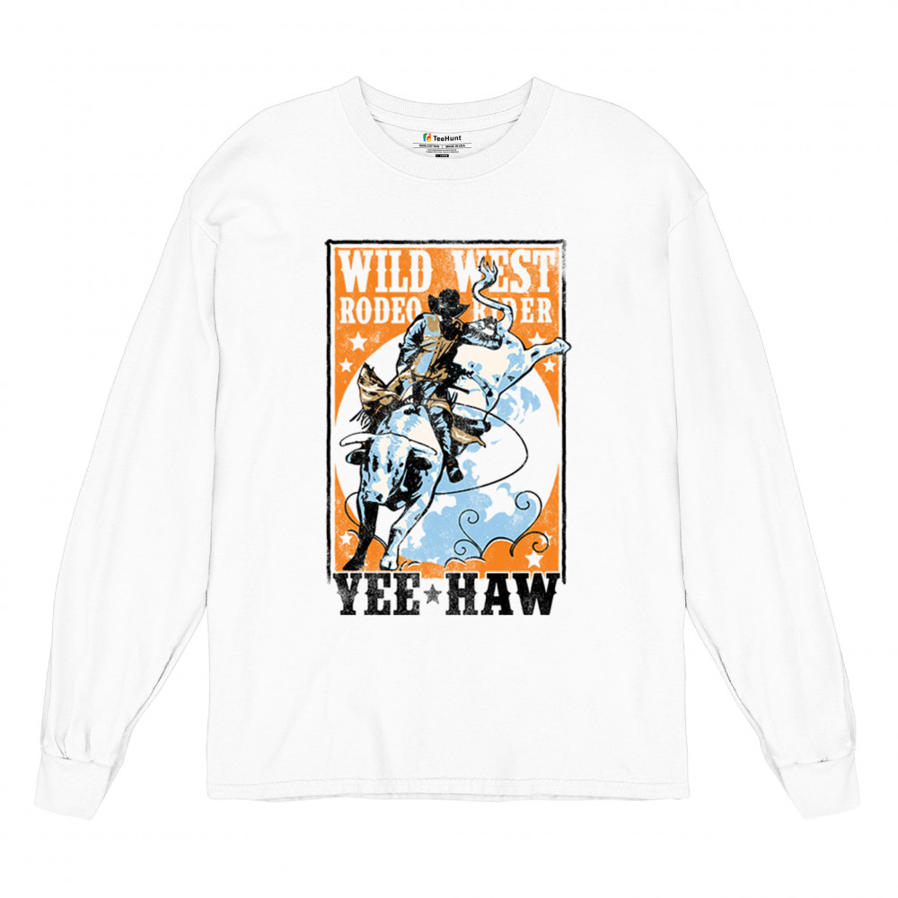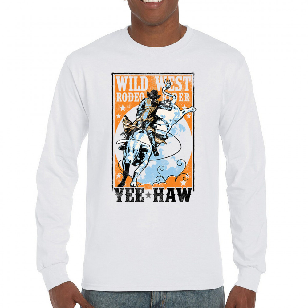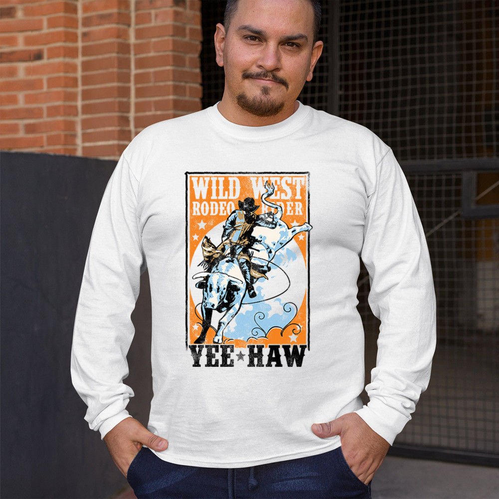 Bold cowboy bull riding design with orange backdrop, perfect for rodeo fans, western events, and country festivals.