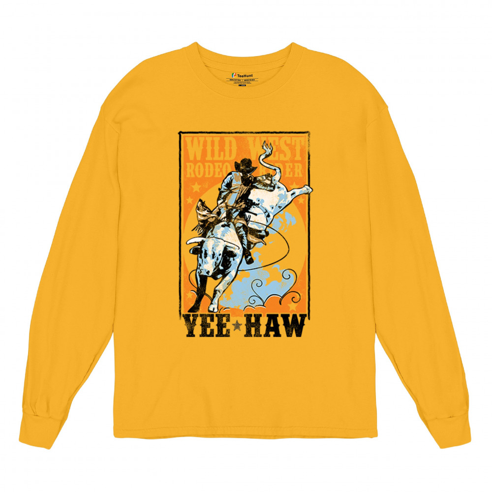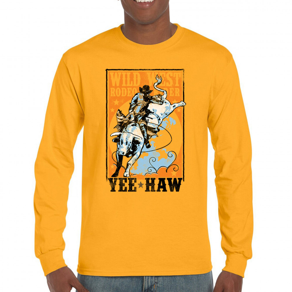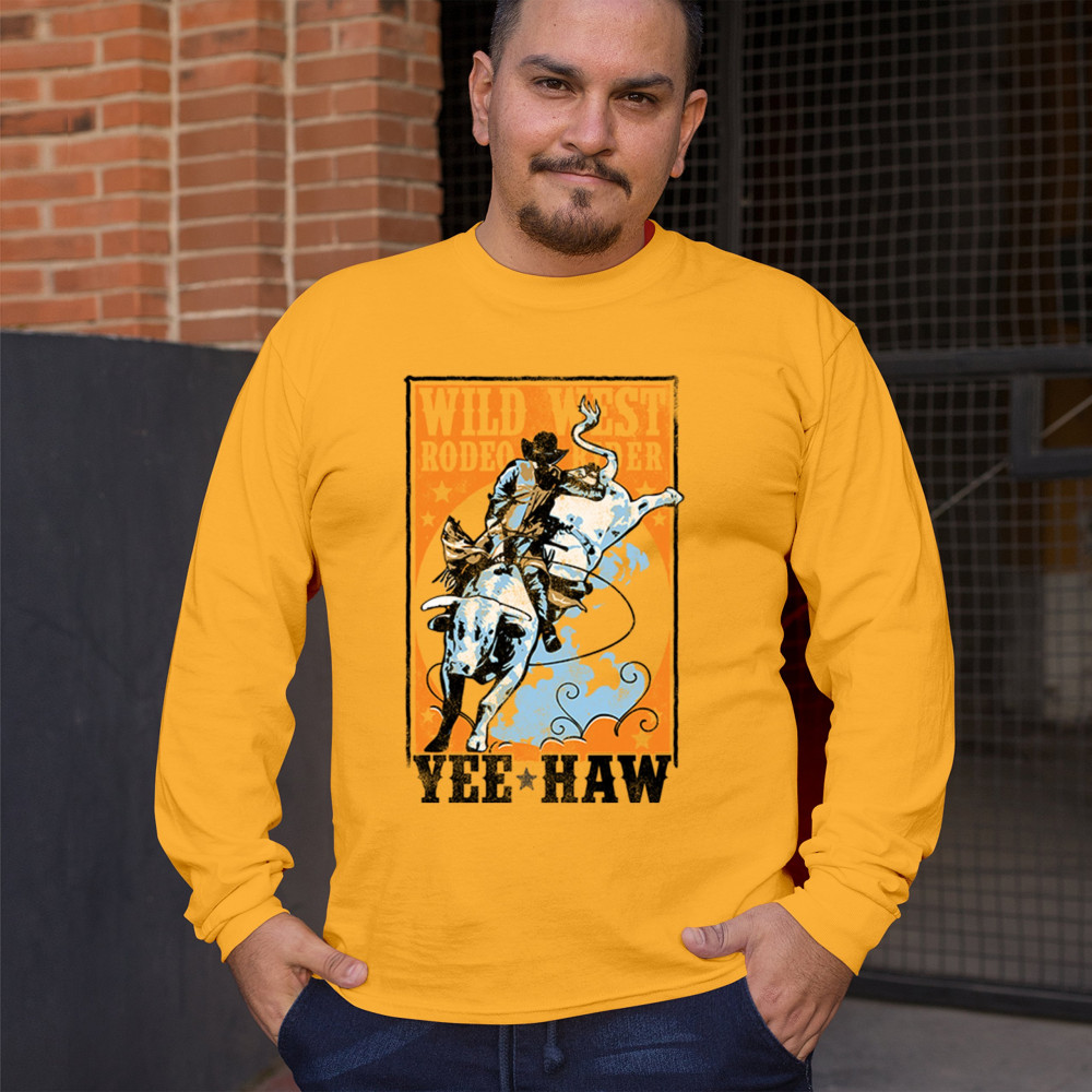 Bold cowboy bull riding design with orange backdrop, perfect for rodeo fans, western events, and country festivals.