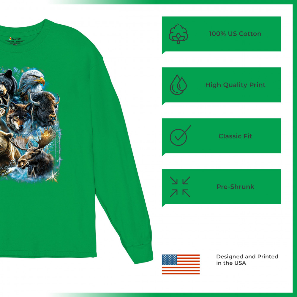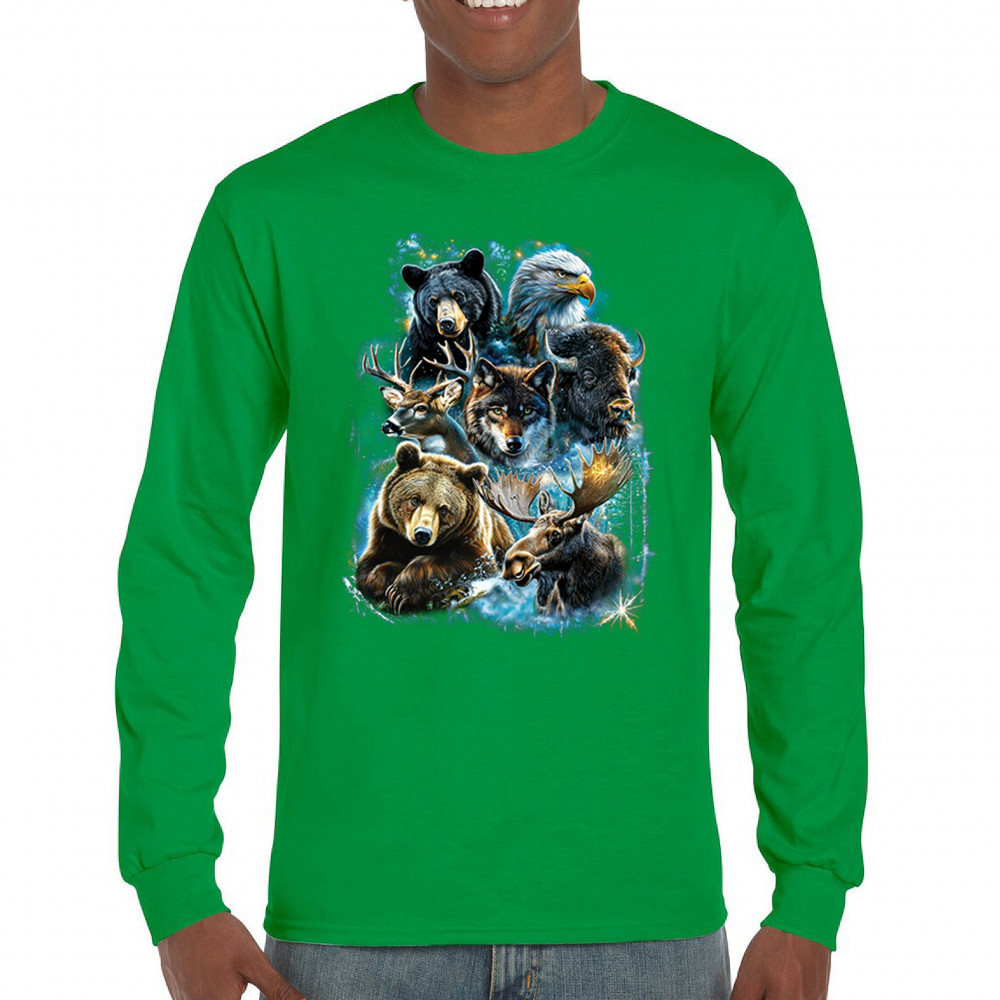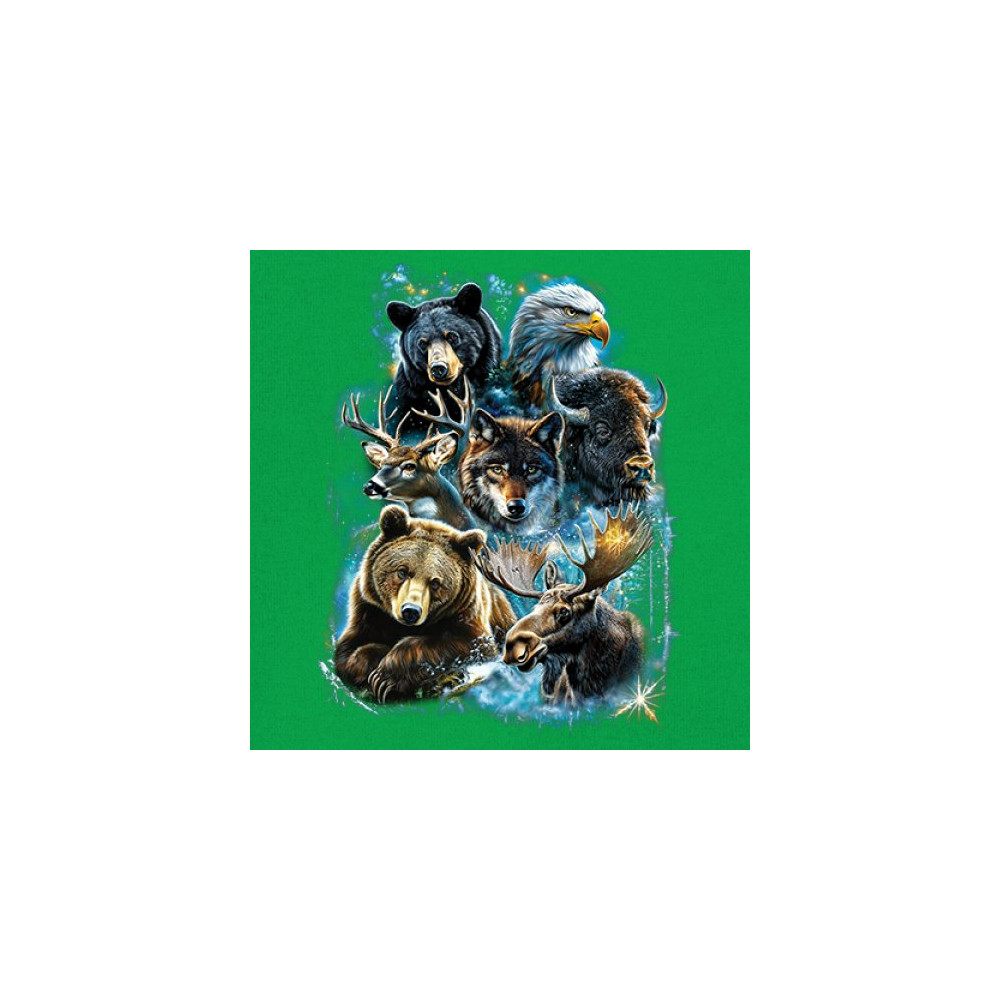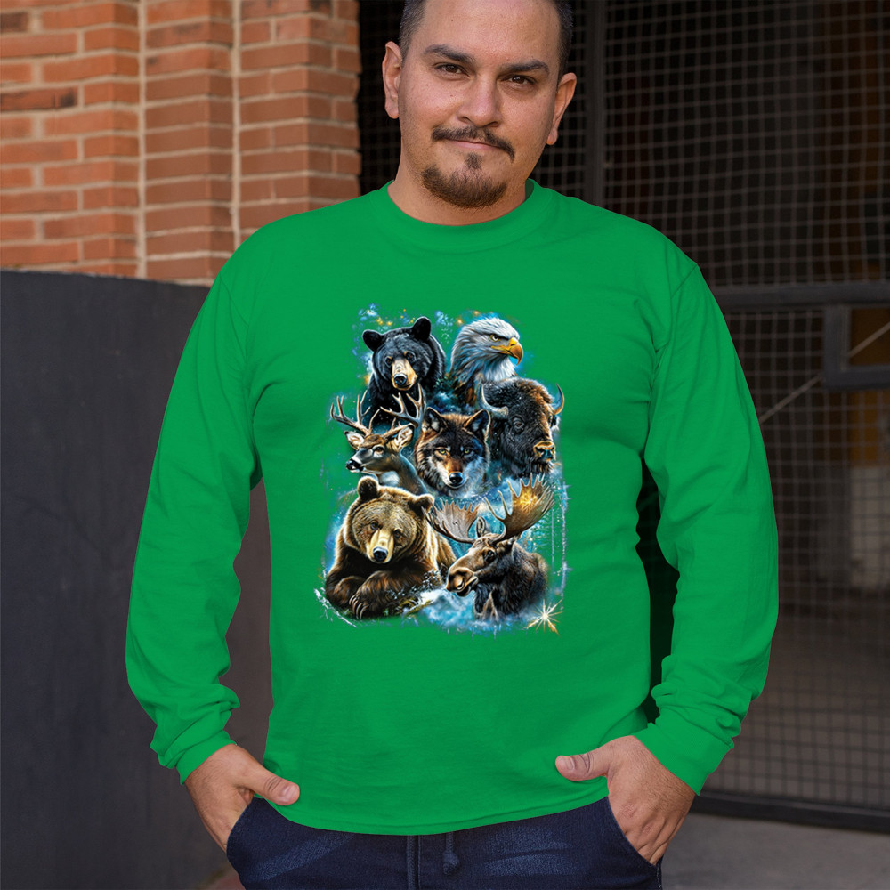 Wilderness design with moose, bear, eagle, bison, and wolf. A bold tribute to forest animals, nature strength, and rugged outdoor spirit.