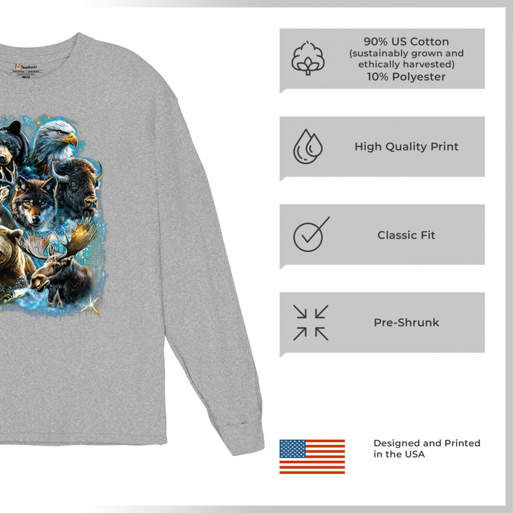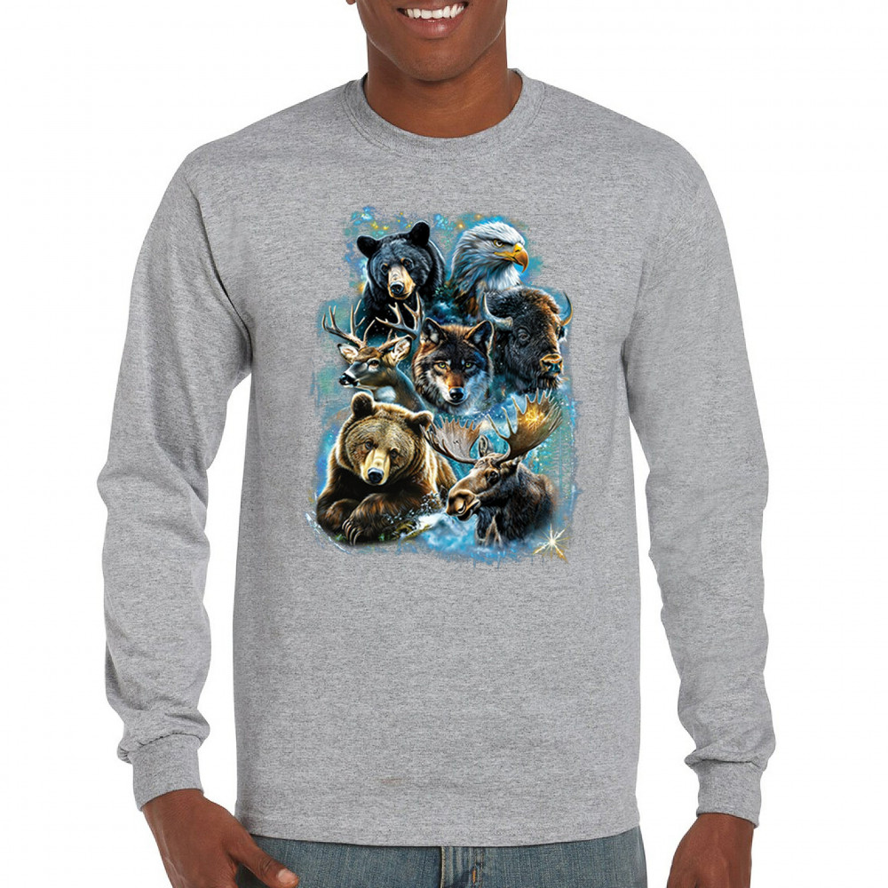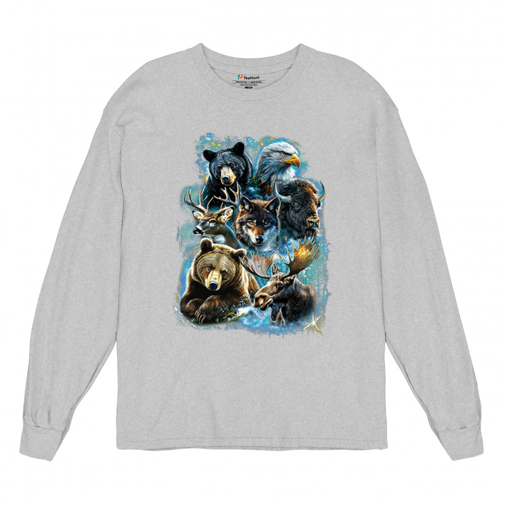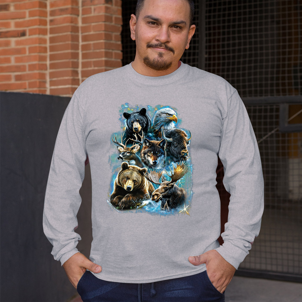 Wilderness design with moose, bear, eagle, bison, and wolf. A bold tribute to forest animals, nature strength, and rugged outdoor spirit.