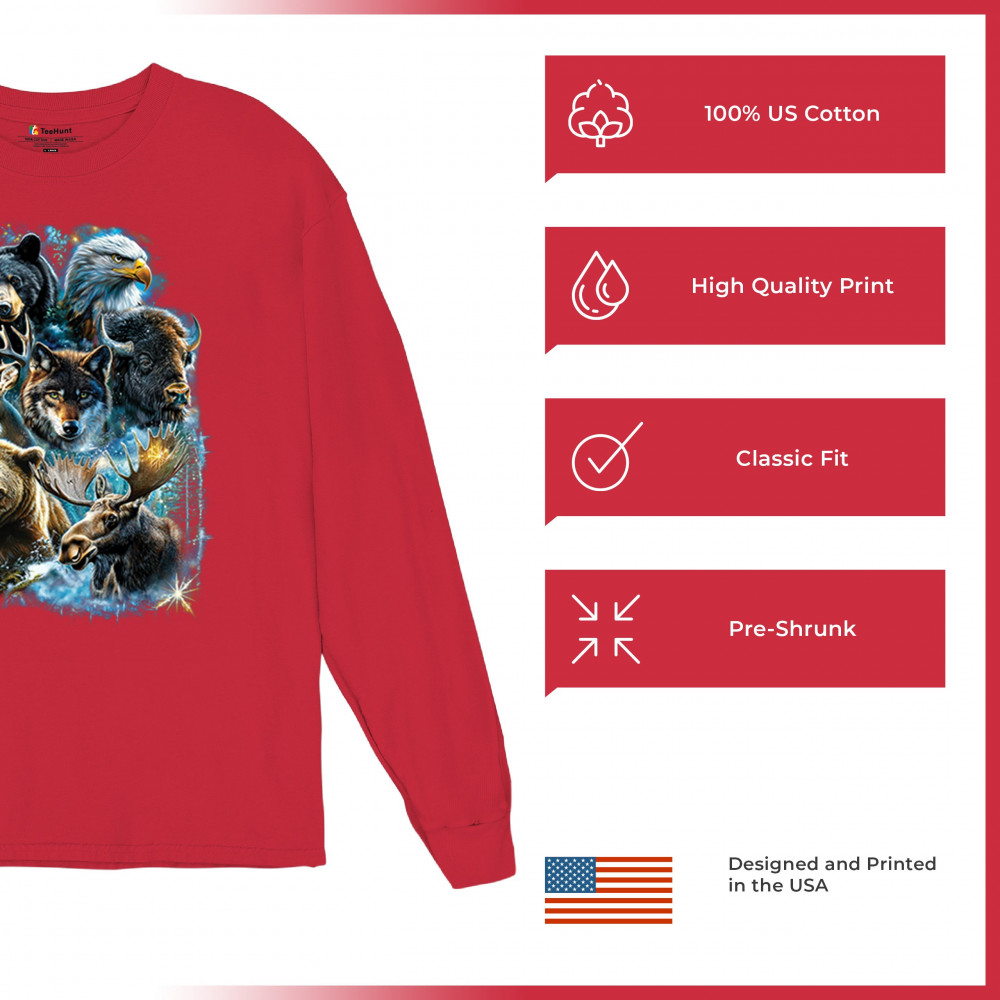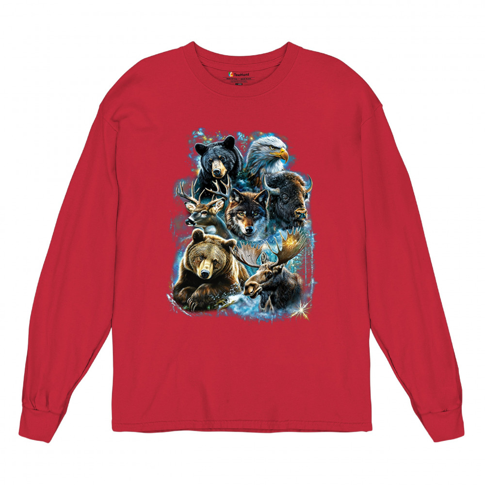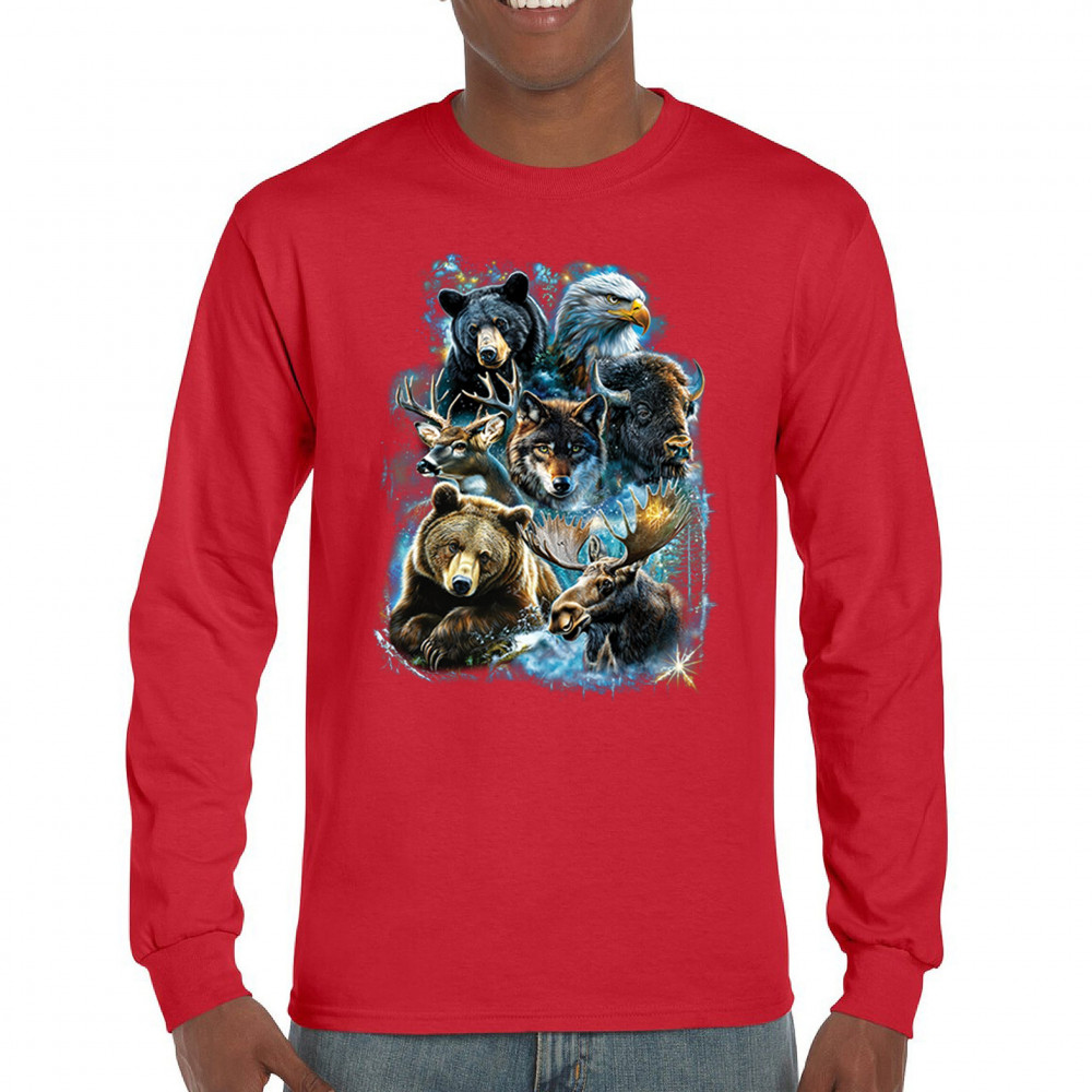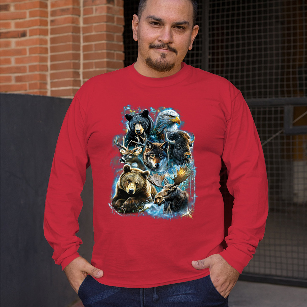 Wilderness design with moose, bear, eagle, bison, and wolf. A bold tribute to forest animals, nature strength, and rugged outdoor spirit.