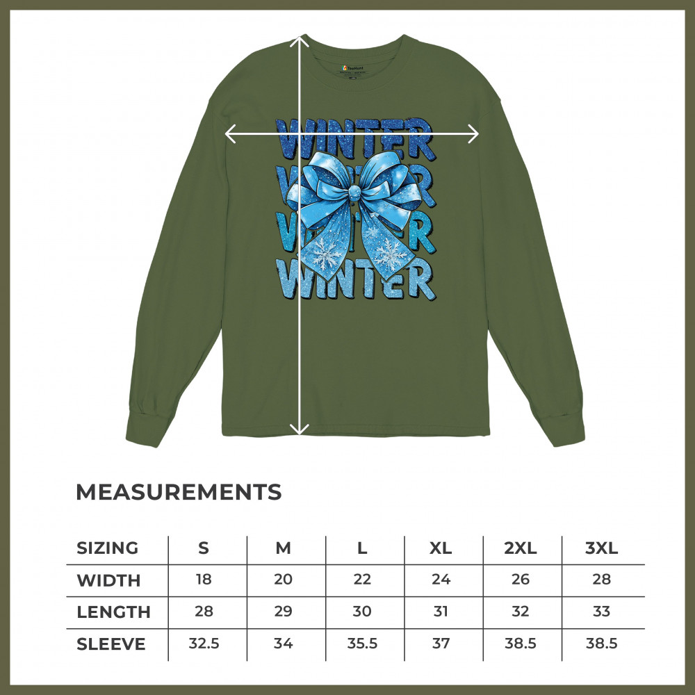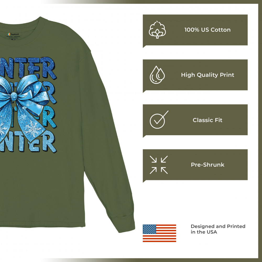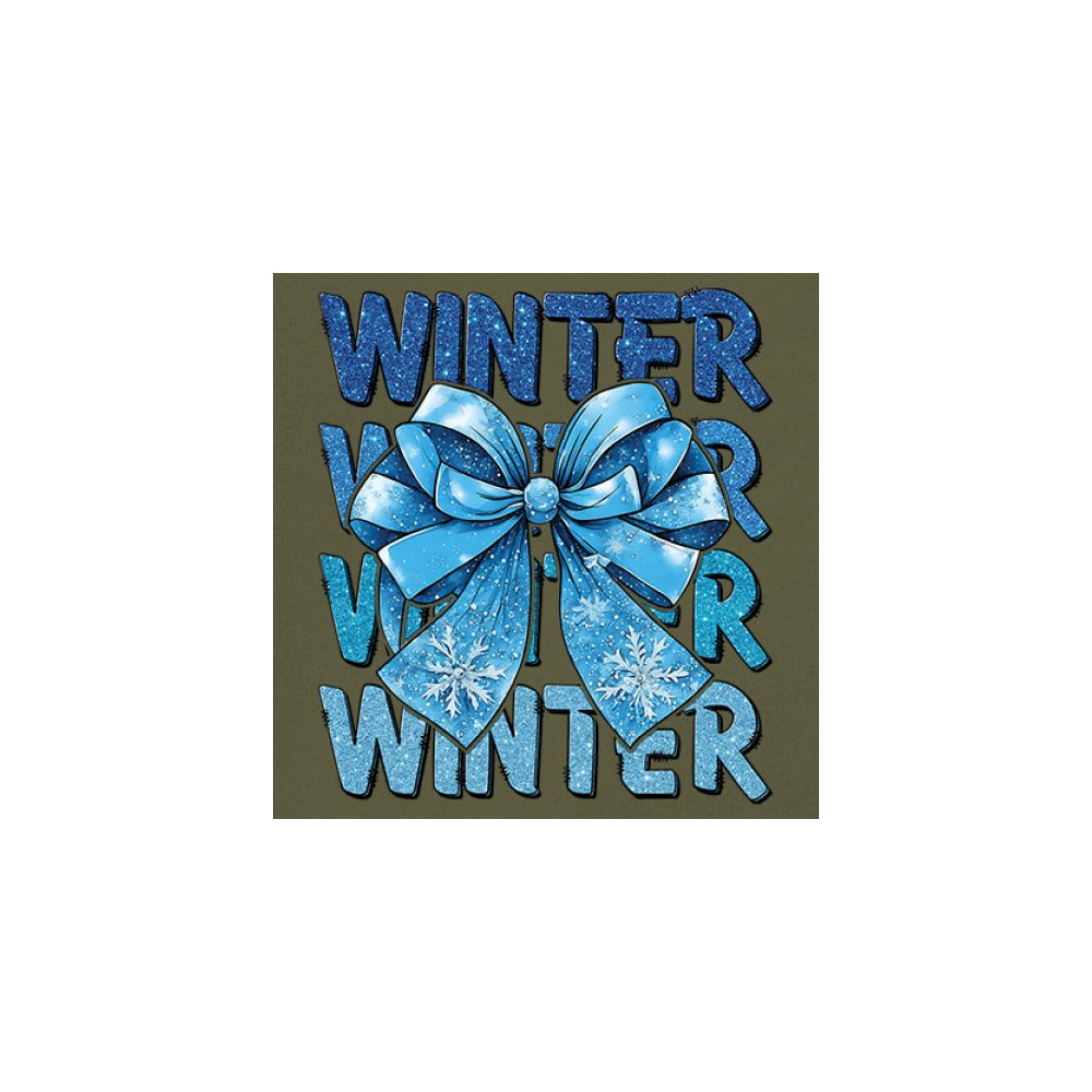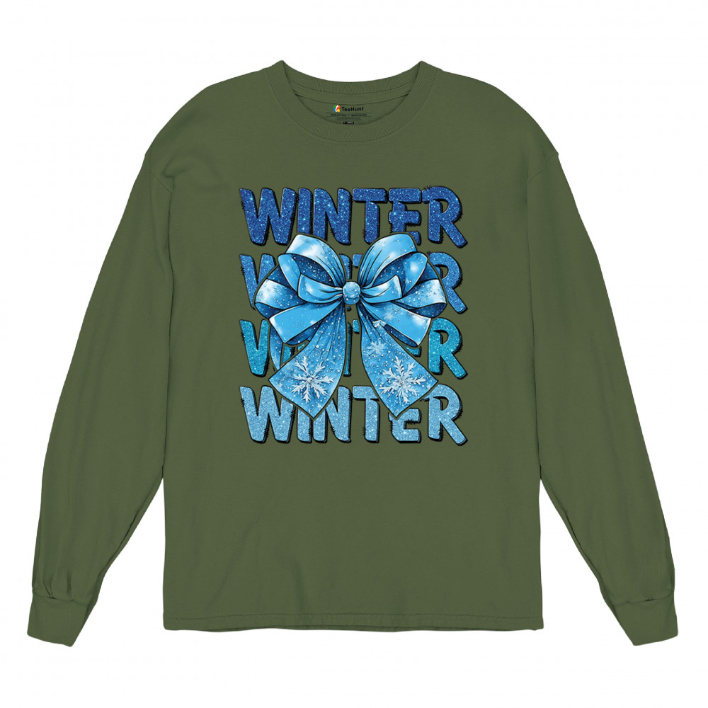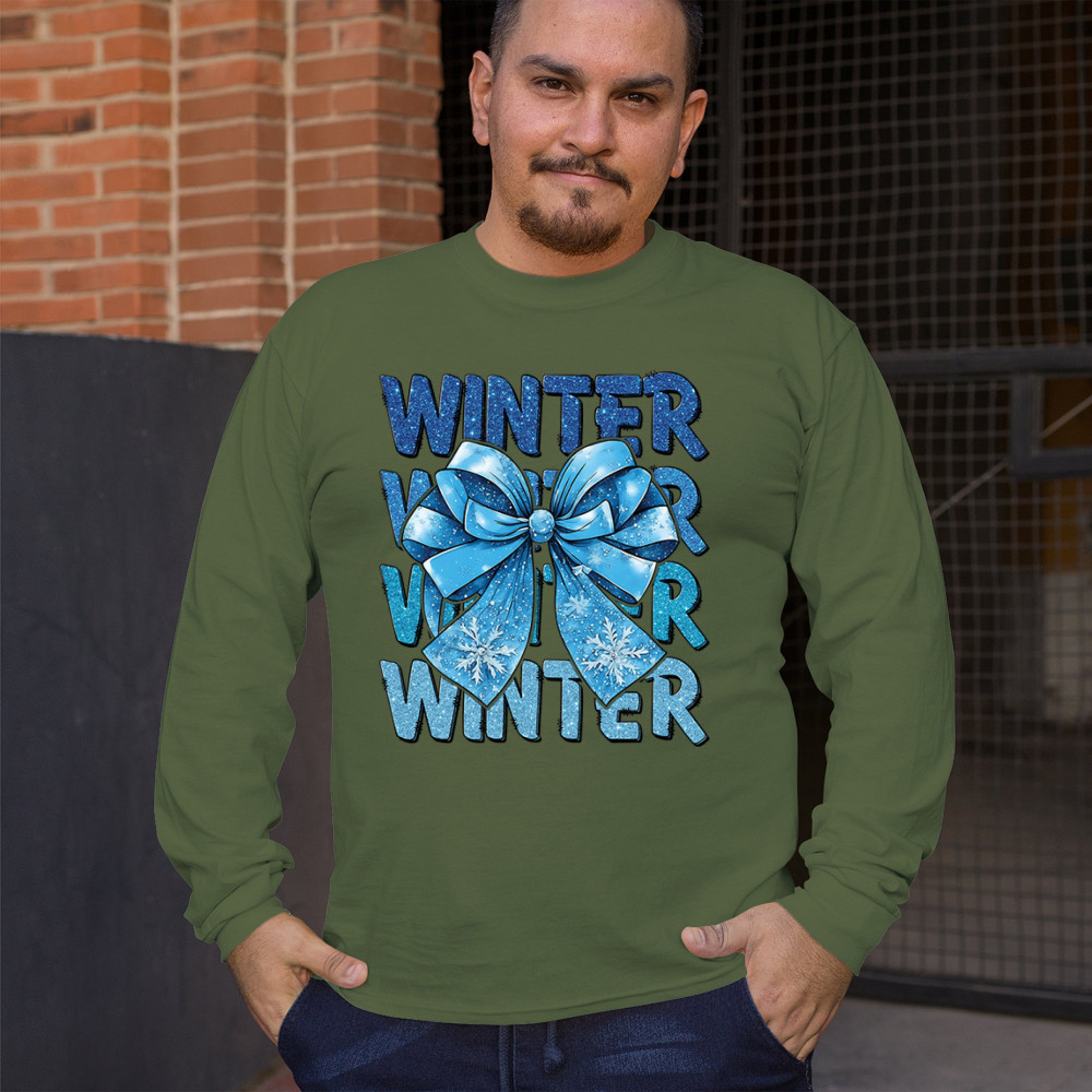 This shimmering winter bow design blends icy blue glitter style with bold repeating WINTER text for a bright seasonal statement. Snowflake accents and frosty tones create a cozy, cheerful vibe perfect for holiday outfits, gifting, or cold-weather lovers. A standout graphic that brings festive winter charm to any wardrobe and boosts seasonal search visibility.