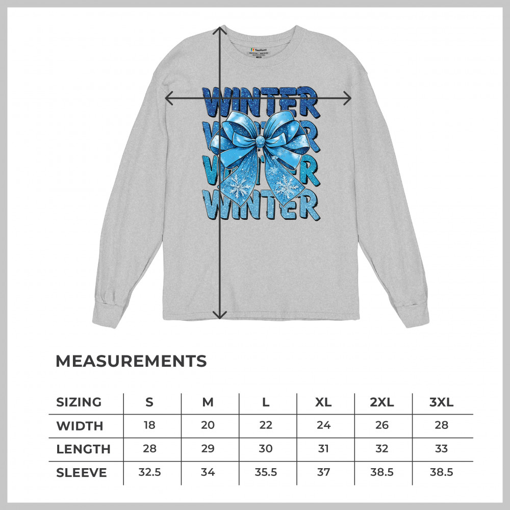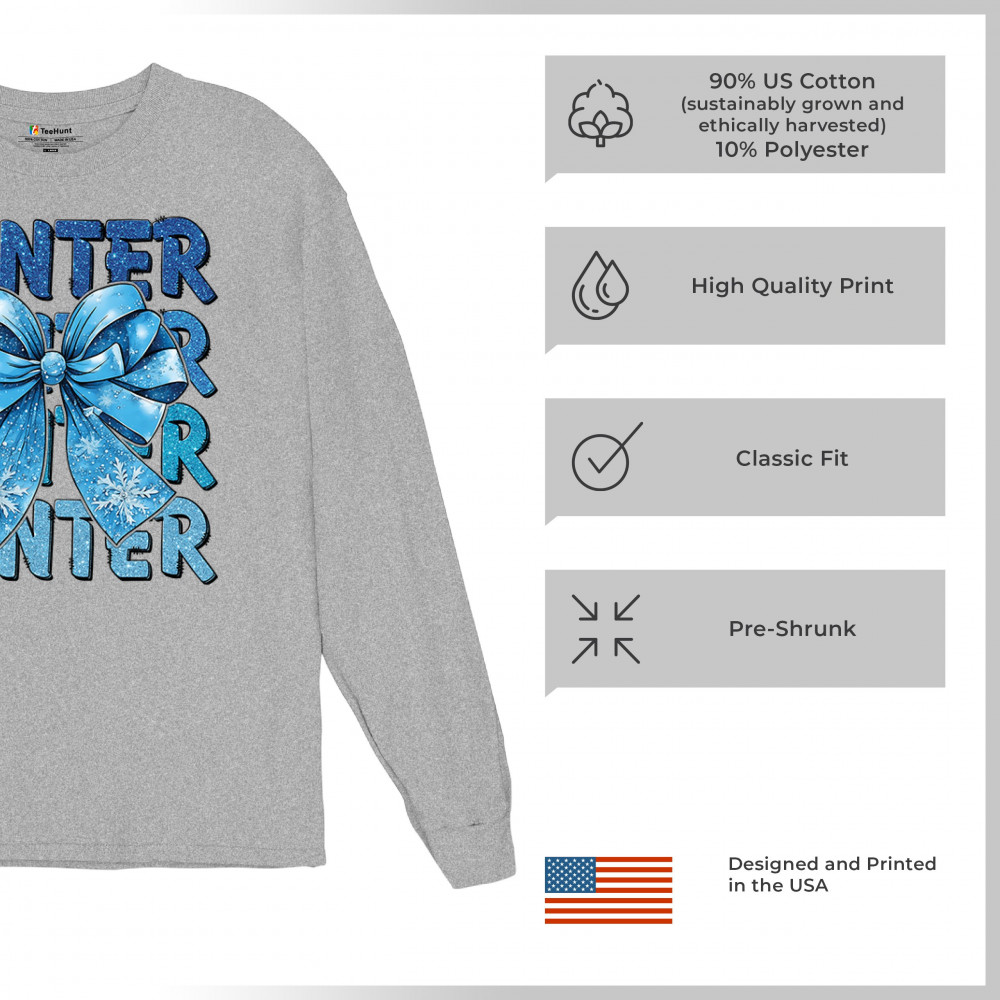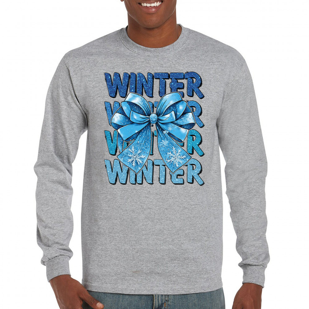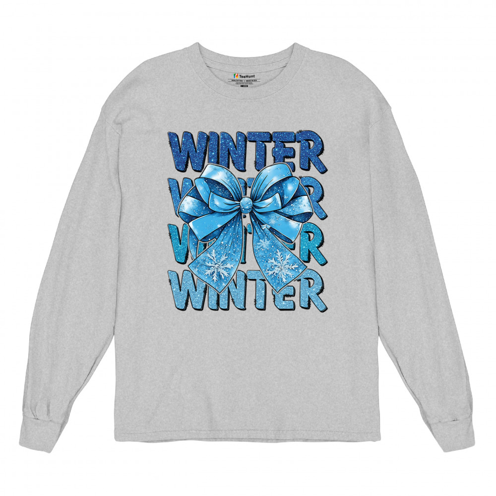 This shimmering winter bow design blends icy blue glitter style with bold repeating WINTER text for a bright seasonal statement. Snowflake accents and frosty tones create a cozy, cheerful vibe perfect for holiday outfits, gifting, or cold-weather lovers. A standout graphic that brings festive winter charm to any wardrobe and boosts seasonal search visibility.