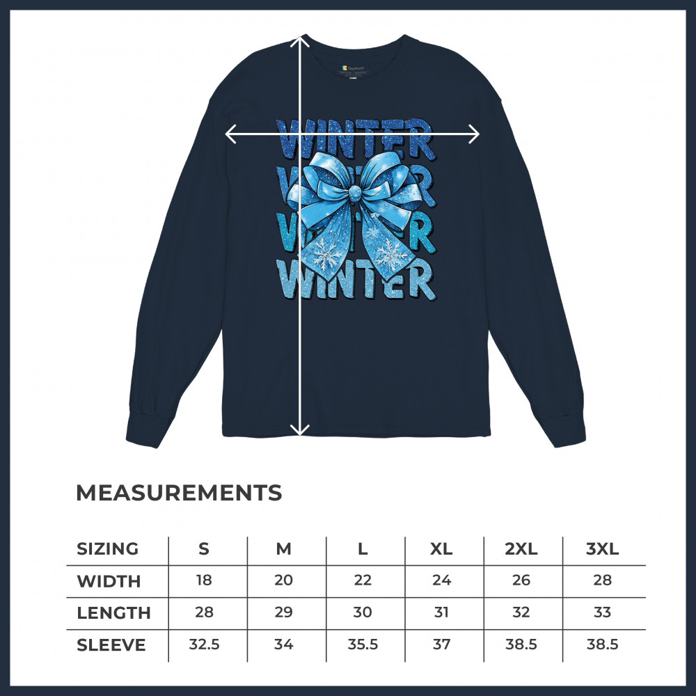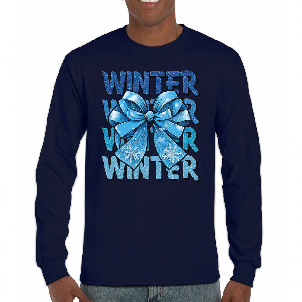 This shimmering winter bow design blends icy blue glitter style with bold repeating WINTER text for a bright seasonal statement. Snowflake accents and frosty tones create a cozy, cheerful vibe perfect for holiday outfits, gifting, or cold-weather lovers. A standout graphic that brings festive winter charm to any wardrobe and boosts seasonal search visibility.