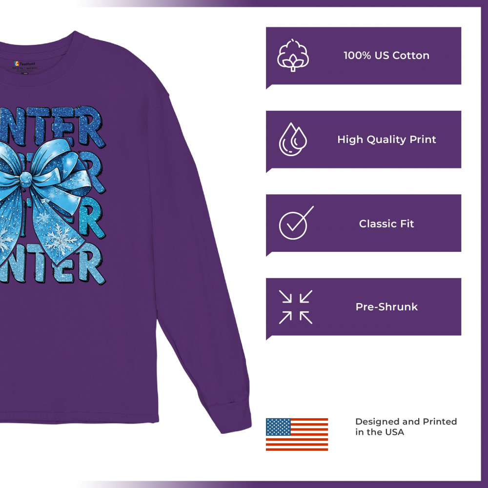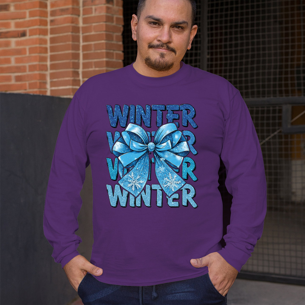 This shimmering winter bow design blends icy blue glitter style with bold repeating WINTER text for a bright seasonal statement. Snowflake accents and frosty tones create a cozy, cheerful vibe perfect for holiday outfits, gifting, or cold-weather lovers. A standout graphic that brings festive winter charm to any wardrobe and boosts seasonal search visibility.