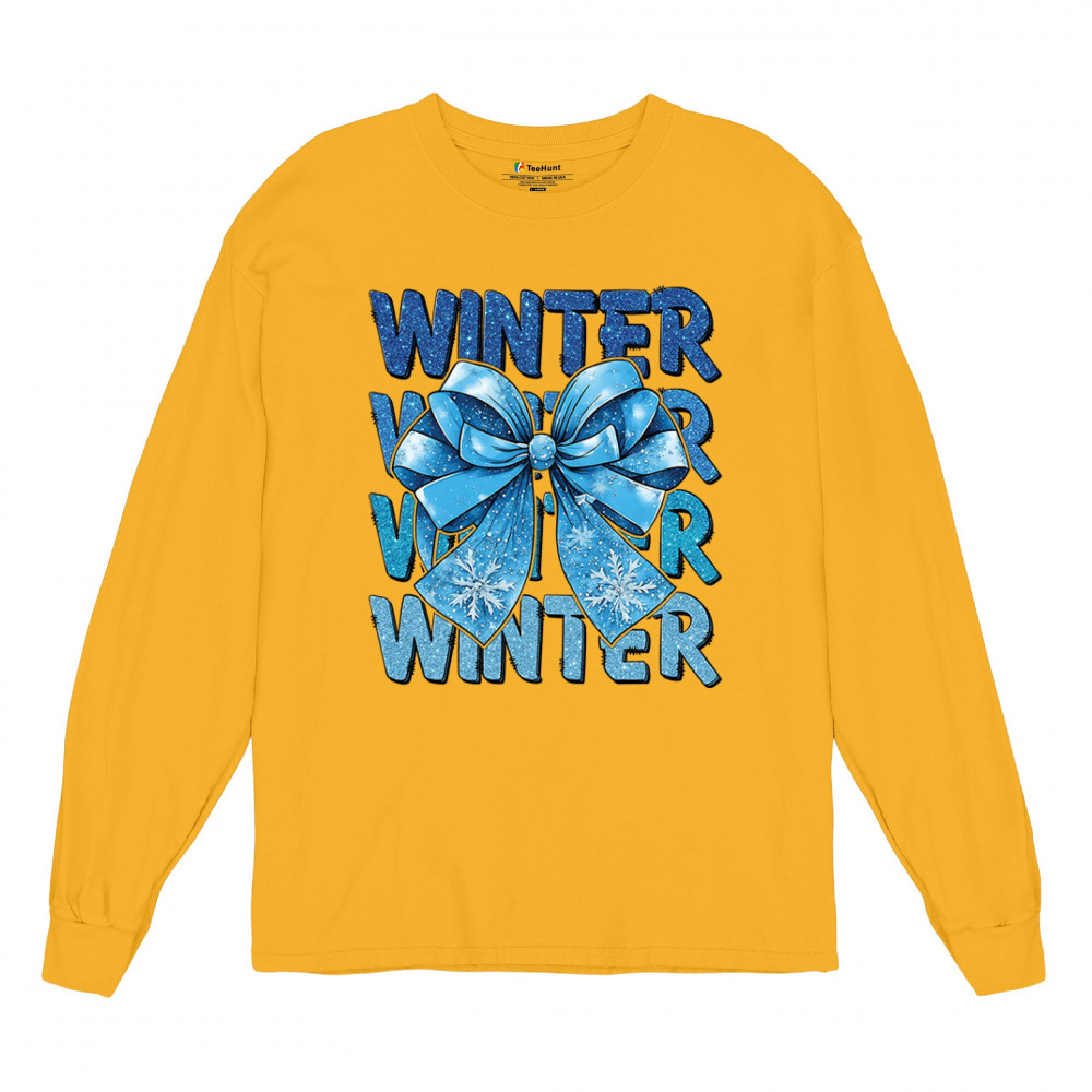 This shimmering winter bow design blends icy blue glitter style with bold repeating WINTER text for a bright seasonal statement. Snowflake accents and frosty tones create a cozy, cheerful vibe perfect for holiday outfits, gifting, or cold-weather lovers. A standout graphic that brings festive winter charm to any wardrobe and boosts seasonal search visibility.