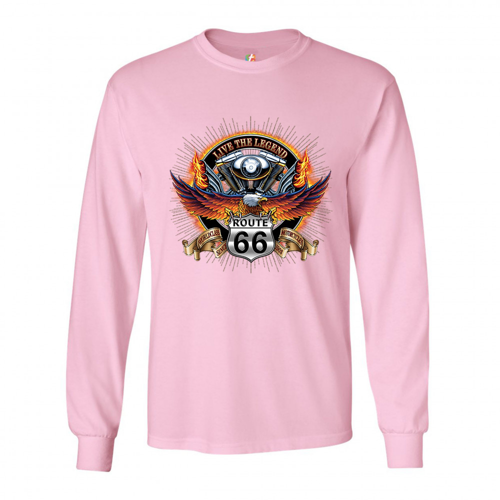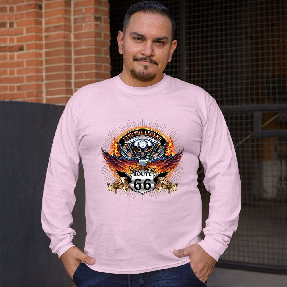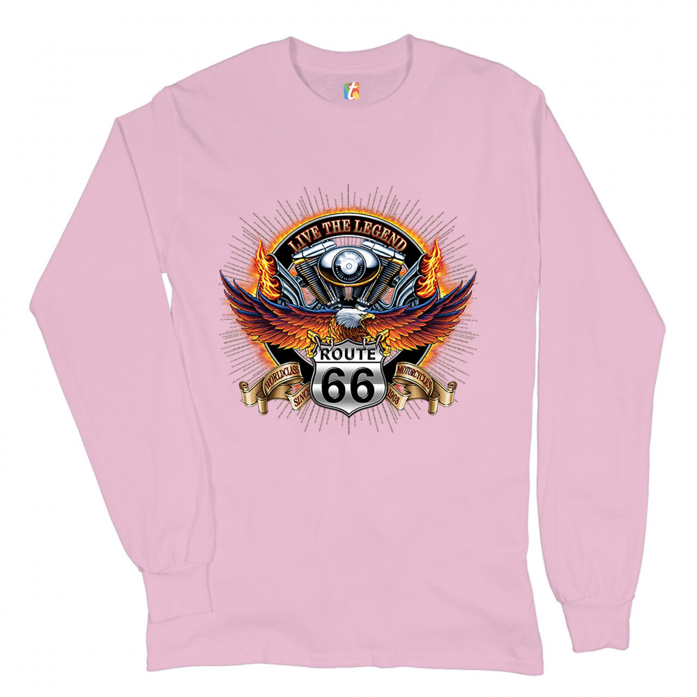 A print featuring an American bald eagle spreading it's wings while sitting on a "Route 66" sign. On a stripe behind the sign it says: "worldclass motorcycles since 1903". In the background there is a motorcycle engine with words: "live the legend" above